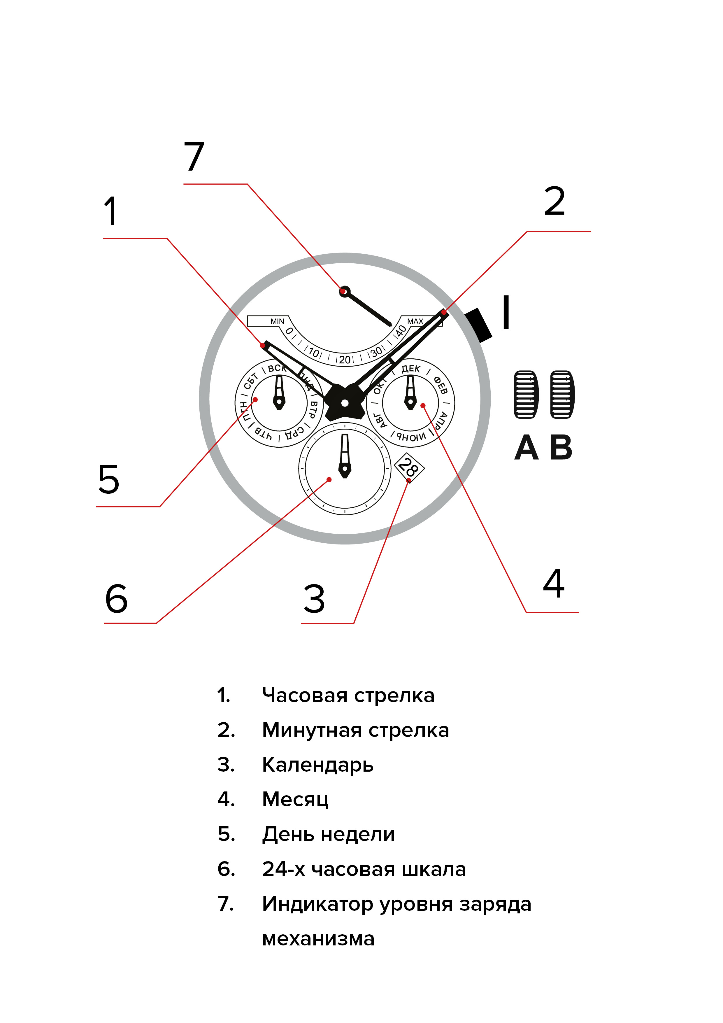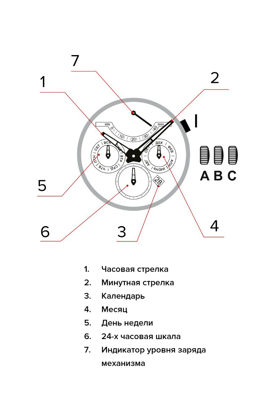 Для первоначального завода поверните заводную головку от себя столько раз, сколько потребуется для полного завода механизма в соответствии с индикатором завода механизма.