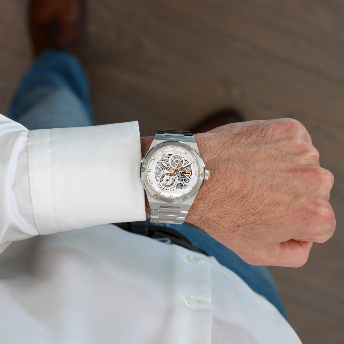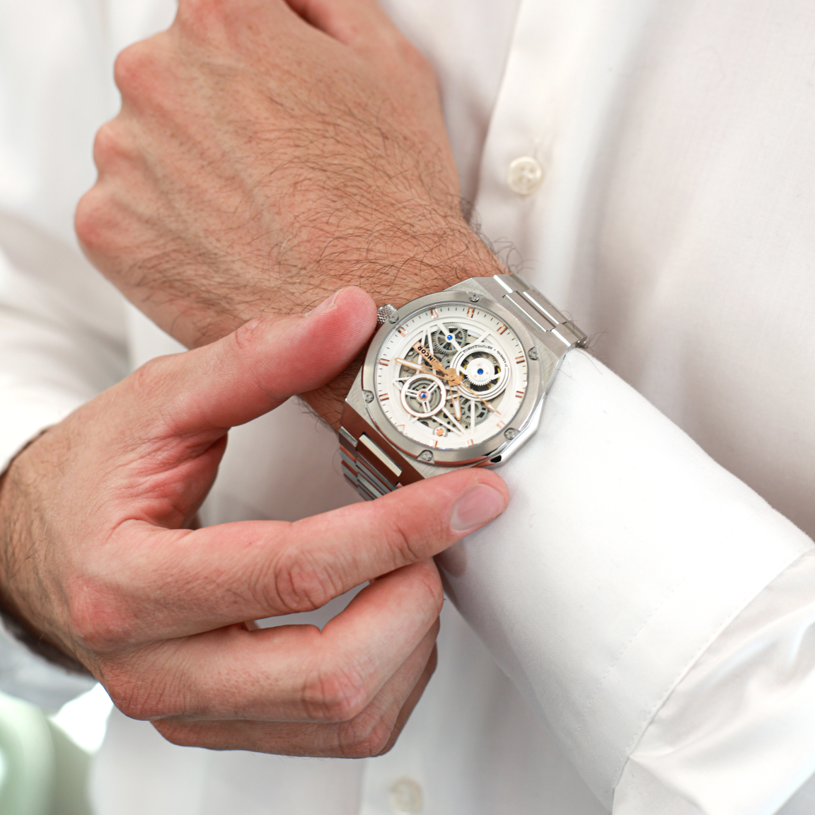 Мужские часы-скелетоны в брутальном 44 миллиметровом корпусе, декорированном винтами, завораживают работой надёжного японского механизма с функцией автоподзавода  Miyota 82S0, вид на который открывается сквозь прочное сапфировое стекло. На декорированном циферблате располагаются объёмные часовые индексы, на которые, как и на заострённые стрелки, нанесено люминесцентное покрытие. Стальной браслет оснащён удобной застёжкой-бабочкой.