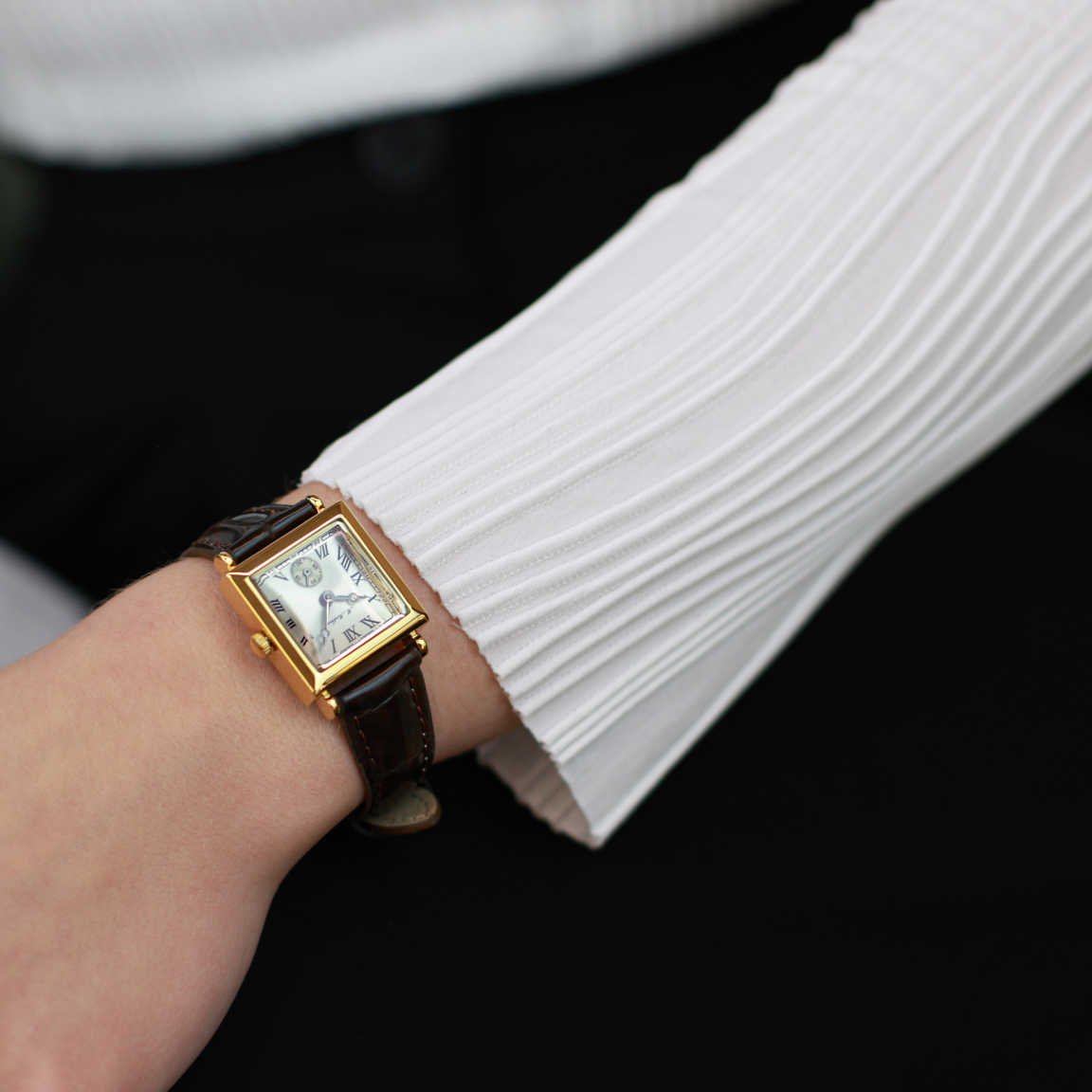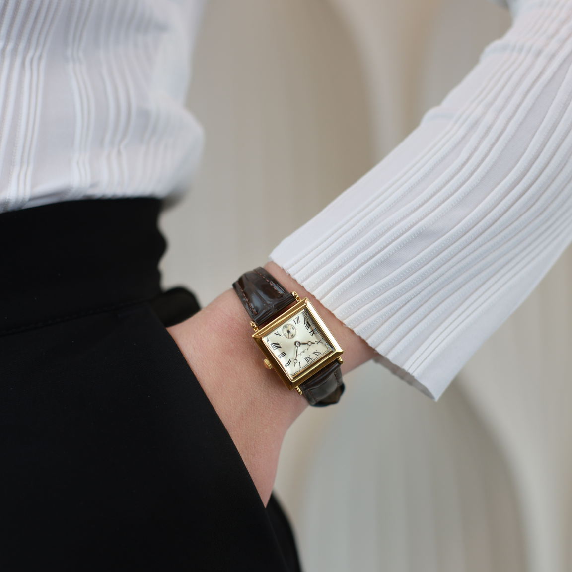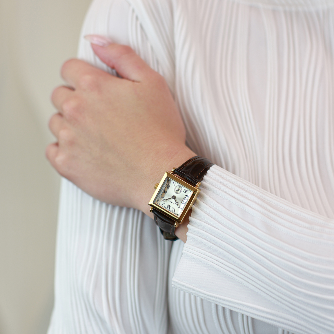 Утонченные женские часы с квадратным корпусом 25 мм — воплощение сдержанной элегантности. Минеральное закаленное стекло с выпуклой формой и скошенными гранями придает циферблату благородный блеск, а водозащита 3 АТМ делает их практичными в повседневной носке. Циферблат с римской оцифровкой и ремешок из натуральной кожи подчеркивают классический стиль.