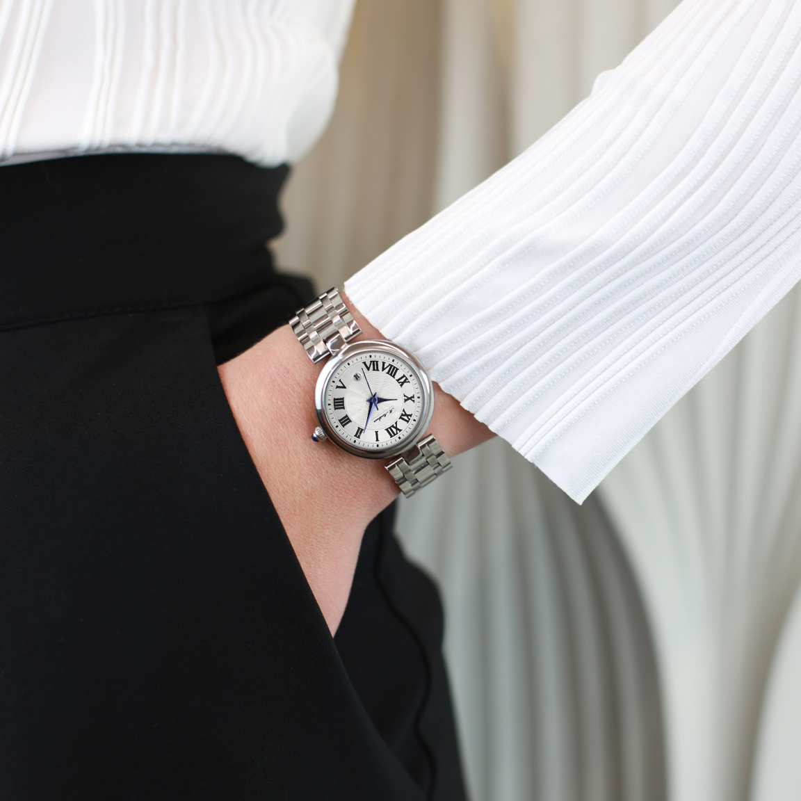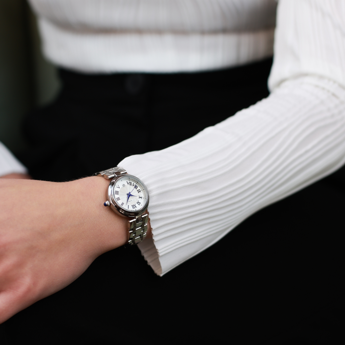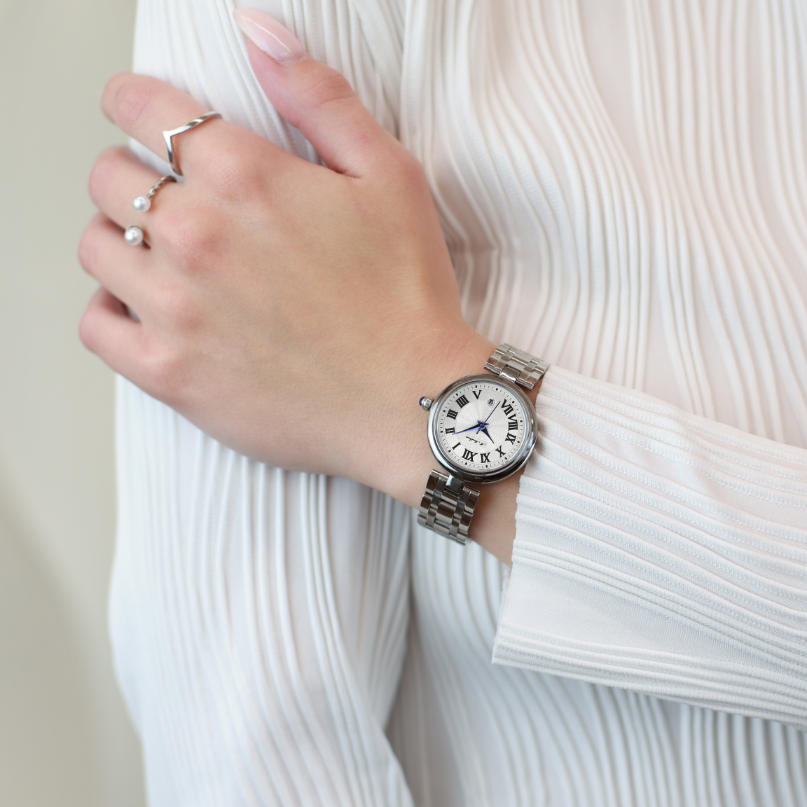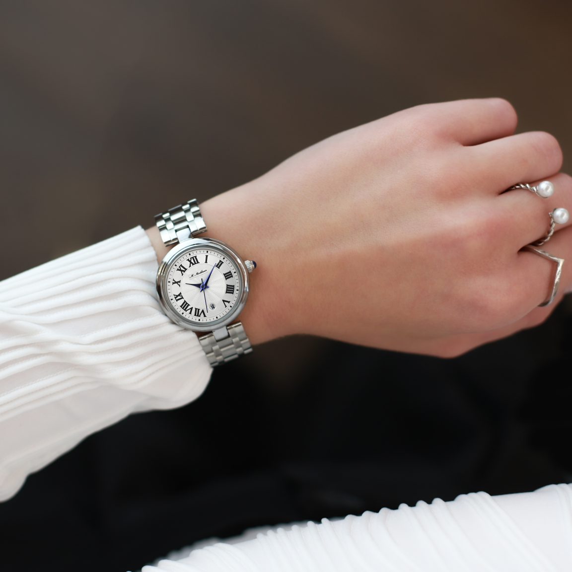 Элегантные женские часы с корпусом 30 мм сочетают в себе утонченный стиль и современную функциональность. За защиту циферблата отвечает минеральное закаленное стекло, а водонепроницаемость 3 АТМ позволяет не снимать часы в повседневных ситуациях. В основе — японский кварцевый механизм, гарантирующий точность хода. Циферблат с римской оцифровкой и окошком календаря добавляет классической строгости, а стальной браслет завершает образ, подчеркивая статусность и долговечность аксессуара.
