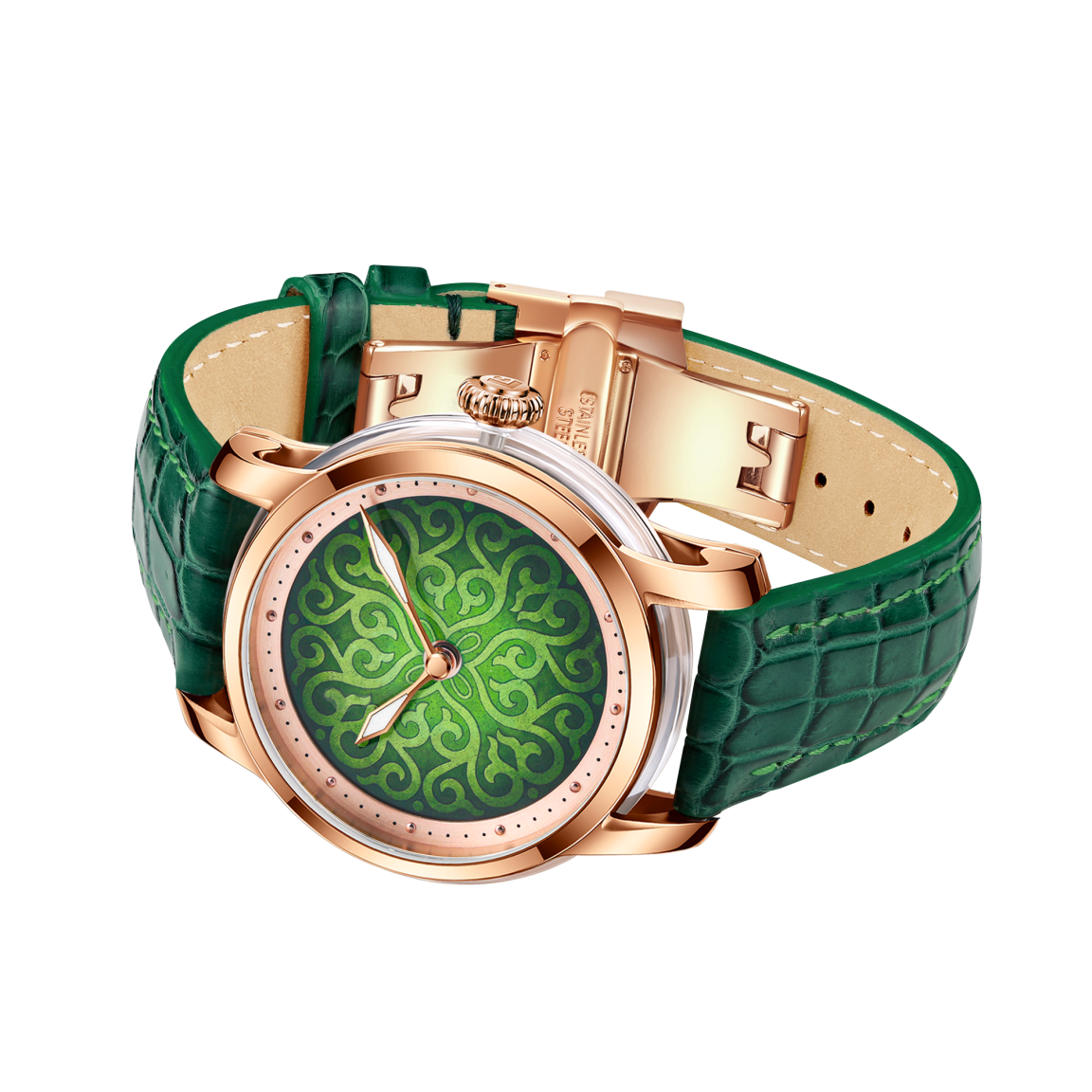 Для циферблата часов, выполненного в технике горячей эмали по низкому рельефу, выбраны оттенки бирюзы, преобладающие в китайских эмалях 16-19 веков. 37-мм корпус из стали украшен по кругу сапфировой вставкой. Прозрачная задняя крышка позволяет наблюдать за работой автоматического премиального калибра Miyota 90S5.