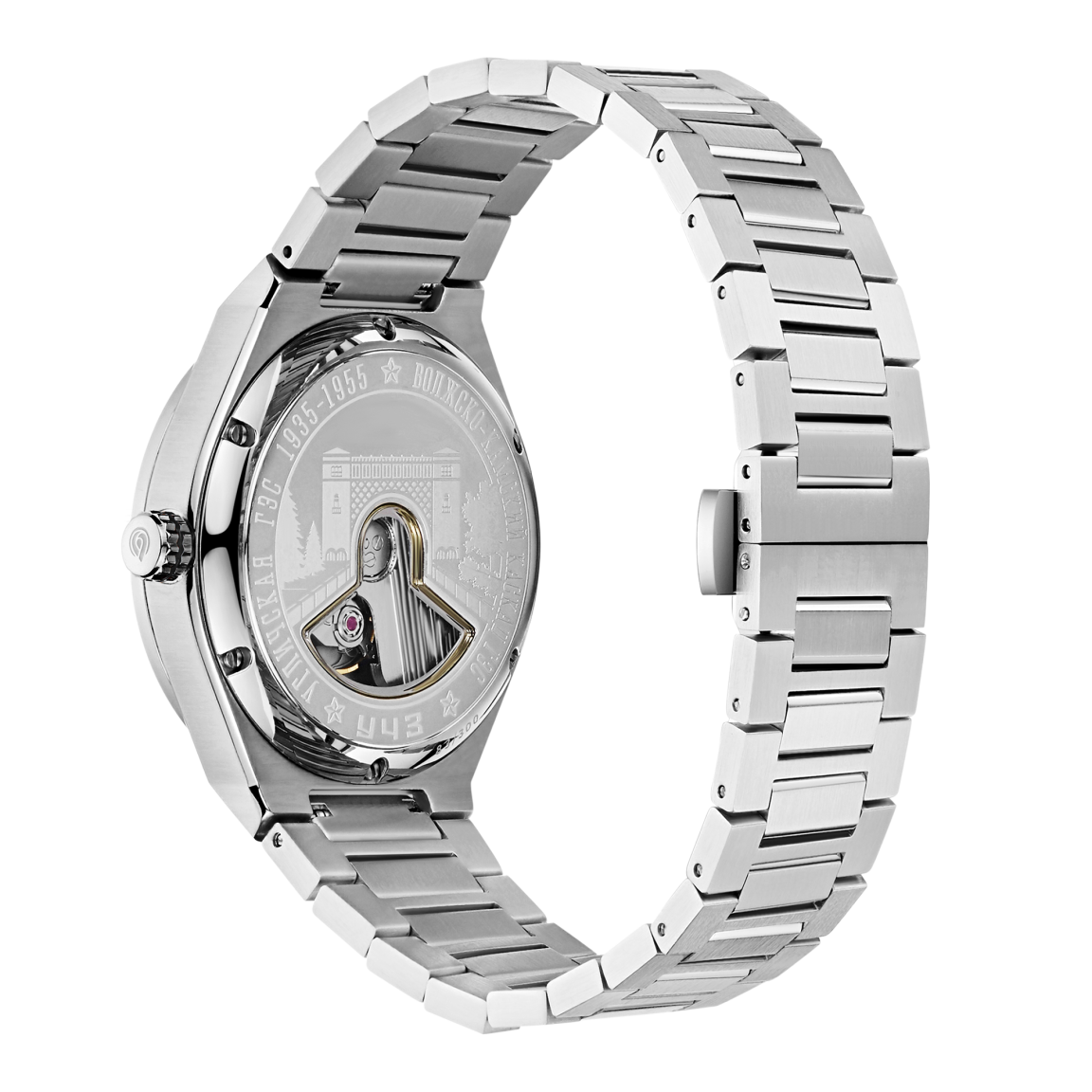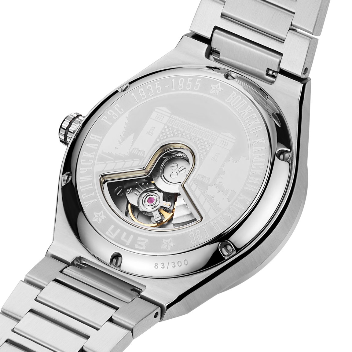 Задняя крышка часов украшена гравировкой с изображением шлюза ГЭС, сквозь прозрачную арку которого можно наблюдать за работой высокоточного механизма Miyota 9015 с автоподзаводом и запасом хода 42 часа.