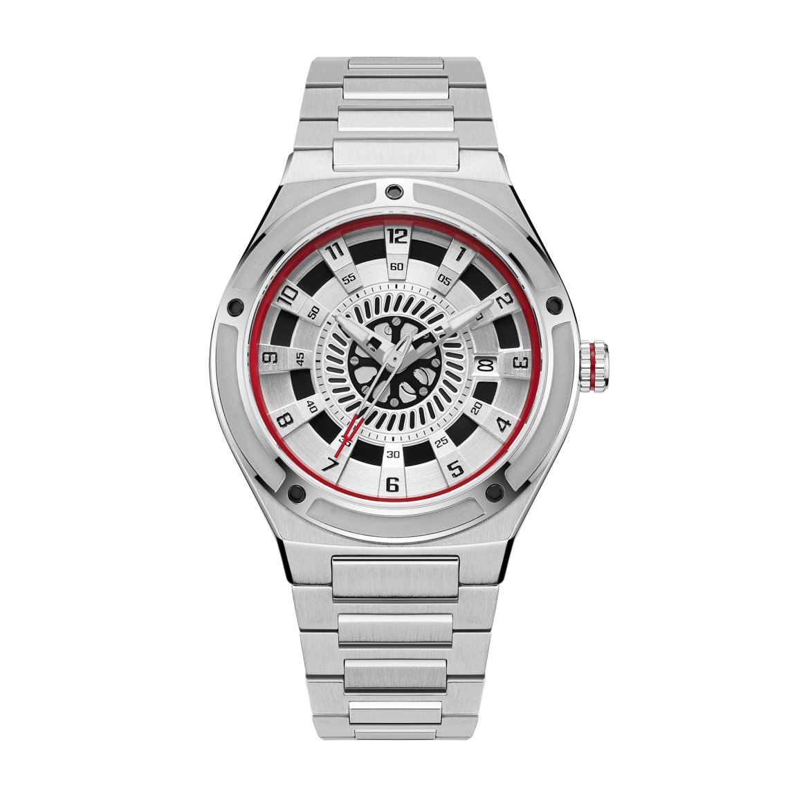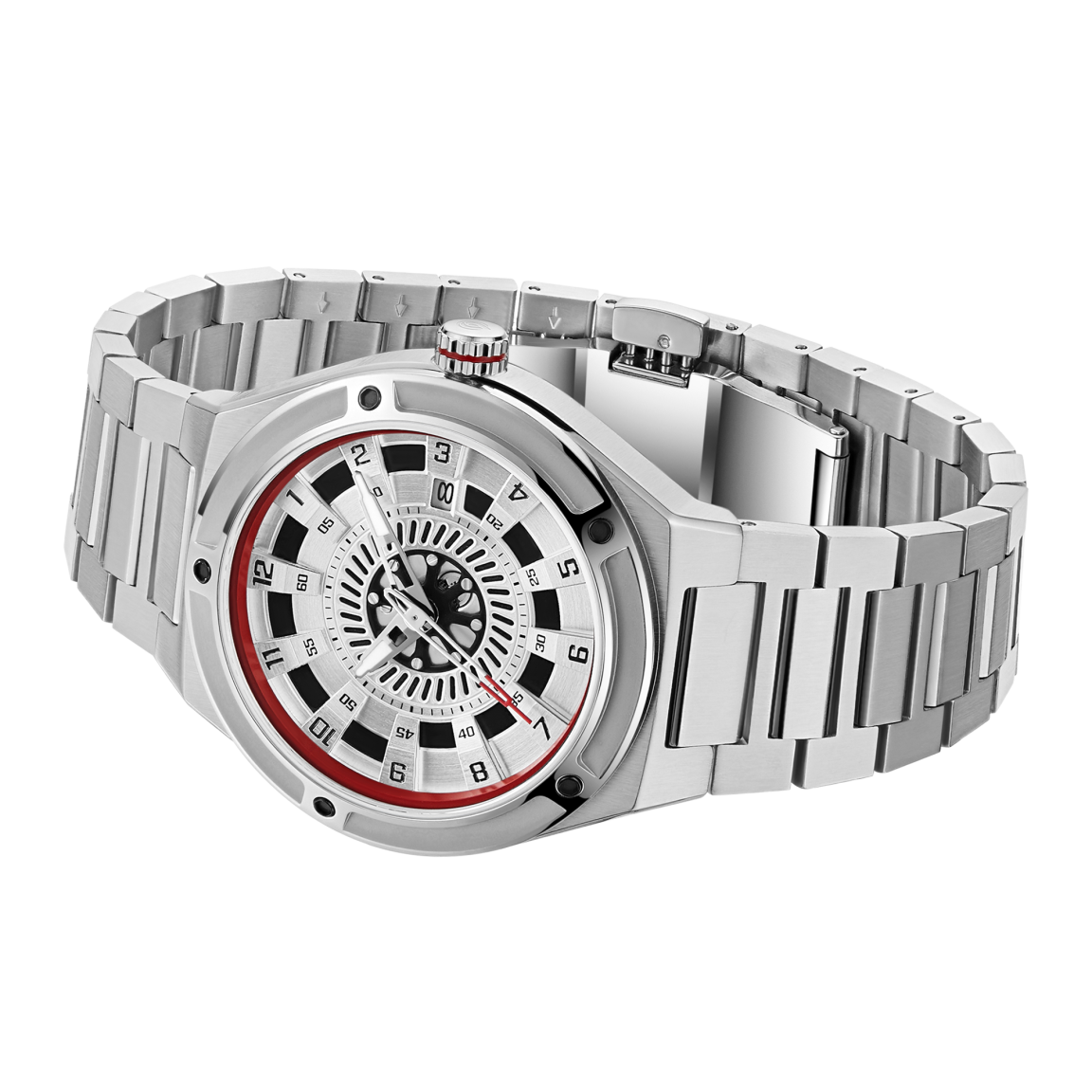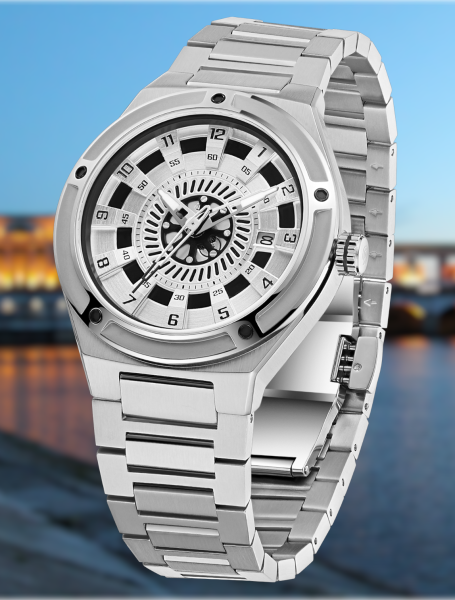 Дизайн циферблата, защищенного сапфировым стеклом с антибликовым покрытием вдохновлен очертаниями гидротурбин и внутреннего устройство машзала. Сочетание матовой и полированной стали 316L корпуса размером 42×48,5 мм отражают брутальный характер индустриального стиля. Водозащита 10 ATM позволяет использовать часы под водой, а светящиеся в темноте стрелки с покрытием Swiss Super-LumiNova напоминают потоки электрической энергии.