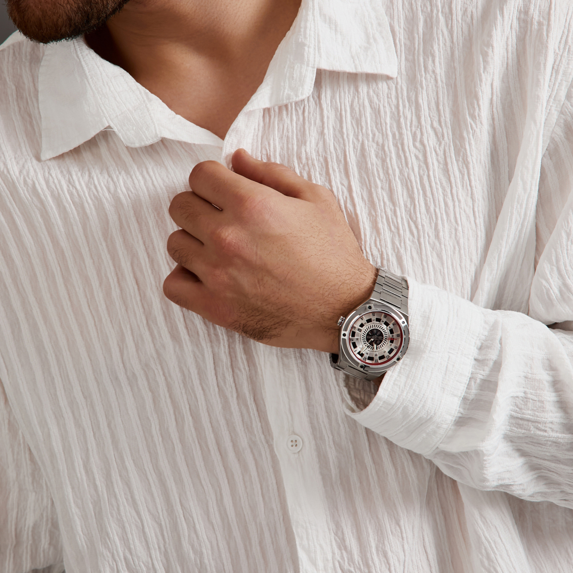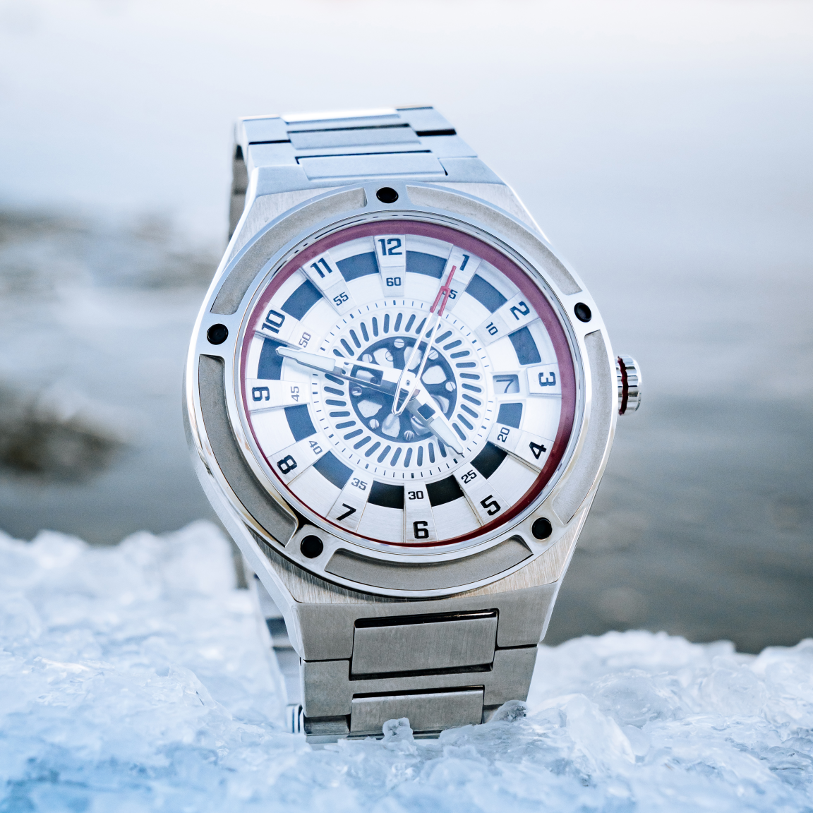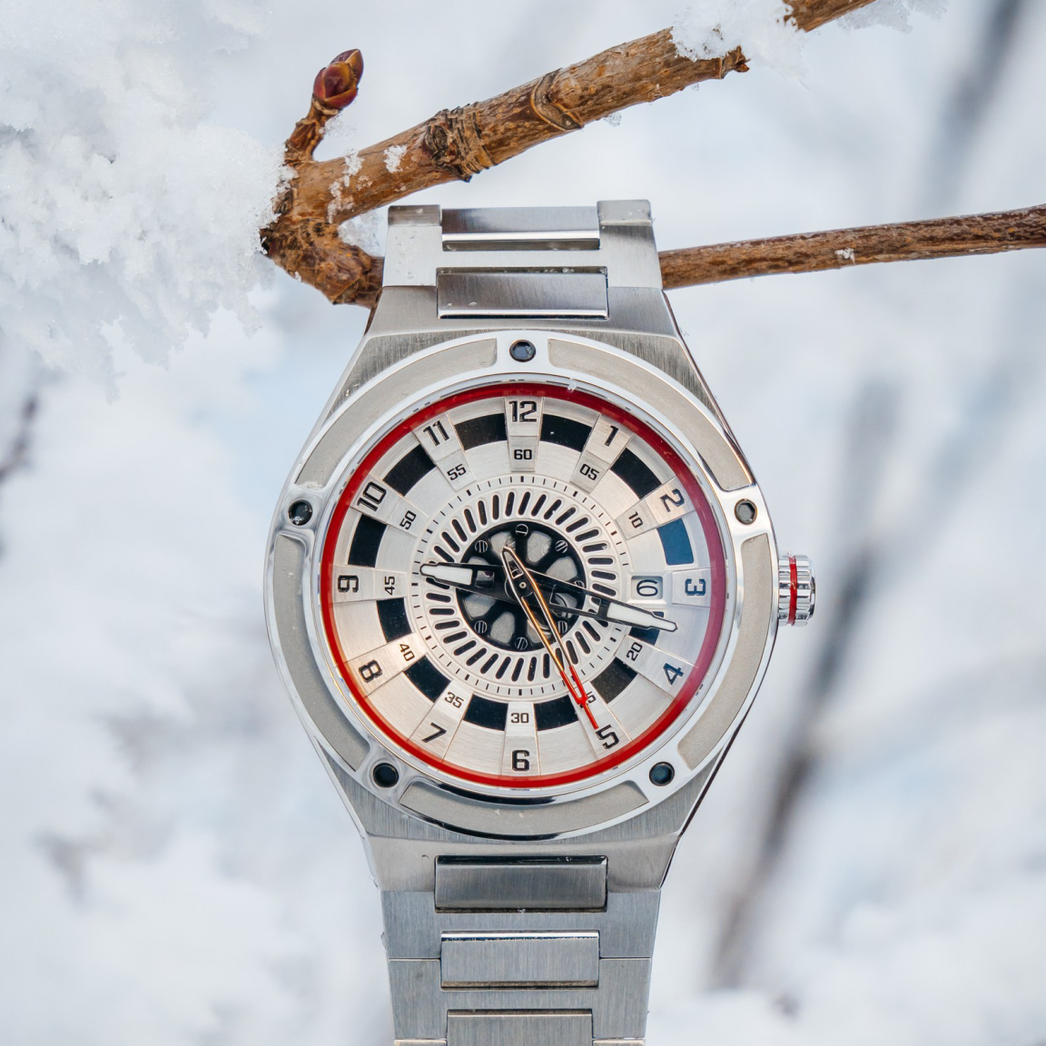 Дизайн циферблата, защищенного сапфировым стеклом с антибликовым покрытием вдохновлен очертаниями гидротурбин и внутреннего устройство машзала. Сочетание матовой и полированной стали 316L корпуса размером 42×48,5 мм отражают брутальный характер индустриального стиля. Водозащита 10 ATM позволяет использовать часы под водой, а светящиеся в темноте стрелки с покрытием Swiss Super-LumiNova напоминают потоки электрической энергии.