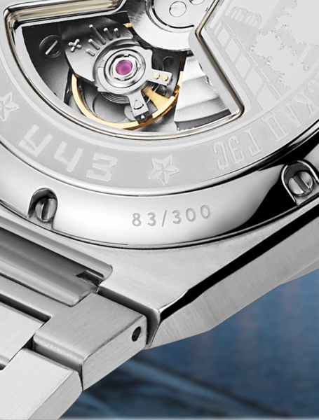 Задняя крышка часов украшена гравировкой с изображением шлюза, сквозь прозрачную арку которого можно наблюдать за работой высокоточного механизма Miyota 9015 с автоподзаводом и запасом хода 42 часа.