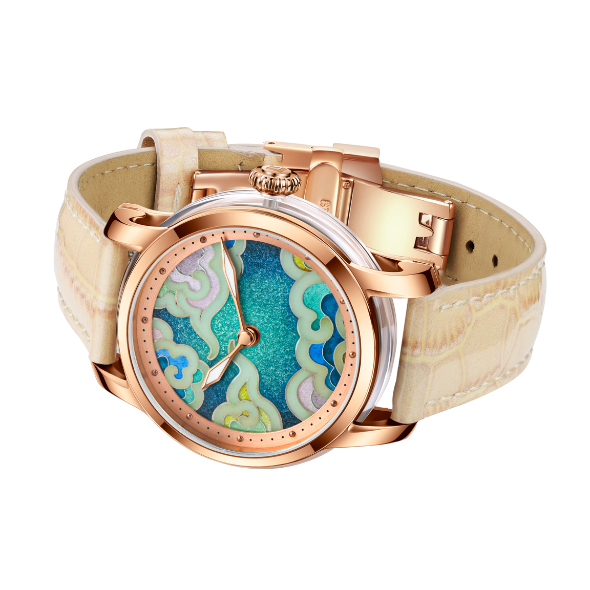 Цвета символичны: нефритово-зеленый и бирюзовый — вода и гармония, лазурно-синий и кобальтовый — небо и мудрость, белый — чистота и божественный свет. Отполированная поверхность циферблата напоминает зеркальную гладь озера, отражающего небо.