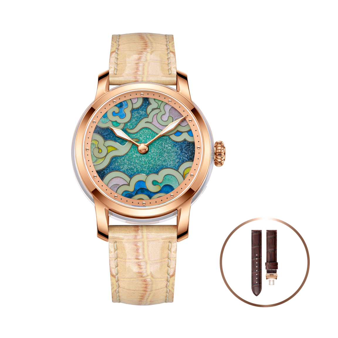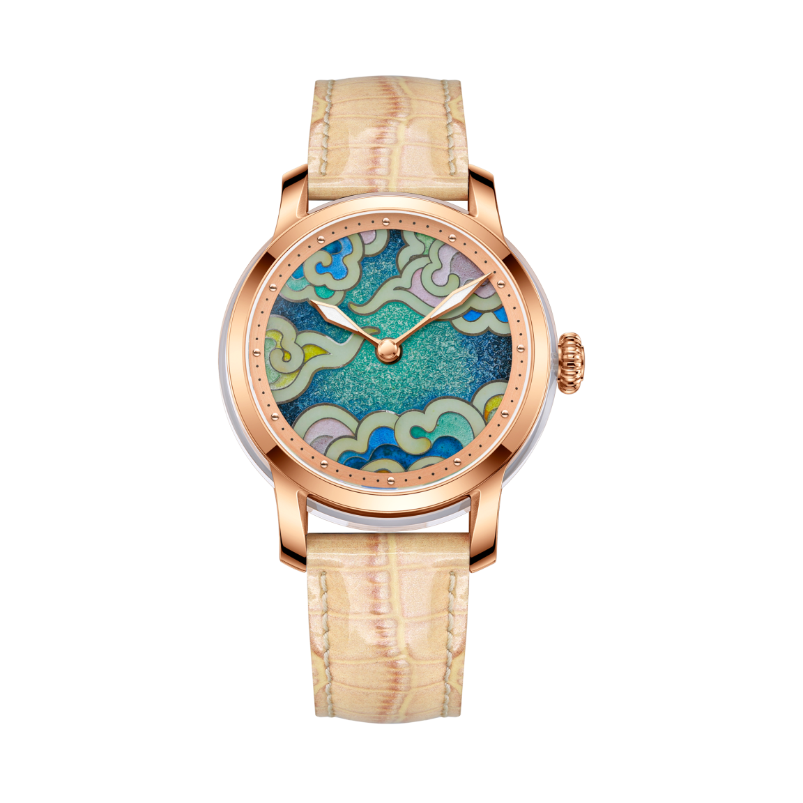 Наручные часы «Небесное Предзнаменование» — воплощение небесной гармонии и вечного движения энергии Ци. На циферблате изображены танцующие облака — священные знамения и символы счастья, урожая и жизни, выполненные узором «юньвэнь», отражающим вечное движение и превращение энергии.