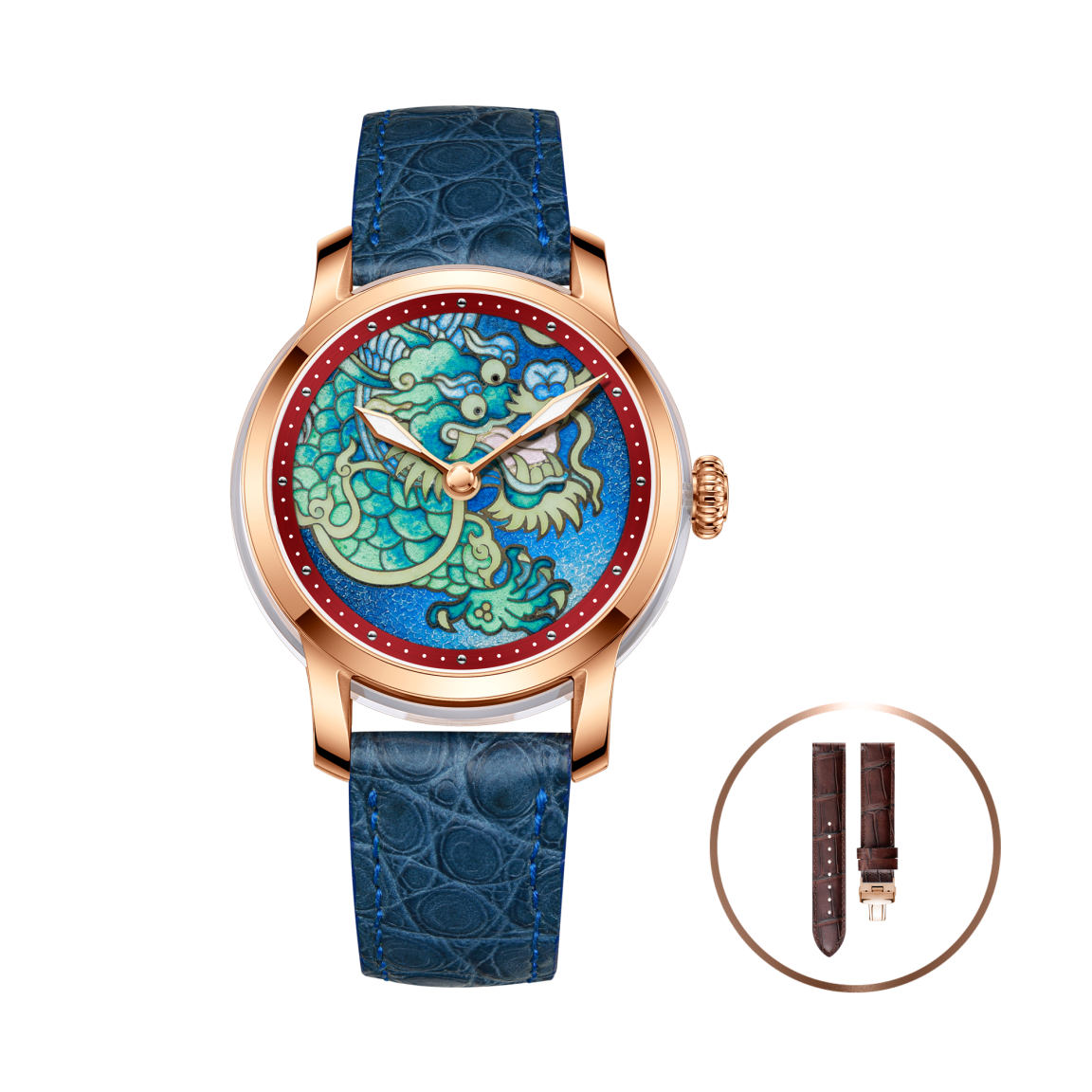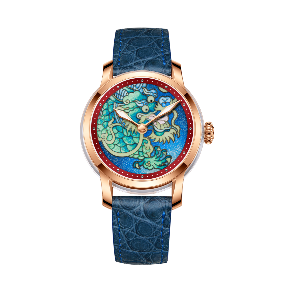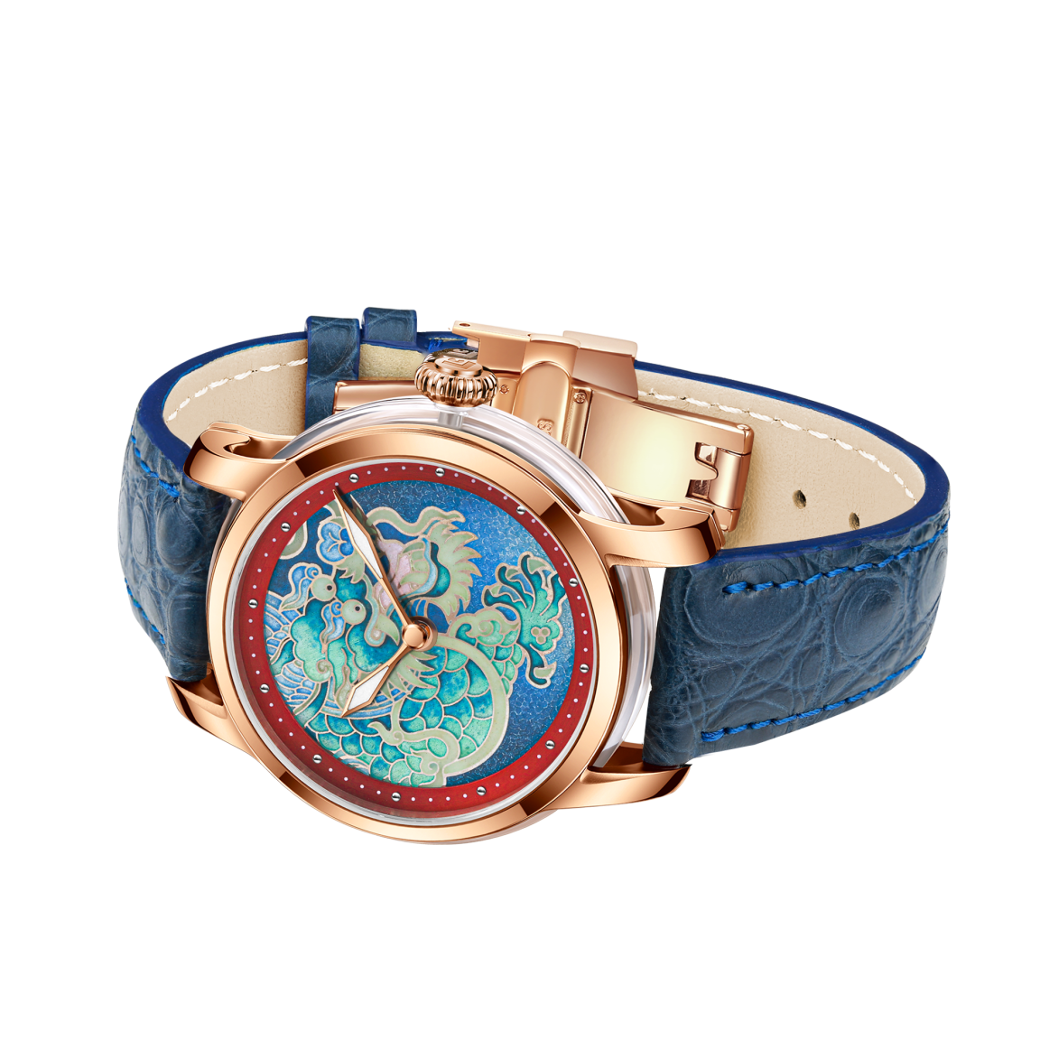 Часы «Небесный Дракон» воплощают императорскую мощь Китая. Китайский Дракон (Лун) — символ янской энергии, императорской власти, мудрости, удачи и гармонии, повелитель вод и посредник между небом и землей, его изображение было привилегией императора.Циферблат раскрывает древний миф: Лун парит среди облаков и волн, его образ создан согласно классической иконографии — тело змеи, чешуя карпа, когти орла, грива льва и голова верблюда. Сине-зеленые и кобальтовые оттенки отражают императорскую эстетику и космическую мощь.