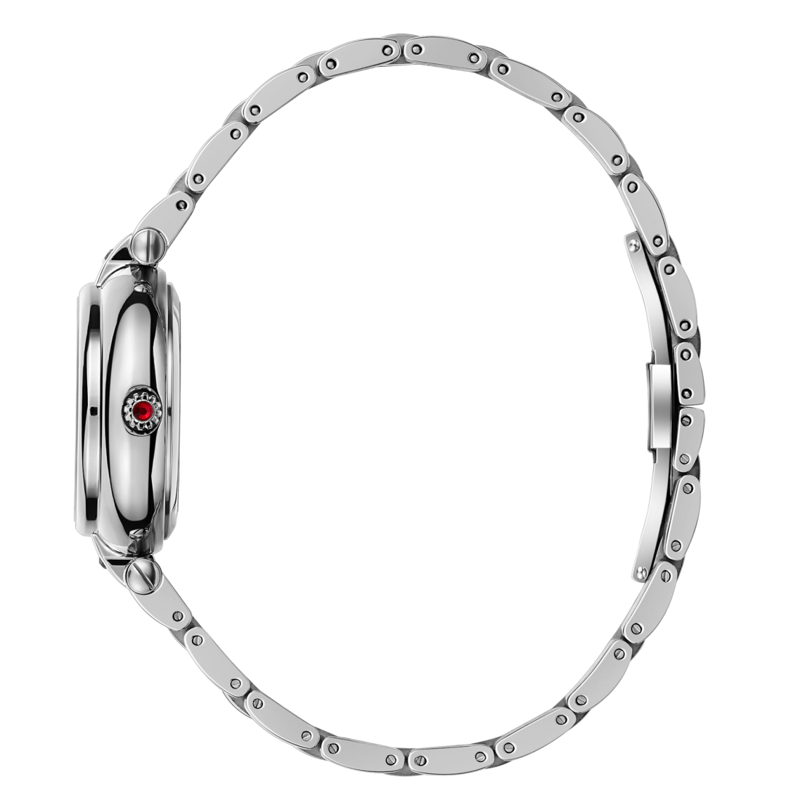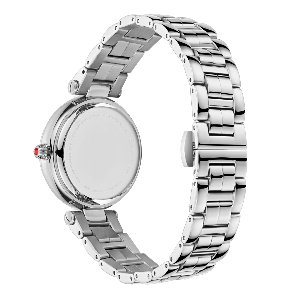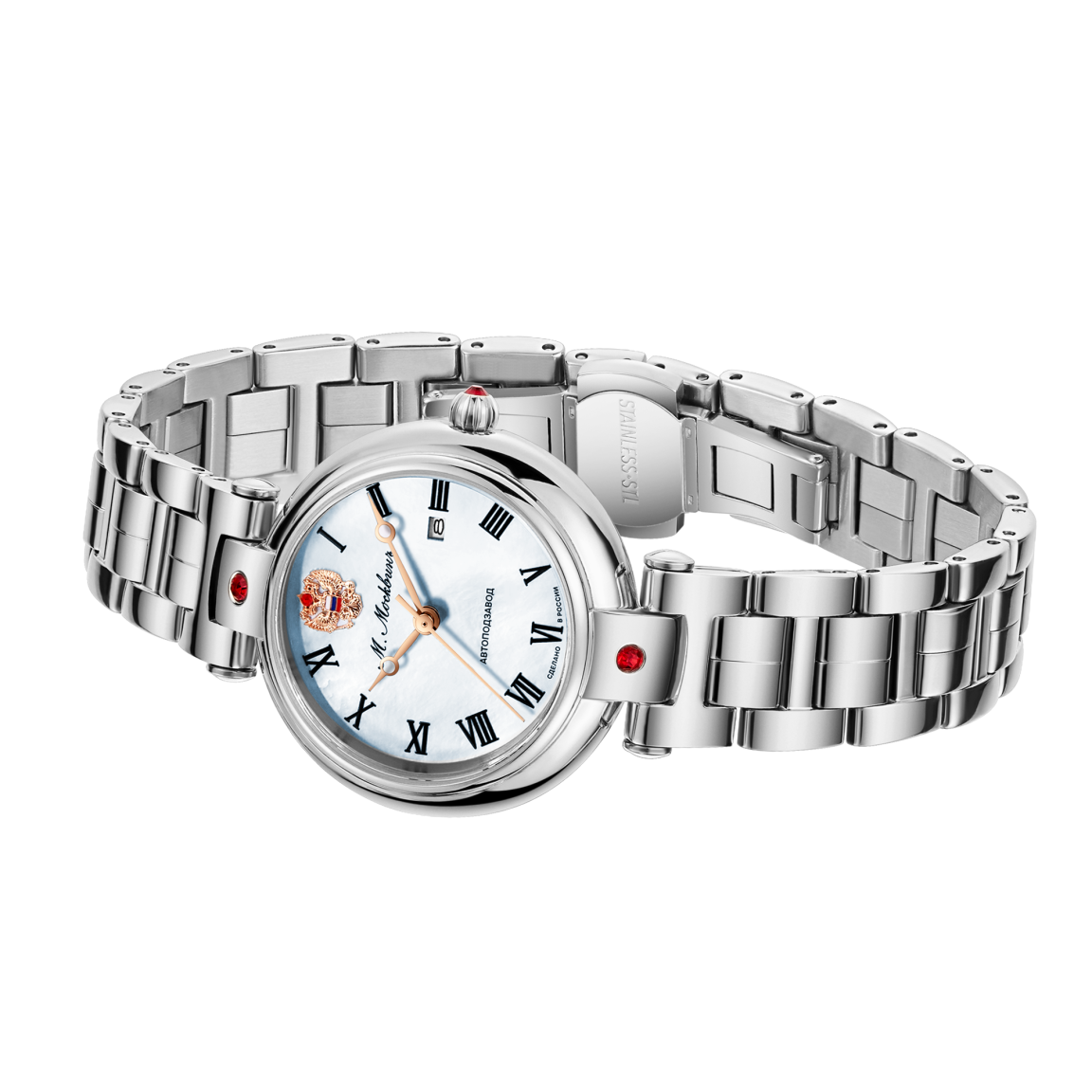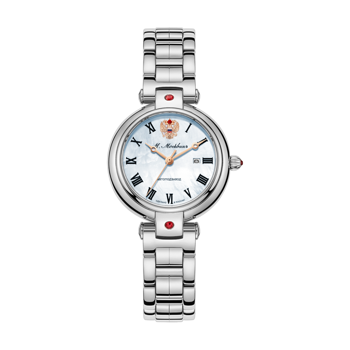 Женские наручные часы в классическом стиле, воплощающие элегантность и утонченность в каждом элементе. Изящный круглый корпус диаметром 31,5 мм выполнен из высококачественной нержавеющей стали и оснащён оригинальным Т-образным дужковым креплением ремешка, украшенным искрящимся красным акцентным фианитом. Перламутровый циферблат с чеканным знаком в виде Герба Российской Федерации на отметке 12 часов, римские цифры, выполненные техникой объёмной печати, и стрелки в стиле «бреге» подчёркивают классический дизайн и внимательность к деталям. Часы оснащены сапфировым стеклом, гарантирующим высокую устойчивость к царапинам, а уровень водозащиты 5 АТМ позволит не бояться ежедневных контактов с водой. Надёжный японский механизм с автоподзаводом Miyota 6T15 обеспечивает точность и запас хода не менее 35ч. Заключённые на ремешок с тиснением под крокодила с застёжкой-бабочкой, эти часы станут настоящим украшением любого образа, сочетая классическую элегантность и современные технические решения.