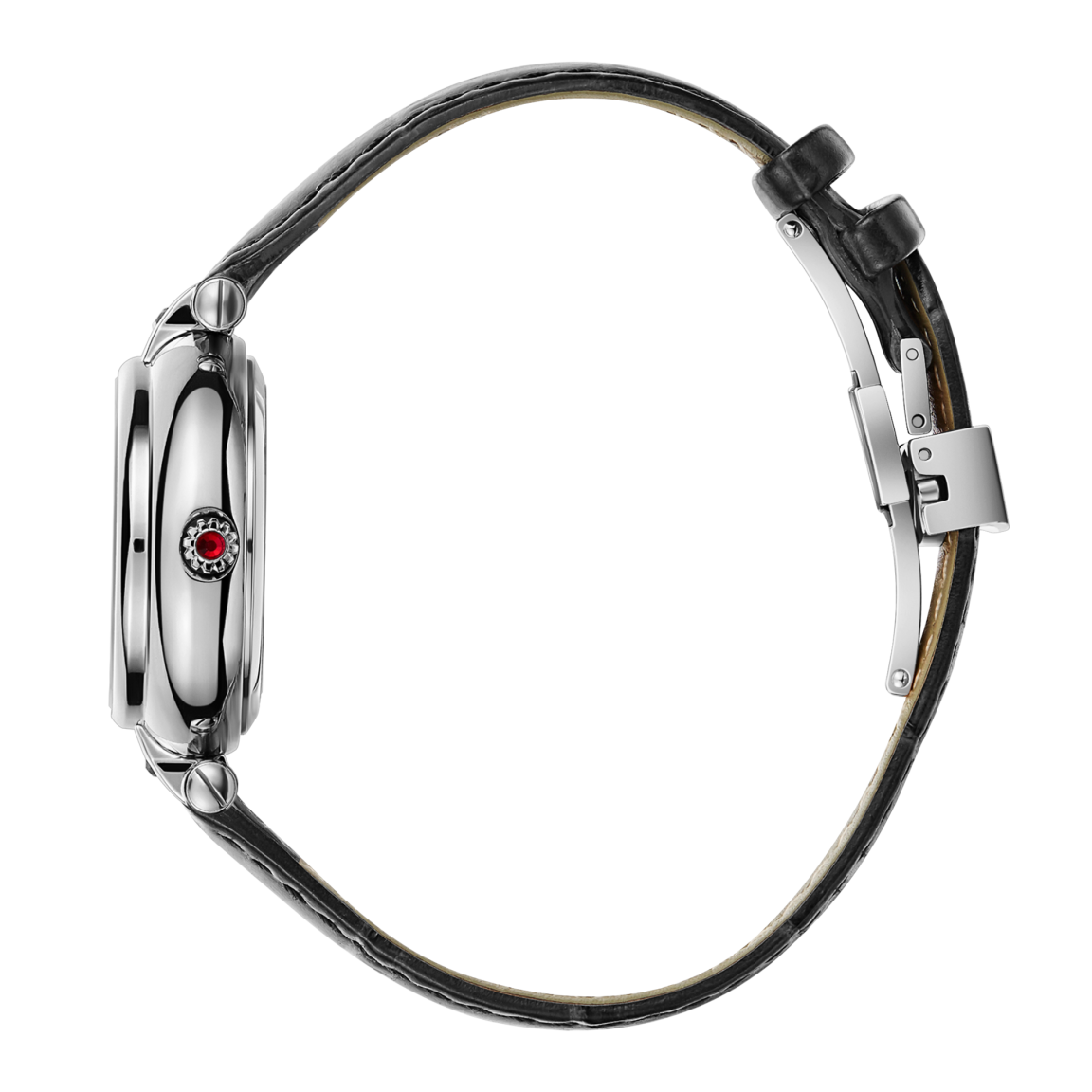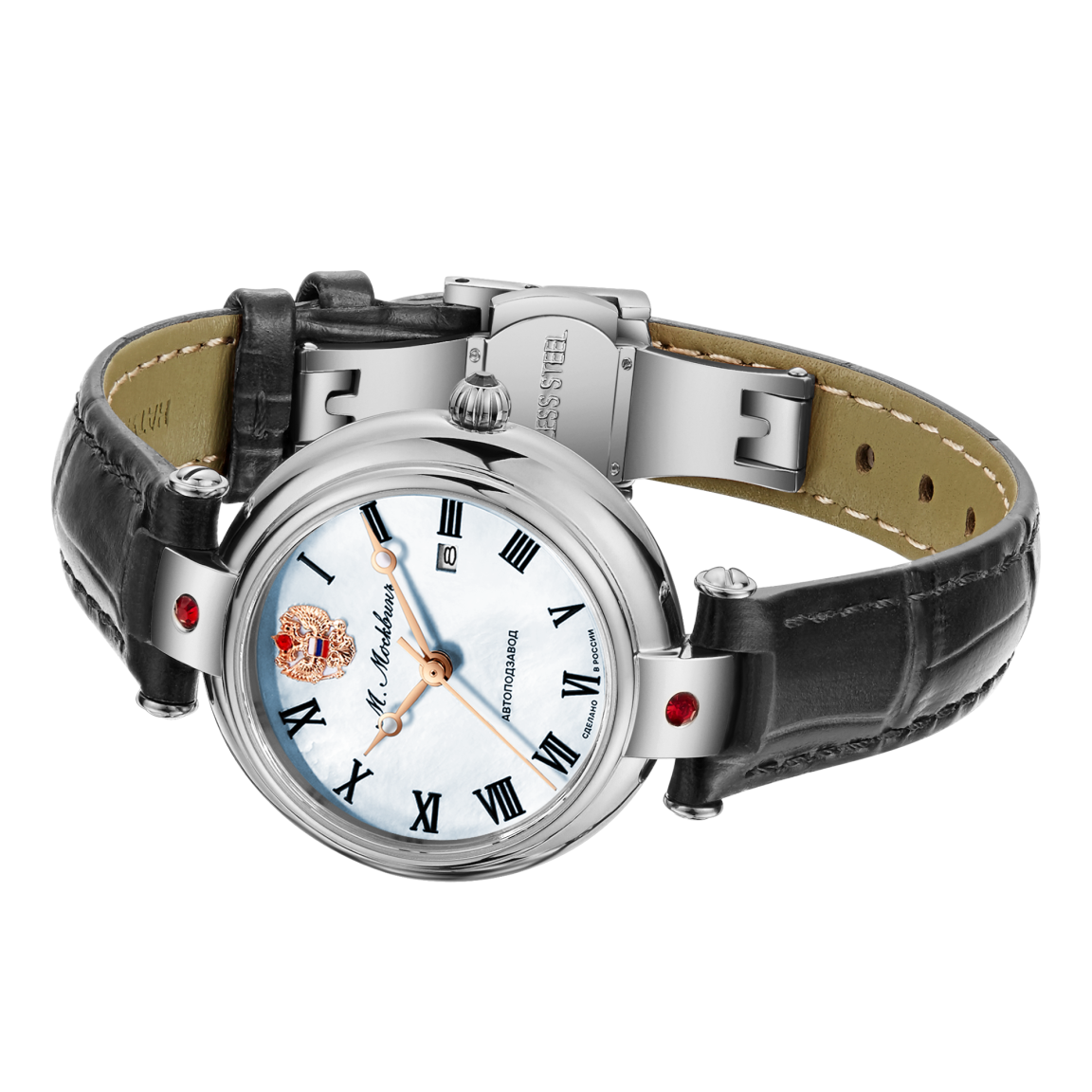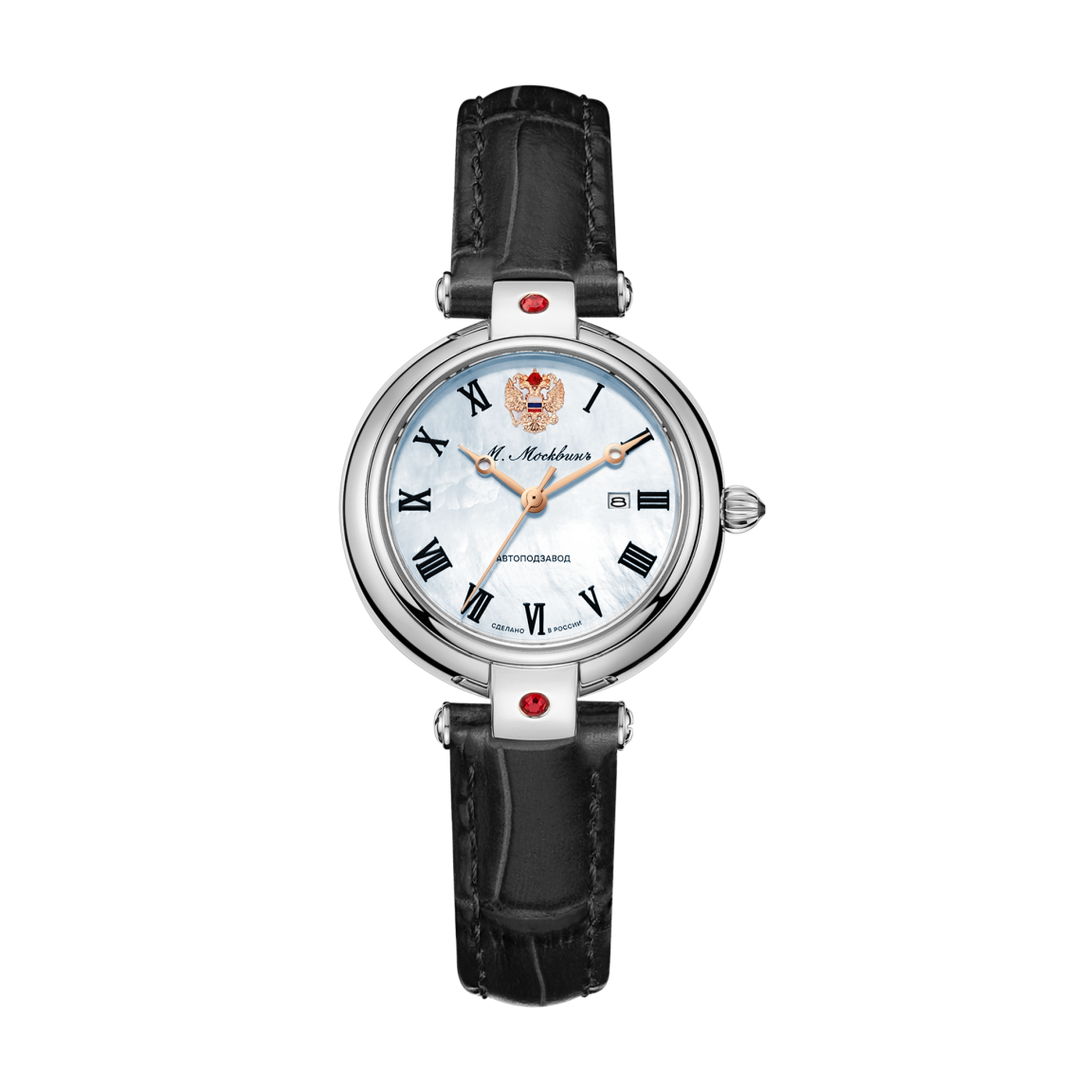 Женские наручные часы в классическом стиле, воплощающие элегантность и утонченность в каждом элементе. Изящный круглый корпус диаметром 31,5 мм выполнен из высококачественной нержавеющей стали и оснащён оригинальным Т-образным дужковым креплением ремешка, украшенным искрящимся красным акцентным фианитом. Перламутровый циферблат с чеканным знаком в виде Герба Российской Федерации на отметке 12 часов, римские цифры, выполненные техникой объёмной печати, и стрелки в стиле «бреге» подчёркивают классический дизайн и внимательность к деталям. Часы оснащены сапфировым стеклом, гарантирующим высокую устойчивость к царапинам, а уровень водозащиты 5 АТМ позволит не бояться ежедневных контактов с водой. Надёжный японский механизм с автоподзаводом Miyota 6T15 обеспечивает точность и запас хода не менее 35ч. Заключённые на ремешок с тиснением под крокодила с застёжкой-бабочкой, эти часы станут настоящим украшением любого образа, сочетая классическую элегантность и современные технические решения.