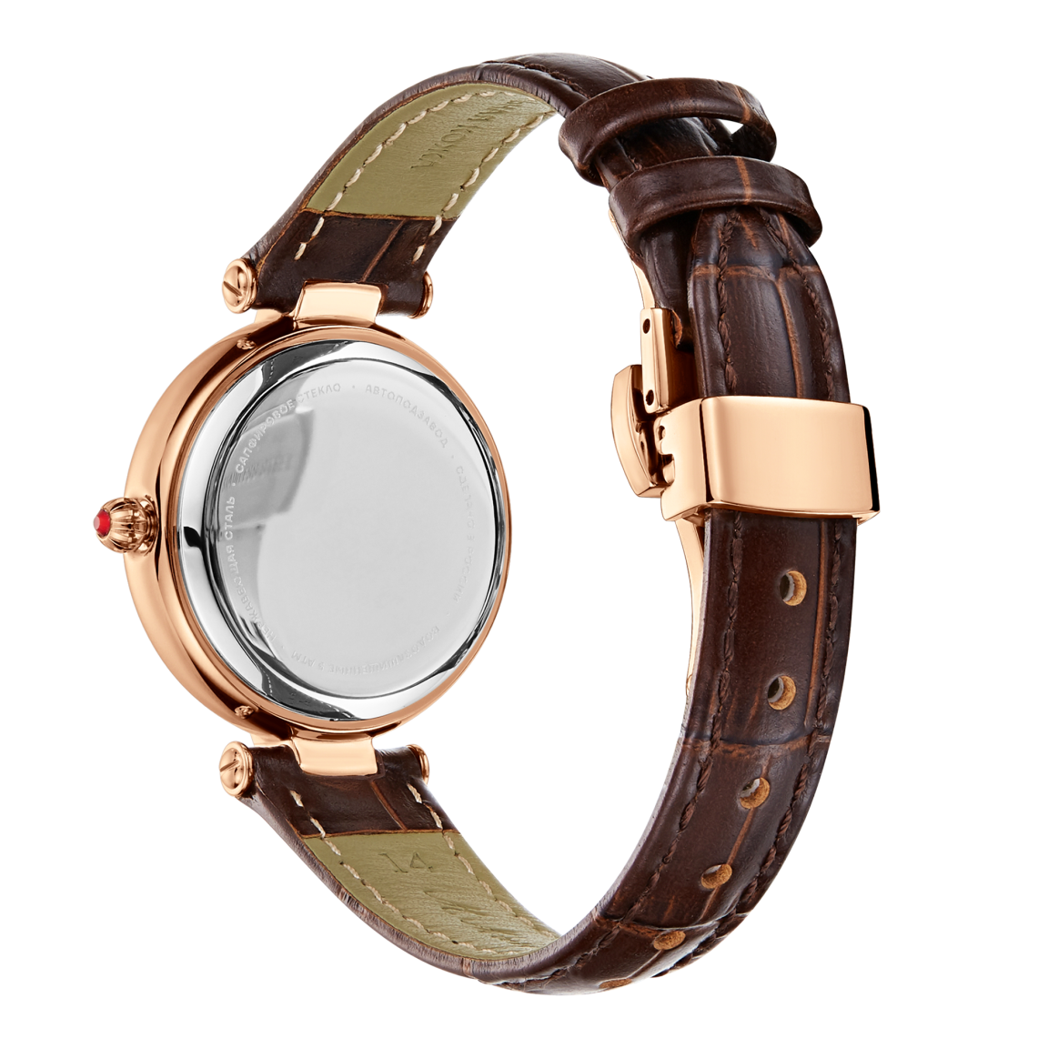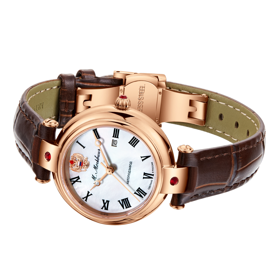 Женские наручные часы в классическом стиле, воплощающие элегантность и утонченность в каждом элементе. Изящный круглый корпус диаметром 31,5 мм выполнен из высококачественной нержавеющей стали и оснащён оригинальным Т-образным дужковым креплением ремешка, украшенным искрящимся красным акцентным фианитом. Перламутровый циферблат с чеканным знаком в виде Герба Российской Федерации на отметке 12 часов, римские цифры, выполненные техникой объёмной печати, и стрелки в стиле «бреге» подчёркивают классический дизайн и внимательность к деталям. Часы оснащены сапфировым стеклом, гарантирующим высокую устойчивость к царапинам, а уровень водозащиты 5 АТМ позволит не бояться ежедневных контактов с водой. Надёжный японский механизм с автоподзаводом Miyota 6T15 обеспечивает точность и запас хода не менее 35ч. Заключённые на ремешок с тиснением под крокодила с застёжкой-бабочкой, эти часы станут настоящим украшением любого образа, сочетая классическую элегантность и современные технические решения.