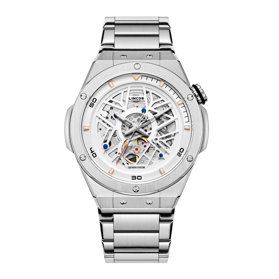 Мужские часы-скелетоны в брутальном 44 миллиметровом корпусе завораживают работой надёжного японского механизма с функцией автоподзавода  Miyota 82S0, вид на который открывается сквозь прочное сапфировое стекло. На декорированном циферблате располагаются объёмные часовые индексы, на которые, как и на заострённые стрелки, нанесено люминесцентное покрытие. Стальной браслет оснащён удобной застёжкой-бабочкой.
