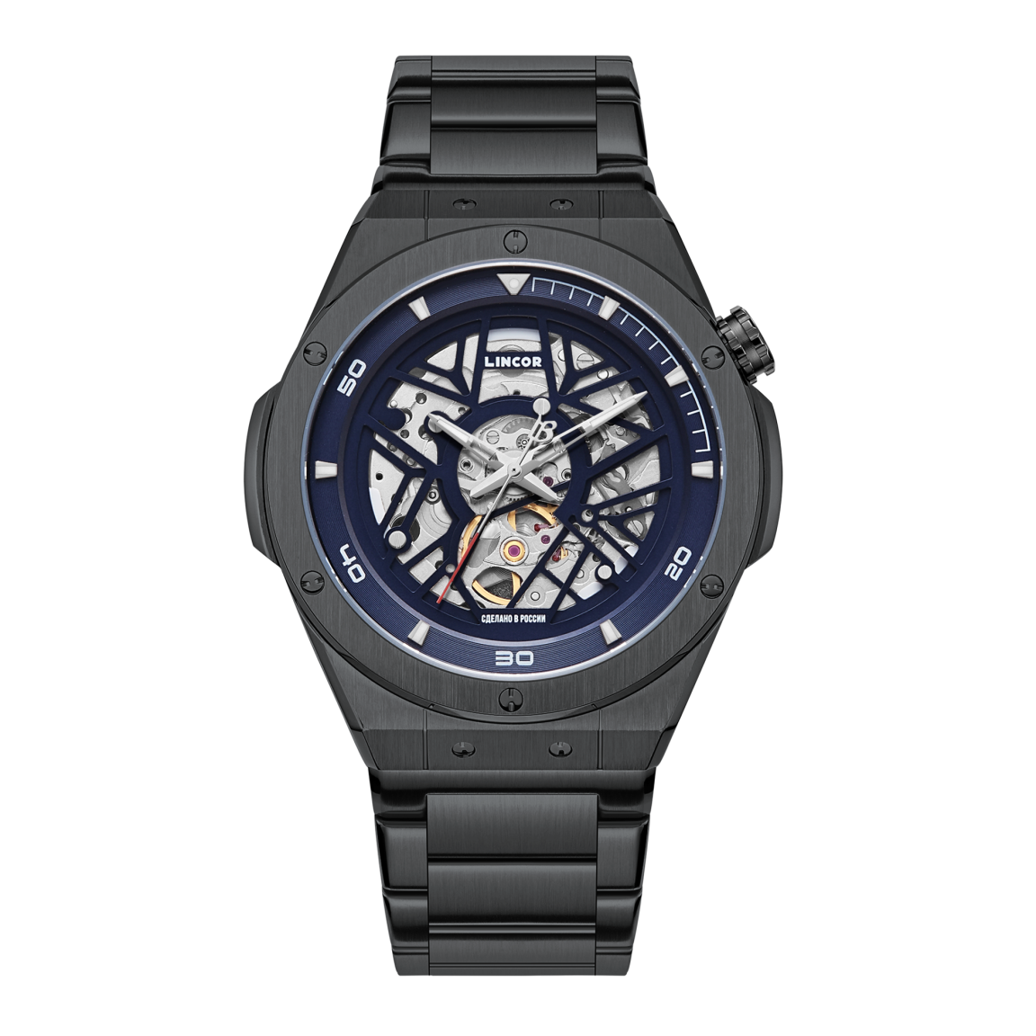 Мужские часы-скелетоны в брутальном 44 миллиметровом корпусе завораживают работой надёжного японского механизма с функцией автоподзавода  Miyota 82S0, вид на который открывается сквозь прочное сапфировое стекло. На декорированном циферблате располагаются объёмные часовые индексы, на которые, как и на заострённые стрелки, нанесено люминесцентное покрытие. Стальной браслет оснащён удобной застёжкой-бабочкой.