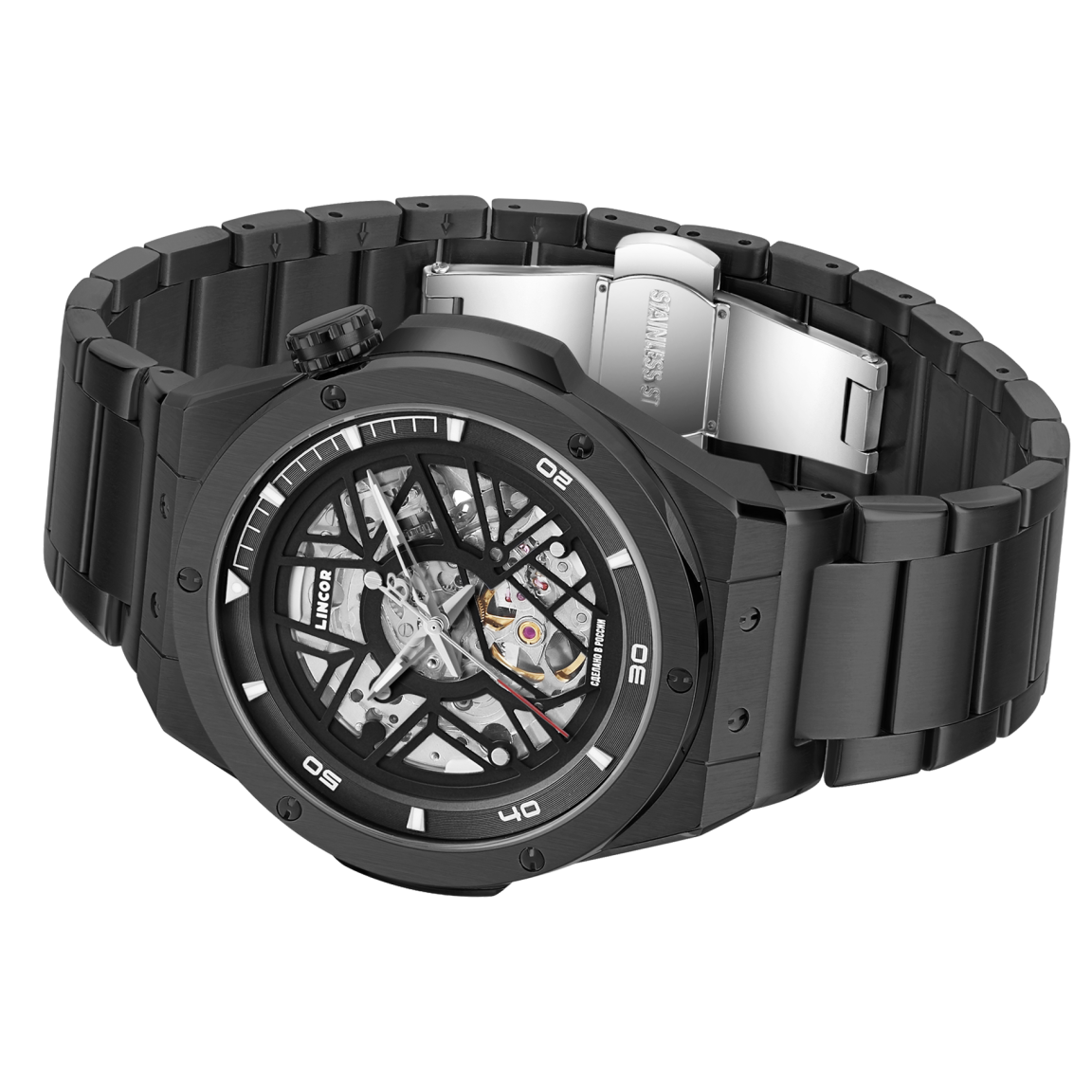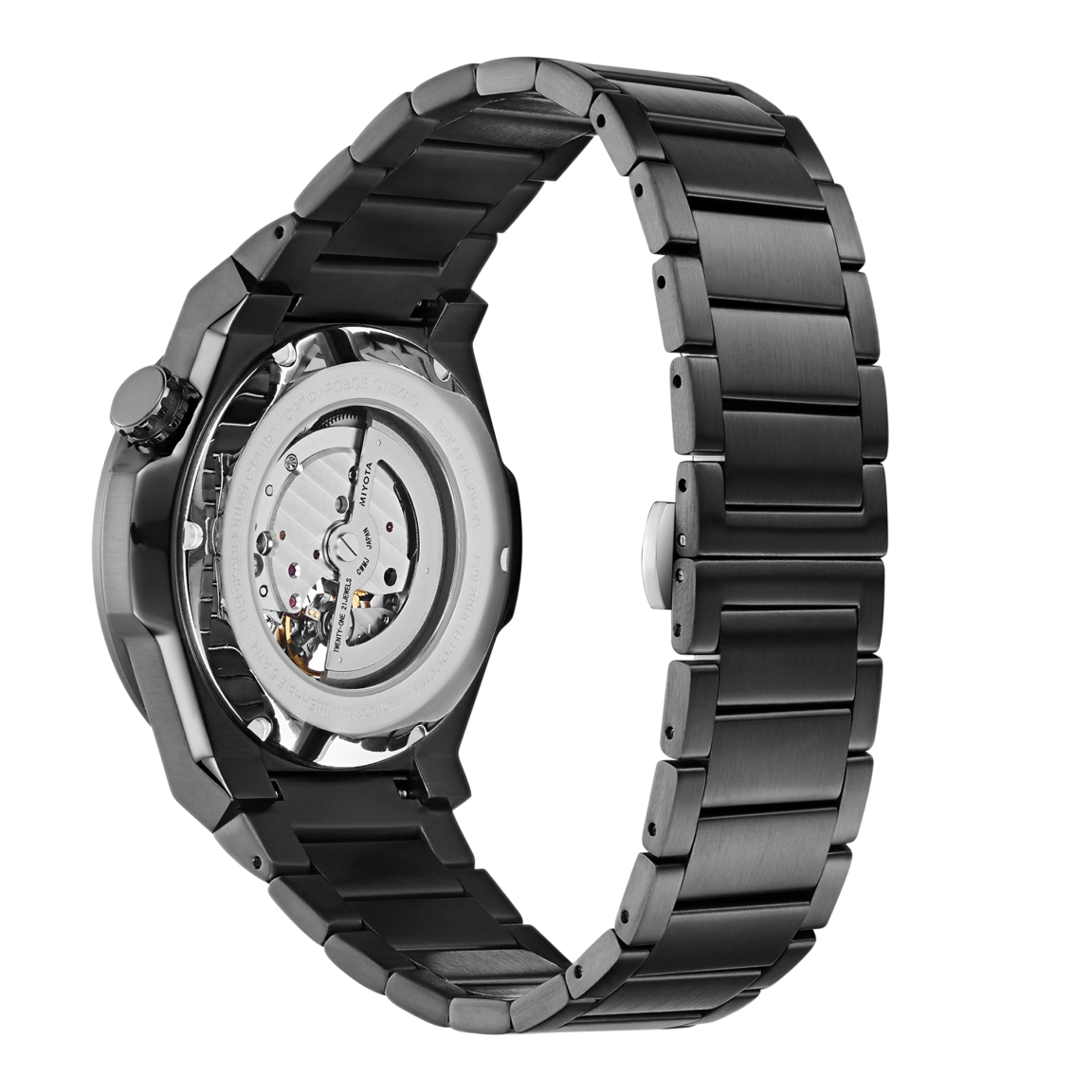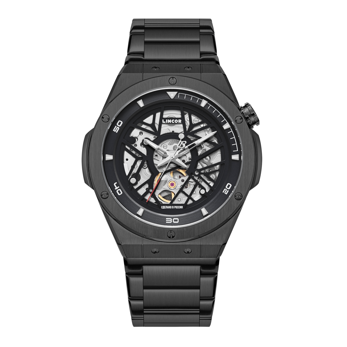 Мужские часы-скелетоны в брутальном 44 миллиметровом корпусе завораживают работой надёжного японского механизма с функцией автоподзавода  Miyota 82S0, вид на который открывается сквозь прочное сапфировое стекло. На декорированном циферблате располагаются объёмные часовые индексы, на которые, как и на заострённые стрелки, нанесено люминесцентное покрытие. Стальной браслет оснащён удобной застёжкой-бабочкой.