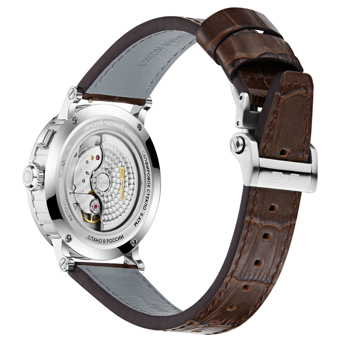 • Часы дополнены элегантным ремешком из телячьей кожи с благородной текстурой под кожу крокодила. Система быстрой замены на штифтах позволяет мгновенно менять образ, а фирменная раскладывающаяся пряжка из литой стали обеспечивает максимальное удобство ношения и надежную фиксацию.