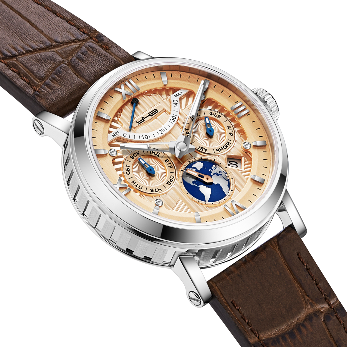 Мужские многофункциональные часы, где сложный дизайн сочетается с высокой точностью. Их 40-миллиметровый корпус из стали 316L выполнен с контрастной отделкой: зеркальная полировка гармонирует с сатинированными вставками. Центр притяжения — многоуровневый циферблат, гармонично дополненный полезными индикаторами: запаса хода, месяца, дня недели, 24-часовой шкалой, стилизованной под планету Земля, и окошком календаря. Читаемость в темноте обеспечивает покрытие Swiss SuperLuminova на стрелках, а сапфировое стекло с антибликовым покрытием гарантирует абсолютную чёткость в любых условиях. Внутри работает механизм премиального класса Miyota 9100 с 40-часовым запасом хода. Через прозрачную заднюю крышку виден его искусно декорированный ротор. Часы защищены от воды до 5 АТМ, и завершает образ кожаный ремешок с тиснением под крокодила с фирменной раскладывающейся пряжкой и системой быстрой замены.