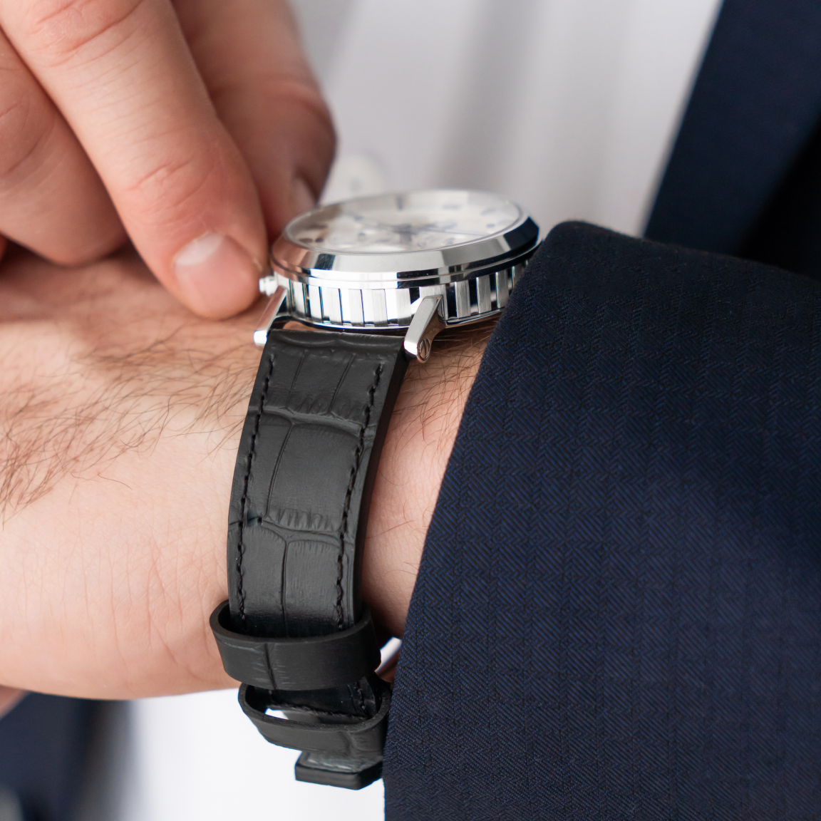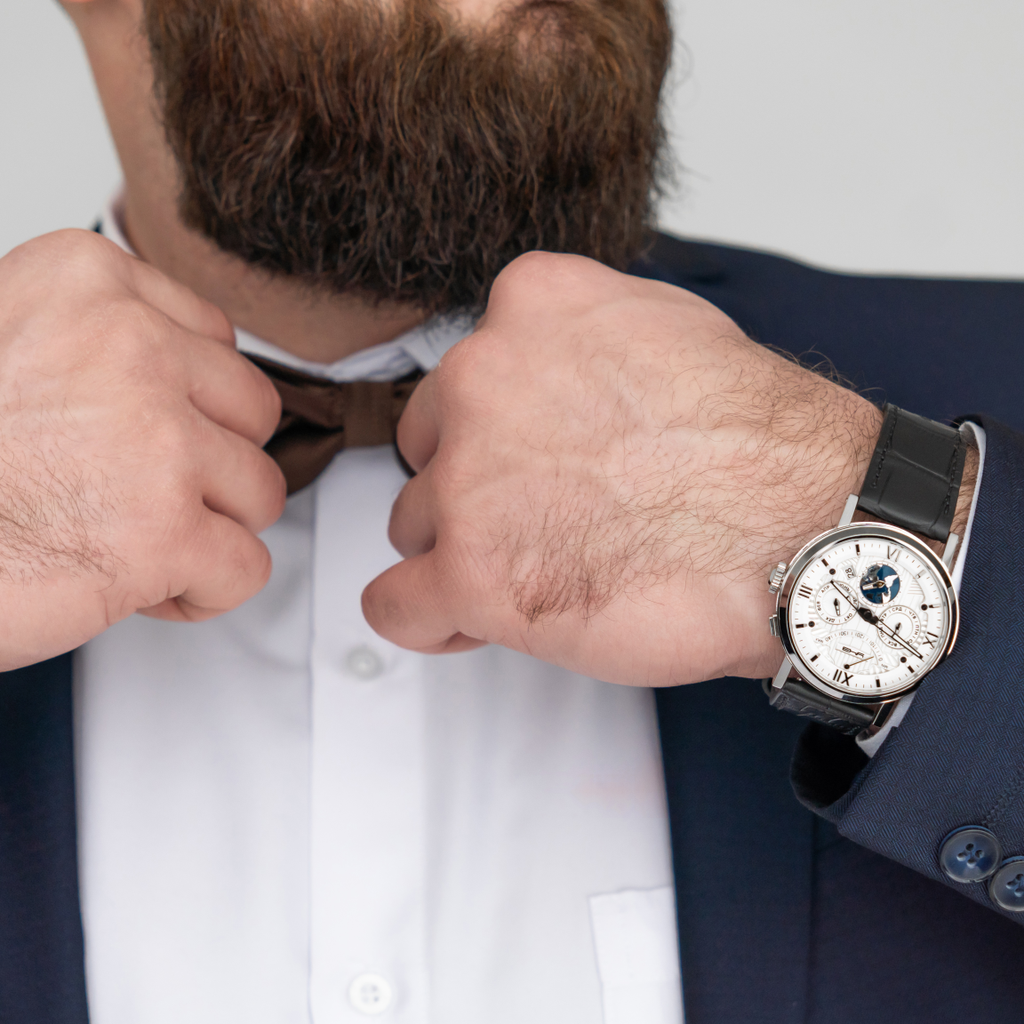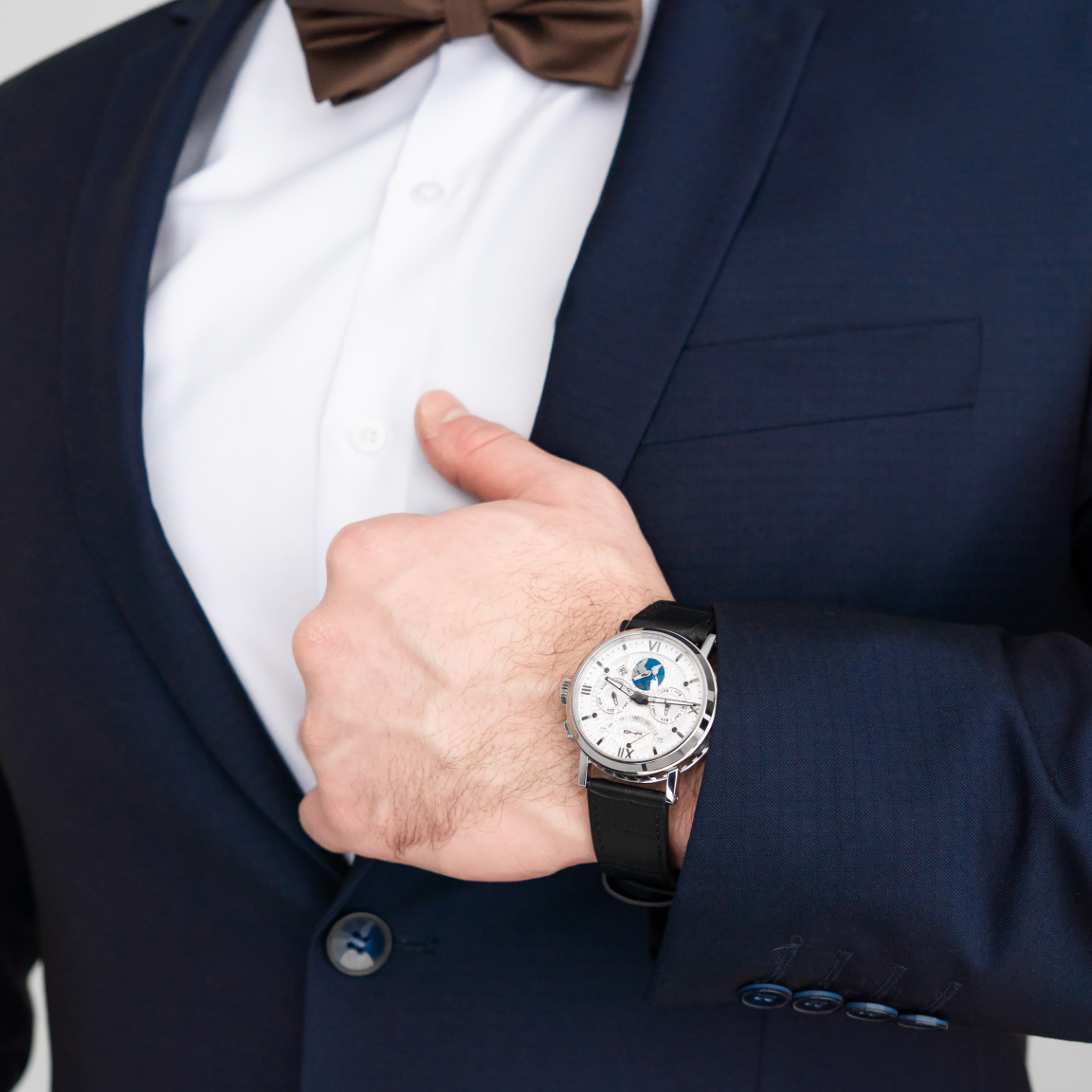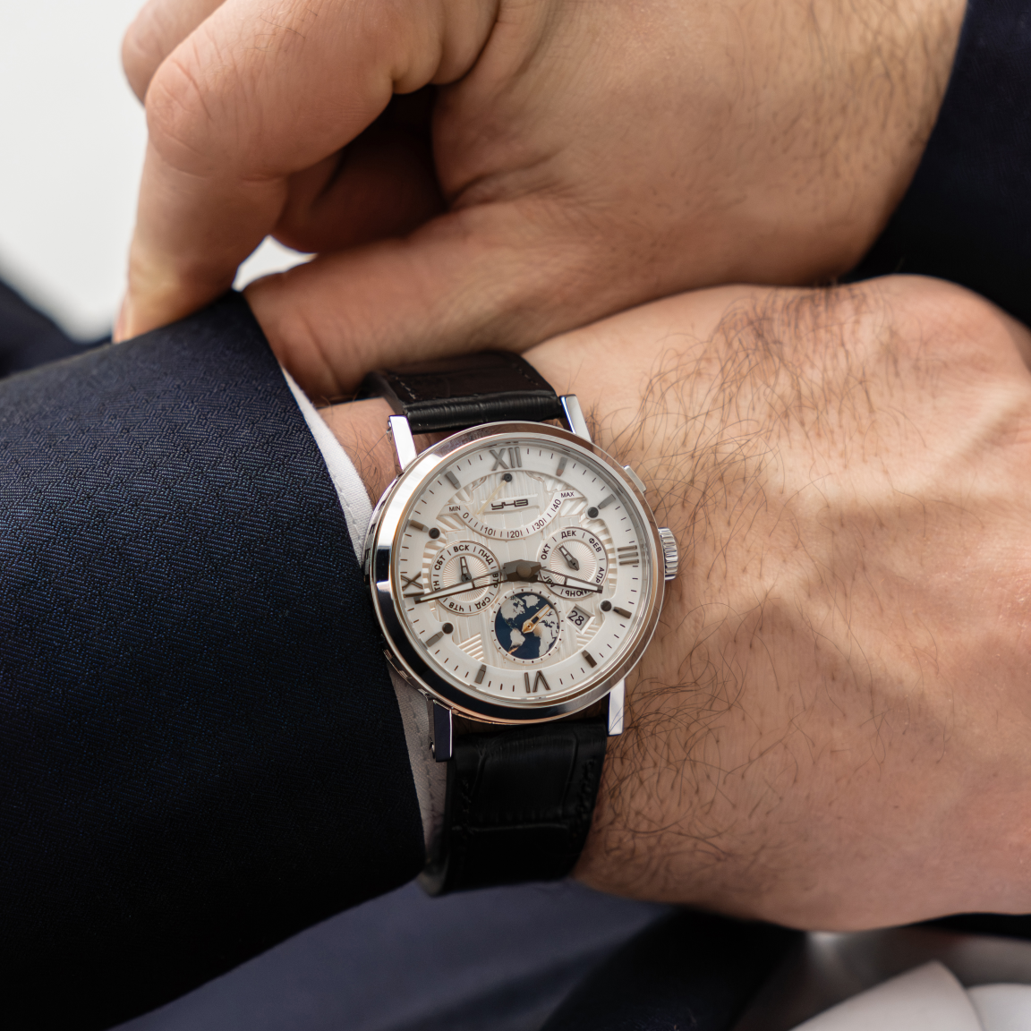 Мужские многофункциональные часы, где сложный дизайн сочетается с высокой точностью. Их 40-миллиметровый корпус из стали 316L выполнен с контрастной отделкой: зеркальная полировка гармонирует с сатинированными вставками. Центр притяжения — многоуровневый циферблат, гармонично дополненный полезными индикаторами: запаса хода, месяца, дня недели, 24-часовой шкалой, стилизованной под планету Земля, и окошком календаря. Читаемость в темноте обеспечивает покрытие Swiss SuperLuminova на стрелках, а сапфировое стекло с антибликовым покрытием гарантирует абсолютную чёткость в любых условиях. Внутри работает механизм премиального класса Miyota 9100 с 40-часовым запасом хода. Через прозрачную заднюю крышку виден его искусно декорированный ротор. Часы защищены от воды до 5 АТМ, и завершает образ кожаный ремешок с тиснением под крокодила с фирменной раскладывающейся пряжкой и системой быстрой замены.