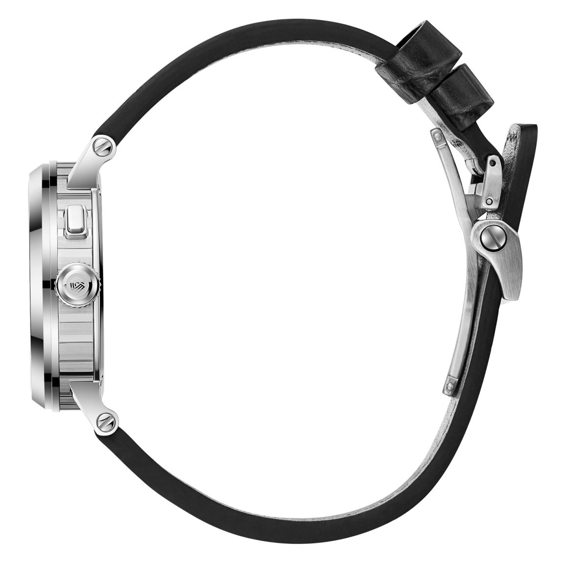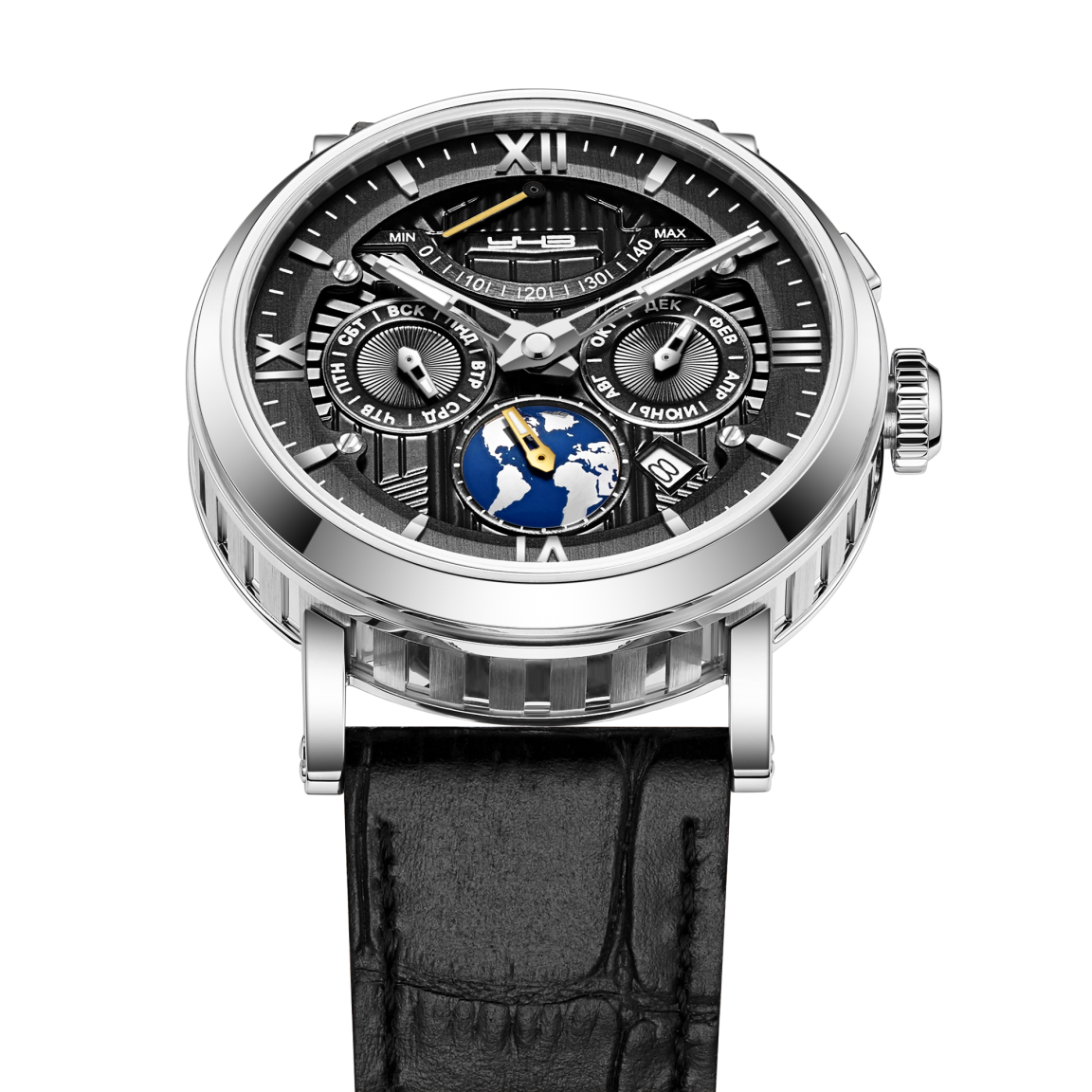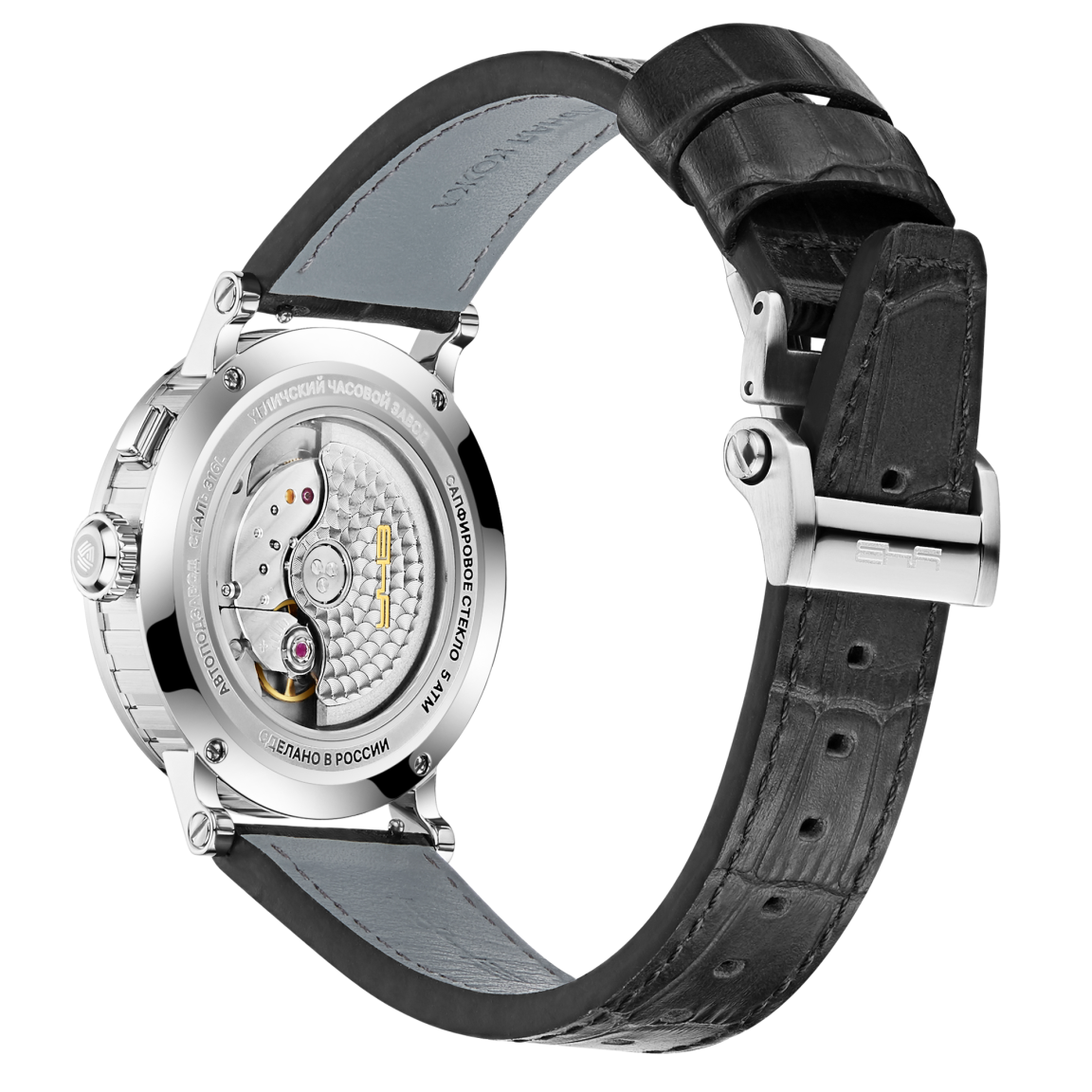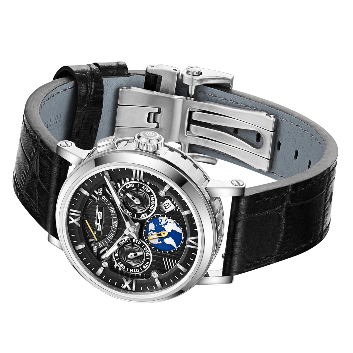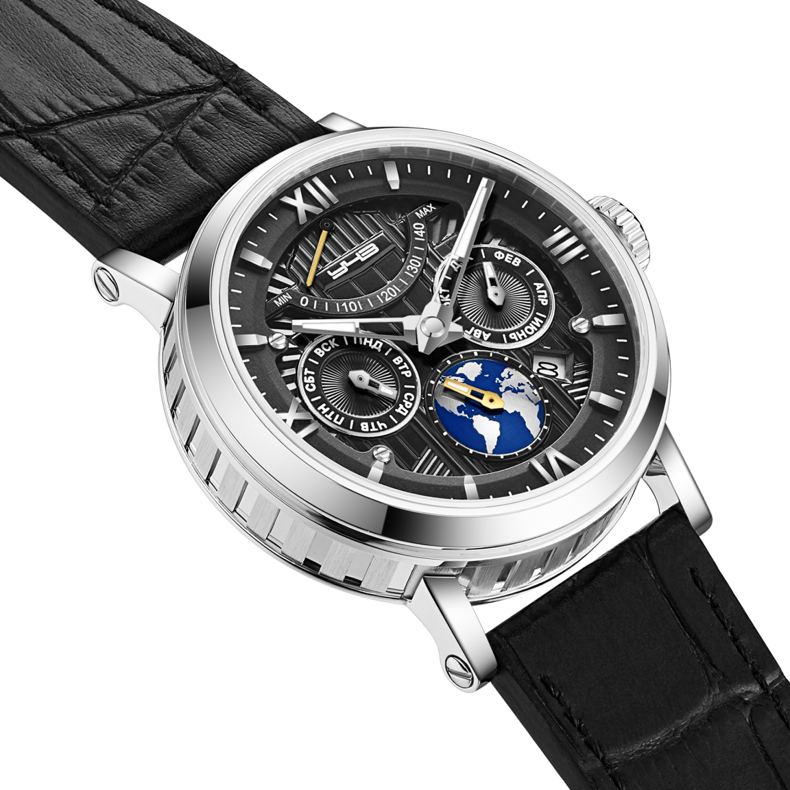 Мужские многофункциональные часы, где сложный дизайн сочетается с высокой точностью. Их 40-миллиметровый корпус из стали 316L выполнен с контрастной отделкой: зеркальная полировка гармонирует с сатинированными вставками. Центр притяжения — многоуровневый циферблат, гармонично дополненный полезными индикаторами: запаса хода, месяца, дня недели, 24-часовой шкалой, стилизованной под планету Земля, и окошком календаря. Читаемость в темноте обеспечивает покрытие Swiss SuperLuminova на стрелках, а сапфировое стекло с антибликовым покрытием гарантирует абсолютную чёткость в любых условиях. Внутри работает механизм премиального класса Miyota 9100 с 40-часовым запасом хода. Через прозрачную заднюю крышку виден его искусно декорированный ротор. Часы защищены от воды до 5 АТМ, и завершает образ кожаный ремешок с тиснением под крокодила с фирменной раскладывающейся пряжкой и системой быстрой замены.