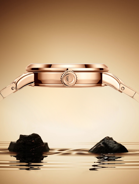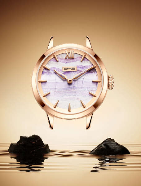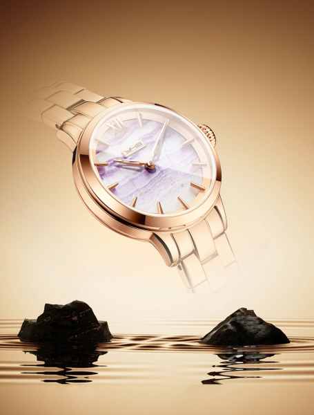 • Модель с розовым оттенком чарует мягким сиянием флюорита — «камня гениев». Его нежные розово-сиреневые переливы напоминают акварельные разводы, даря циферблату неповторимый, таинственный рисунок.