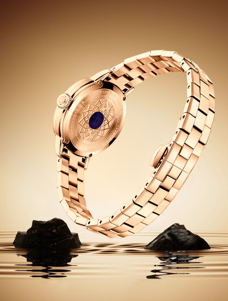 • Задняя крышка часов украшена изысканным рельефным узором, в центр которого вставлен натуральный камень, соответствующий циферблату. Это решение создает гармоничную завершенность образа, превращая тыльную сторону часов в изящное украшение, которое можно рассмотреть вблизи.