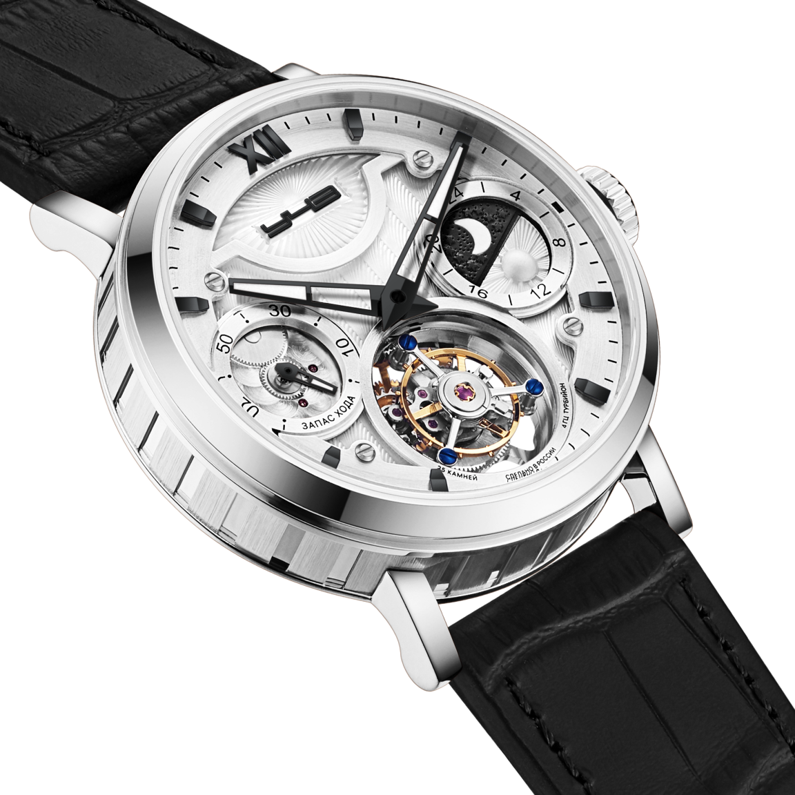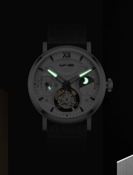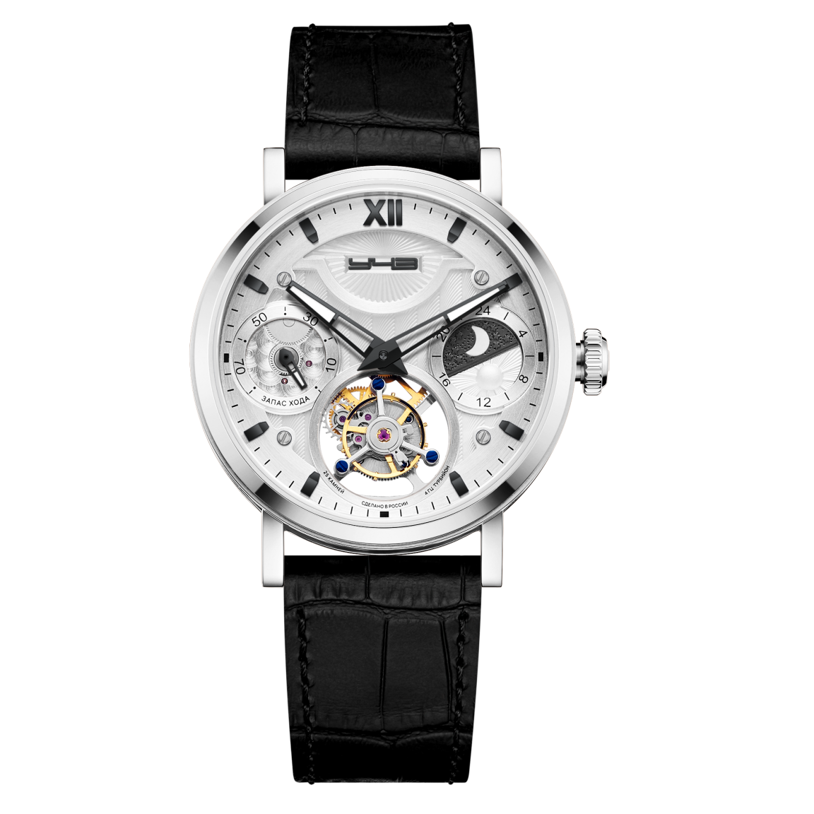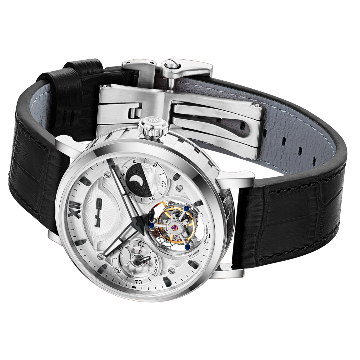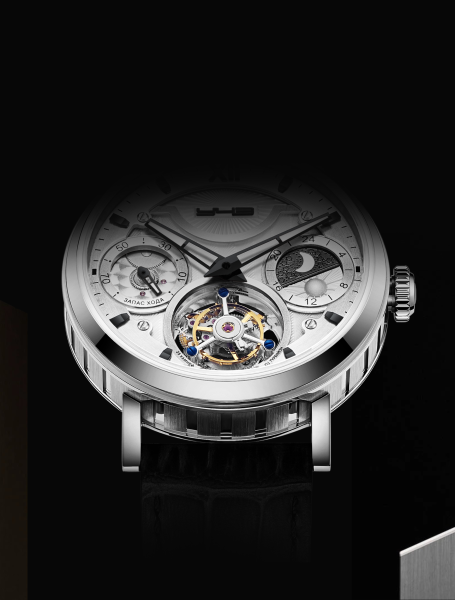Модель, сочетающая в себе сложную механику, премиальные материалы и безупречный дизайн. Корпус из нержавеющей стали 316L диаметром 42.5 мм и толщиной 12.3 мм представляет собой мастерскую работу с металлом. Сочетание зеркальной полировки и тонкого вертикального сатинирования создает сложную игру света, где глянцевые поверхности элегантно контрастируют с матовыми прямоугольными вставками. Взгляд притягивает многоуровневый циферблат из фрезерованного перламутра с рельефными окошками запаса хода (72 ч.) и 24-х часовой шкалой, представленной в виде объемных изображений Солнца и Луны. На последнюю, как и на стрелки, нанесён сверхъяркий люминофор Swiss SuperLuminova. Через апертуру на циферблате открывается вид на парящий турбийон калибра 3415-TM01, а сквозь прозрачную заднюю крышку можно увидеть механизм, украшенный узором «Женевские волны». Часы защищены сапфировым стеклом с антибликовым покрытием и выдерживают давление 5 АТМ. Комфорт обеспечивает кожаный ремешок с текстурой под крокодила, оснащенный быстросъемными штифтами и фирменной раскладывающейся литой пряжкой.