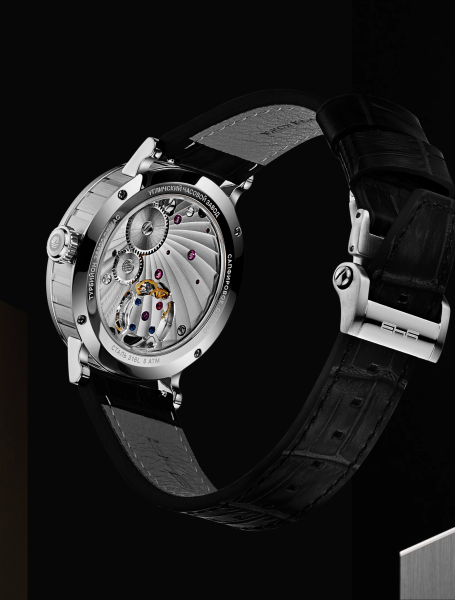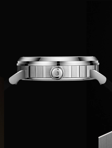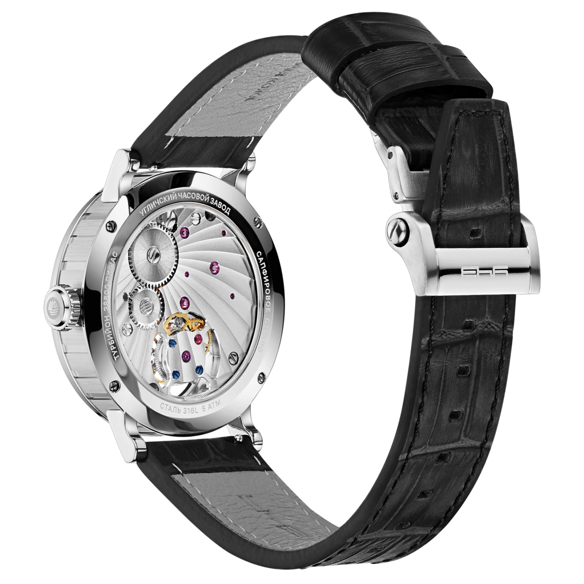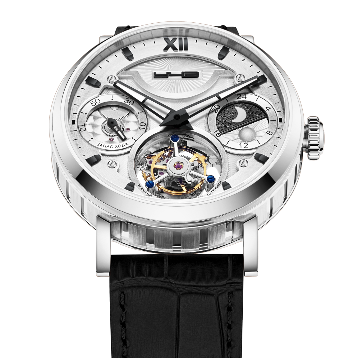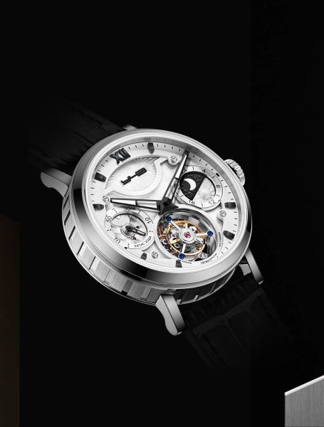 Модель, сочетающая в себе сложную механику, премиальные материалы и безупречный дизайн. Корпус из нержавеющей стали 316L диаметром 42.5 мм и толщиной 12.3 мм представляет собой мастерскую работу с металлом. Сочетание зеркальной полировки и тонкого вертикального сатинирования создает сложную игру света, где глянцевые поверхности элегантно контрастируют с матовыми прямоугольными вставками. Взгляд притягивает многоуровневый циферблат из фрезерованного перламутра с рельефными окошками запаса хода (72 ч.) и 24-х часовой шкалой, представленной в виде объемных изображений Солнца и Луны. На последнюю, как и на стрелки, нанесён сверхъяркий люминофор Swiss SuperLuminova. Через апертуру на циферблате открывается вид на парящий турбийон калибра 3415-TM01, а сквозь прозрачную заднюю крышку можно увидеть механизм, украшенный узором «Женевские волны». Часы защищены сапфировым стеклом с антибликовым покрытием и выдерживают давление 5 АТМ. Комфорт обеспечивает кожаный ремешок с текстурой под крокодила, оснащенный быстросъемными штифтами и фирменной раскладывающейся литой пряжкой.