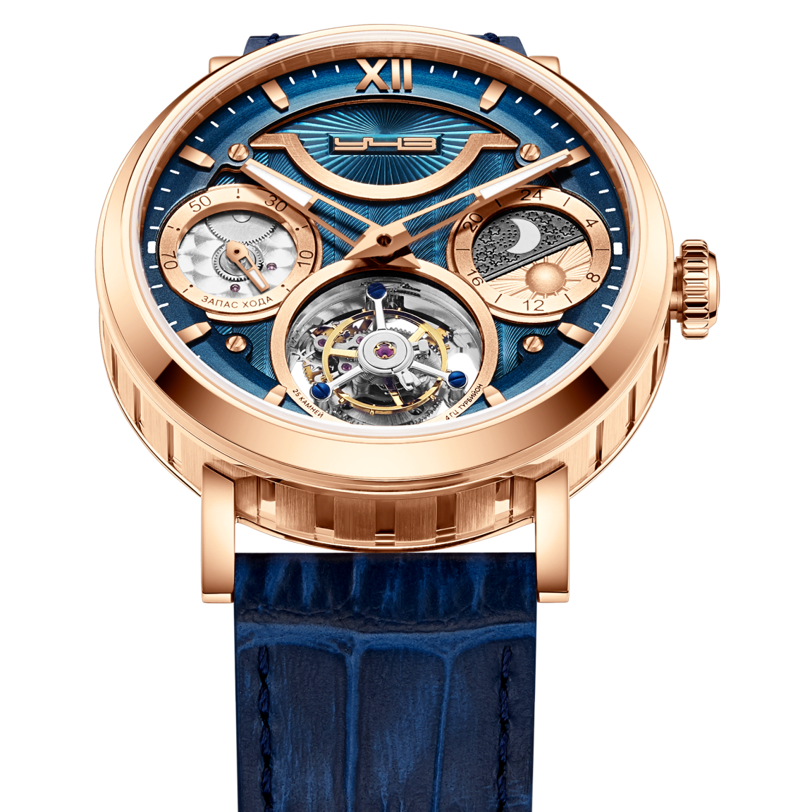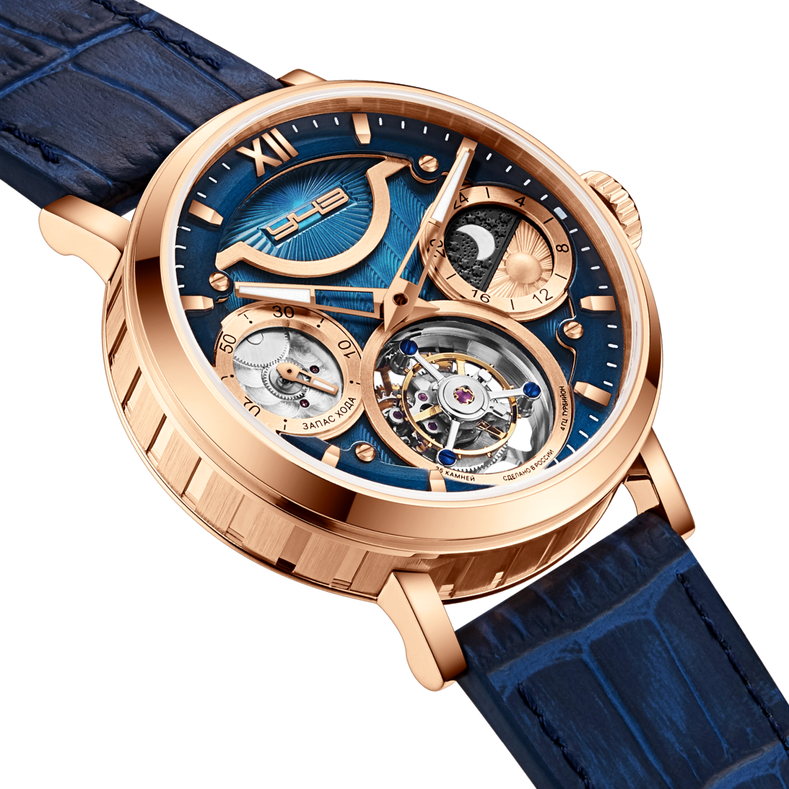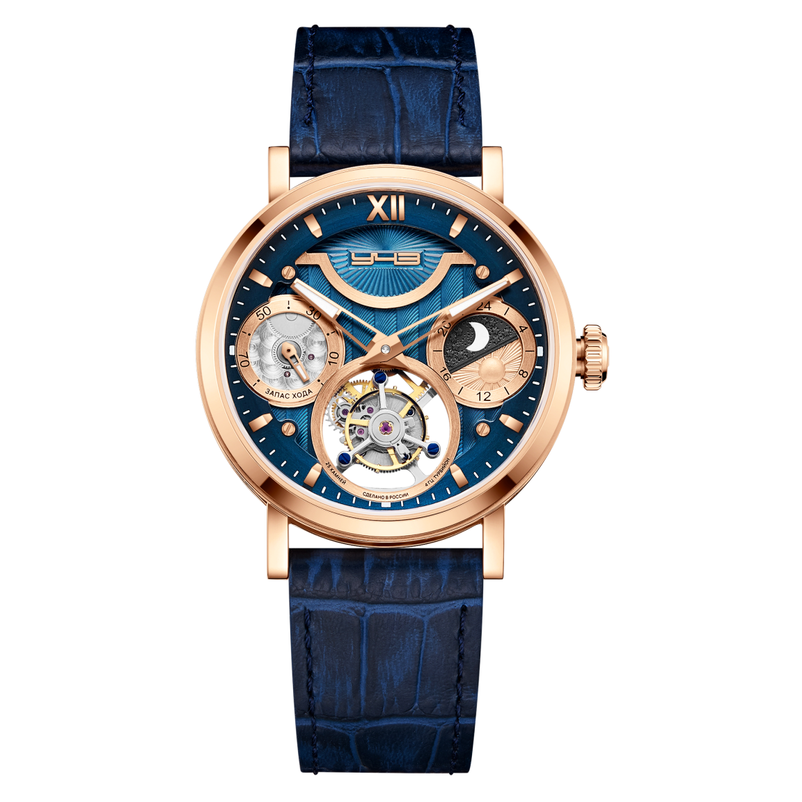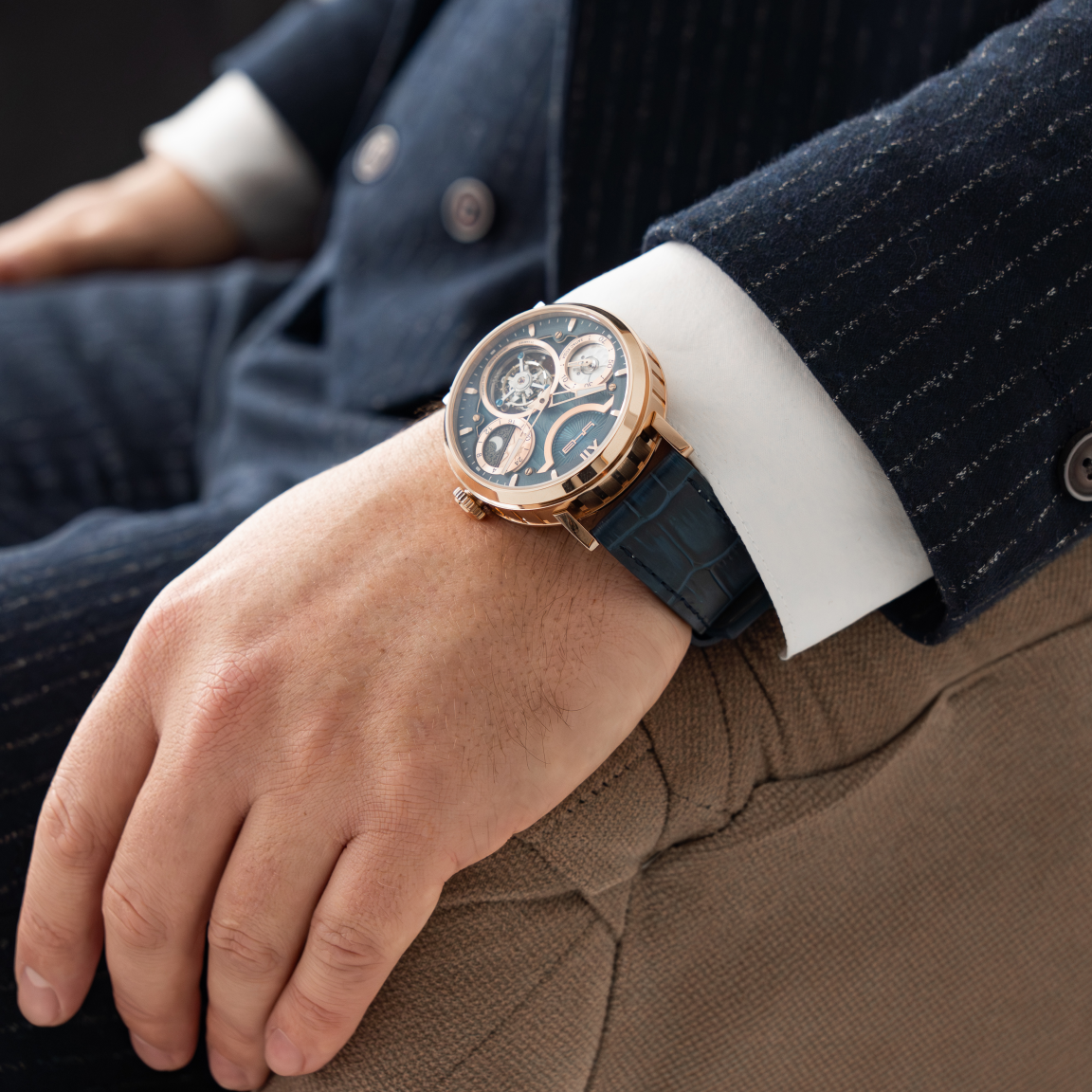 Модель, сочетающая в себе сложную механику, премиальные материалы и безупречный дизайн. Корпус из нержавеющей стали 316L диаметром 42.5 мм и толщиной 12.3 мм представляет собой мастерскую работу с металлом. Сочетание зеркальной полировки и тонкого вертикального сатинирования создает сложную игру света, где глянцевые поверхности элегантно контрастируют с матовыми прямоугольными вставками. Взгляд притягивает многоуровневый циферблат из фрезерованного перламутра с рельефными окошками запаса хода (72 ч.) и 24-х часовой шкалой, представленной в виде объемных изображений Солнца и Луны. На последнюю, как и на стрелки, нанесён сверхъяркий люминофор Swiss SuperLuminova. Через апертуру на циферблате открывается вид на парящий турбийон калибра 3415-TM01, а сквозь прозрачную заднюю крышку можно увидеть механизм, украшенный узором «Женевские волны». Часы защищены сапфировым стеклом с антибликовым покрытием и выдерживают давление 5 АТМ. Комфорт обеспечивает кожаный ремешок с текстурой под крокодила, оснащенный быстросъемными штифтами и фирменной раскладывающейся литой пряжкой.