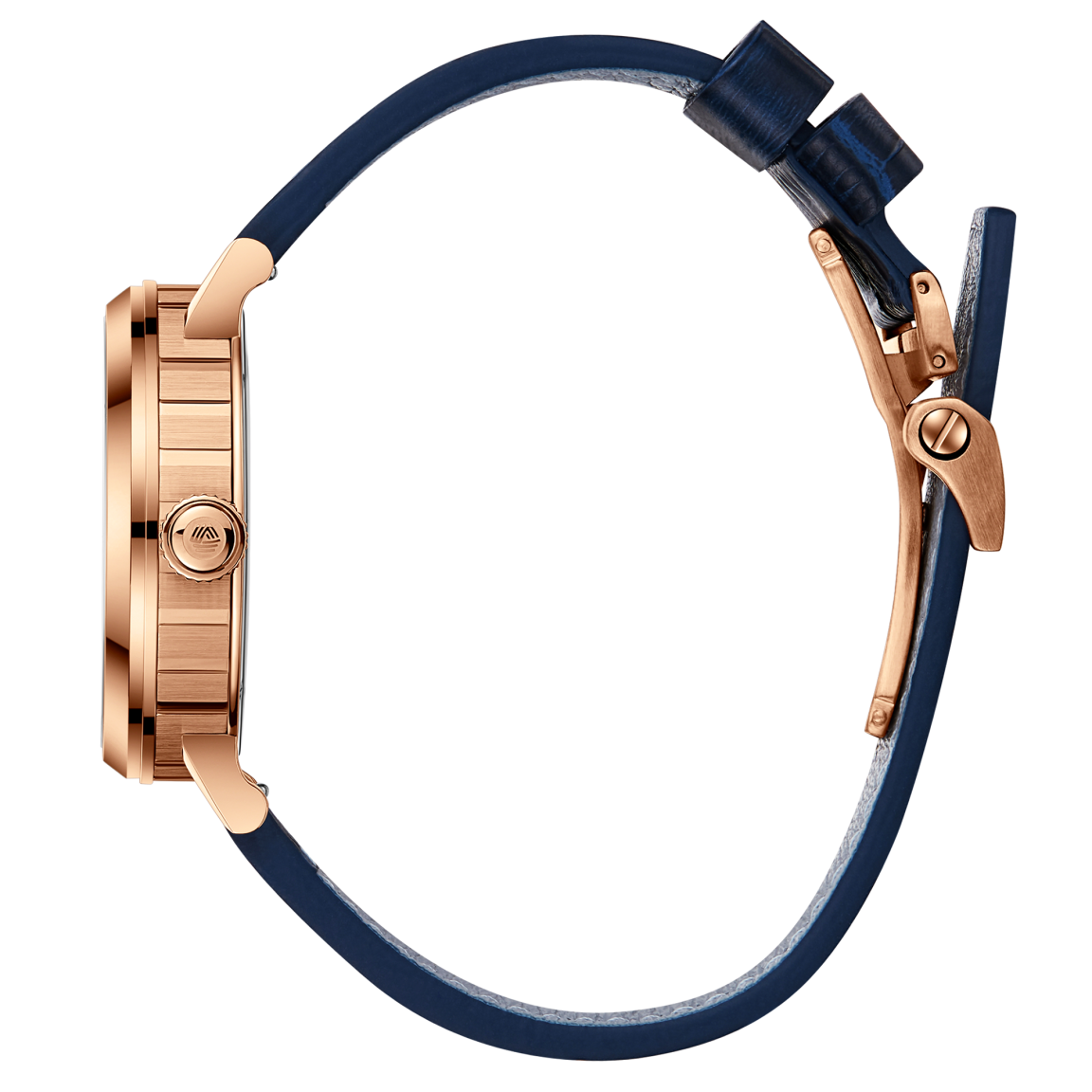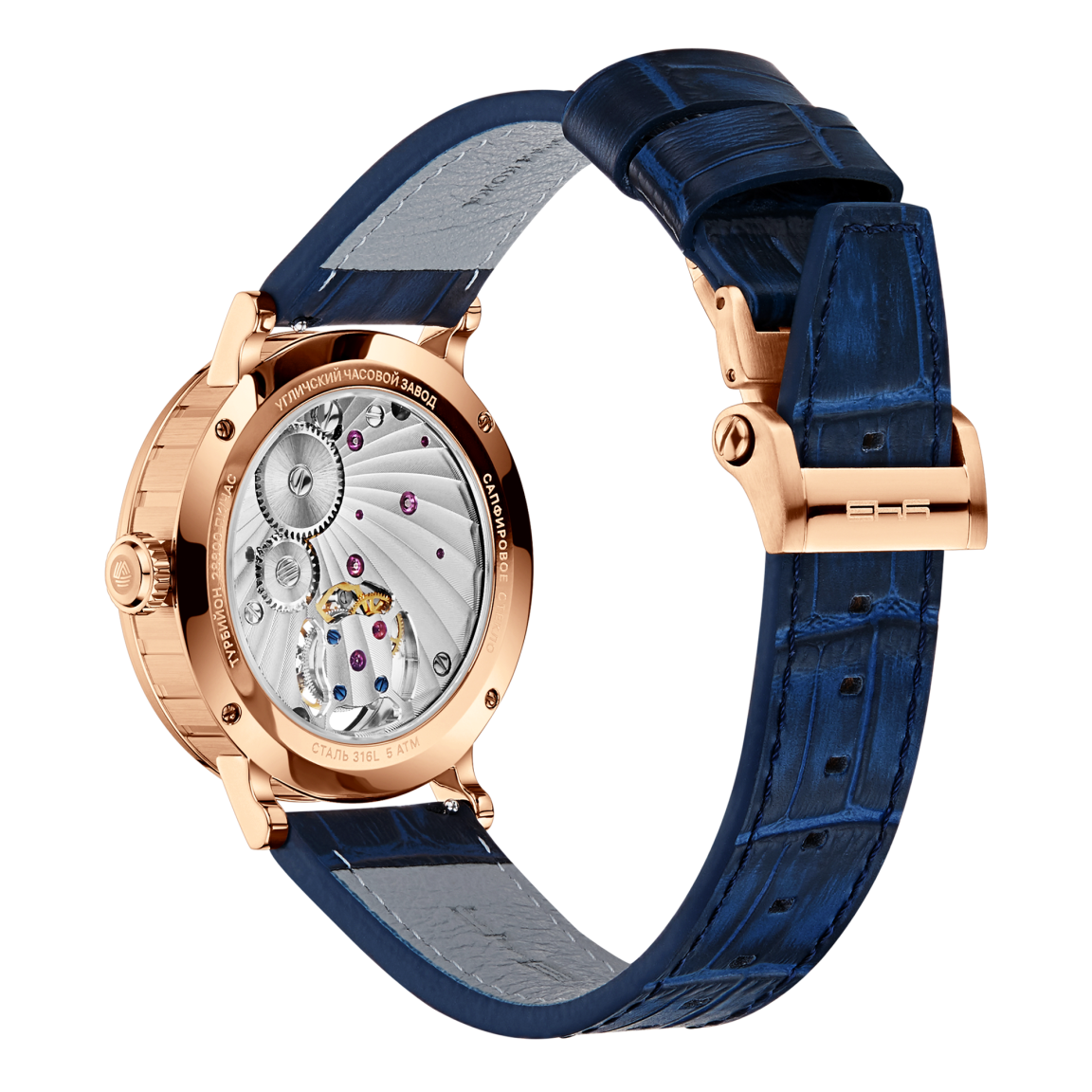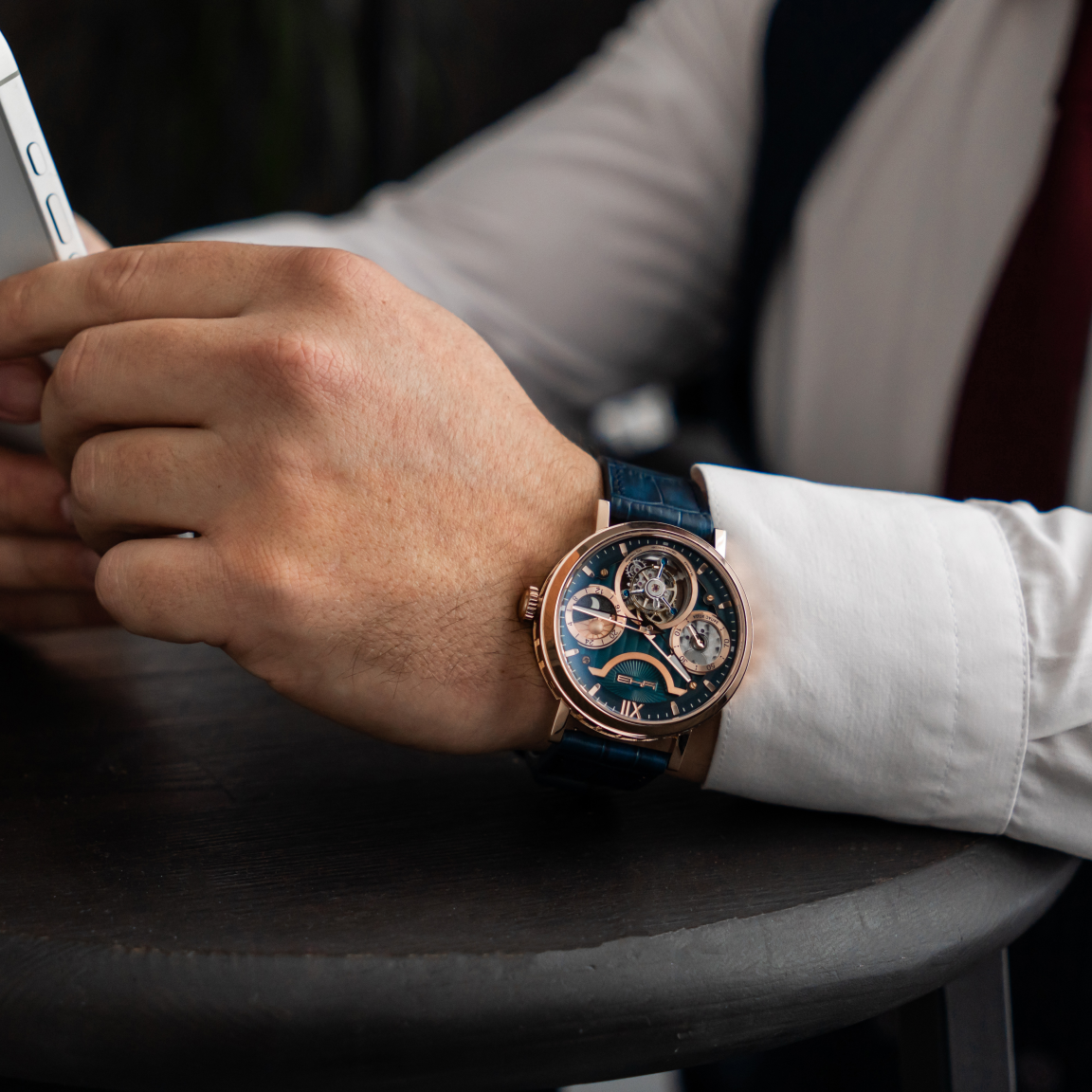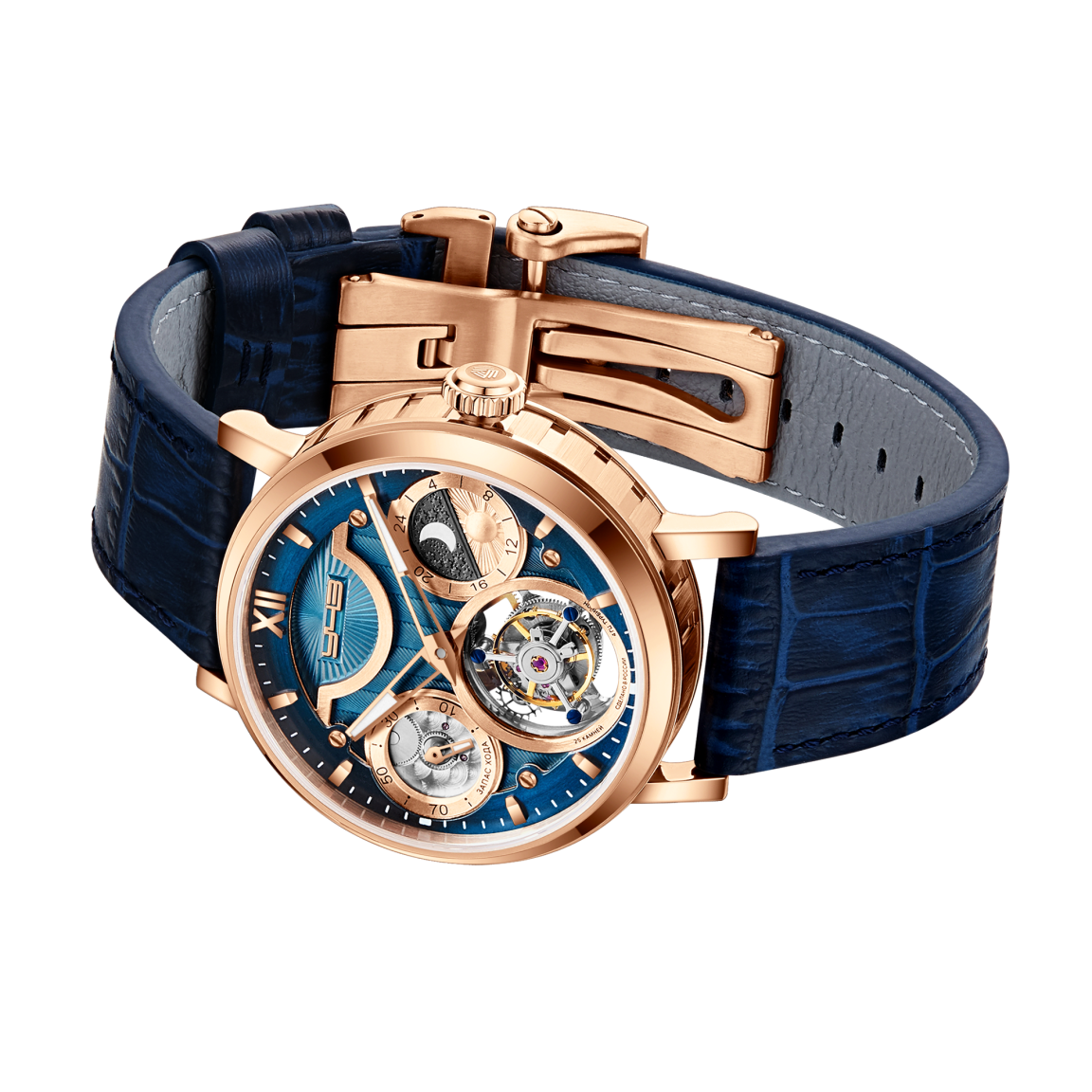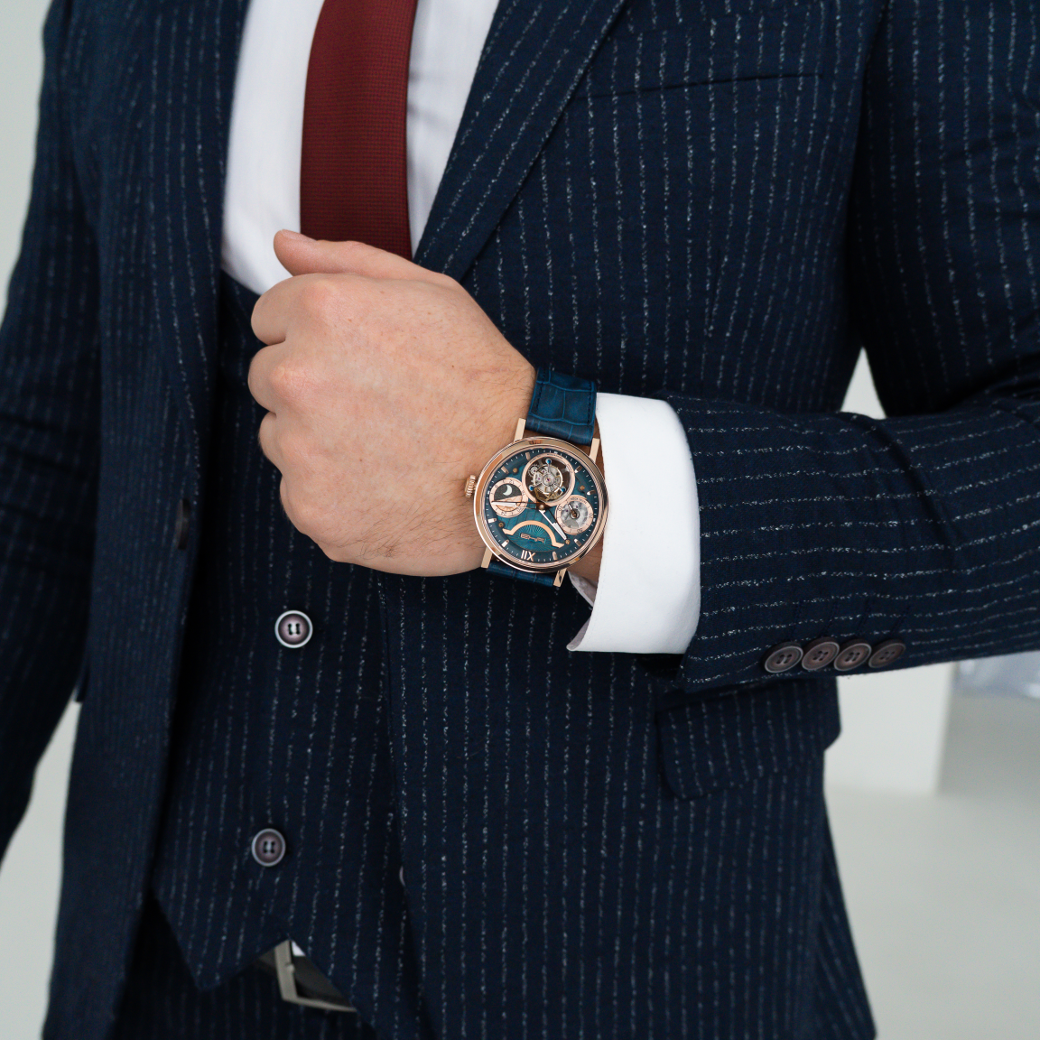 Модель, сочетающая в себе сложную механику, премиальные материалы и безупречный дизайн. Корпус из нержавеющей стали 316L диаметром 42.5 мм и толщиной 12.3 мм представляет собой мастерскую работу с металлом. Сочетание зеркальной полировки и тонкого вертикального сатинирования создает сложную игру света, где глянцевые поверхности элегантно контрастируют с матовыми прямоугольными вставками. Взгляд притягивает многоуровневый циферблат из фрезерованного перламутра с рельефными окошками запаса хода (72 ч.) и 24-х часовой шкалой, представленной в виде объемных изображений Солнца и Луны. На последнюю, как и на стрелки, нанесён сверхъяркий люминофор Swiss SuperLuminova. Через апертуру на циферблате открывается вид на парящий турбийон калибра 3415-TM01, а сквозь прозрачную заднюю крышку можно увидеть механизм, украшенный узором «Женевские волны». Часы защищены сапфировым стеклом с антибликовым покрытием и выдерживают давление 5 АТМ. Комфорт обеспечивает кожаный ремешок с текстурой под крокодила, оснащенный быстросъемными штифтами и фирменной раскладывающейся литой пряжкой.