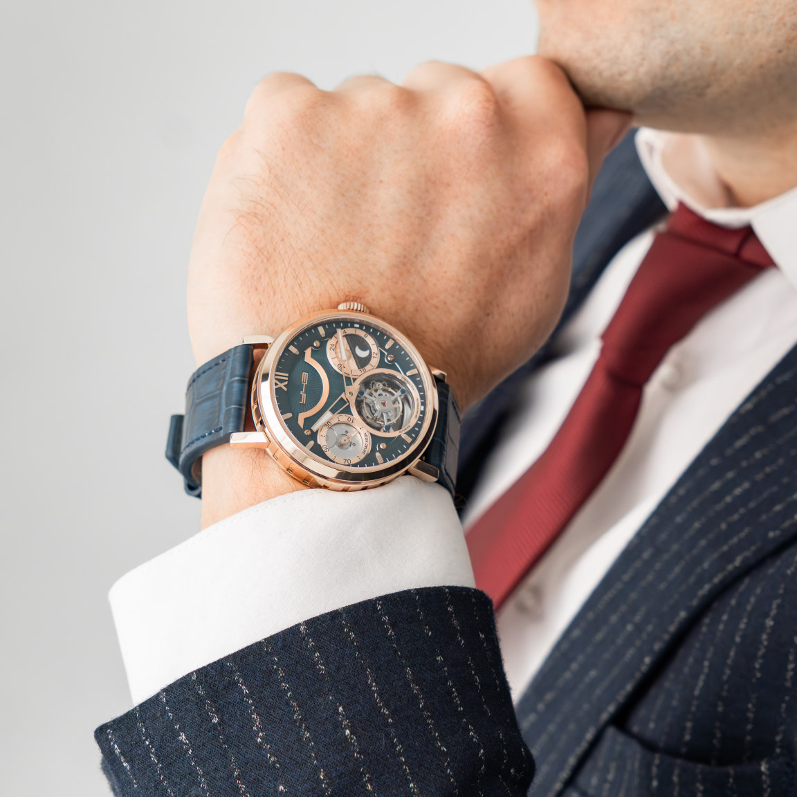 Модель, сочетающая в себе сложную механику, премиальные материалы и безупречный дизайн. Корпус из нержавеющей стали 316L диаметром 42.5 мм и толщиной 12.3 мм представляет собой мастерскую работу с металлом. Сочетание зеркальной полировки и тонкого вертикального сатинирования создает сложную игру света, где глянцевые поверхности элегантно контрастируют с матовыми прямоугольными вставками. Взгляд притягивает многоуровневый циферблат из фрезерованного перламутра с рельефными окошками запаса хода (72 ч.) и 24-х часовой шкалой, представленной в виде объемных изображений Солнца и Луны. На последнюю, как и на стрелки, нанесён сверхъяркий люминофор Swiss SuperLuminova. Через апертуру на циферблате открывается вид на парящий турбийон калибра 3415-TM01, а сквозь прозрачную заднюю крышку можно увидеть механизм, украшенный узором «Женевские волны». Часы защищены сапфировым стеклом с антибликовым покрытием и выдерживают давление 3 АТМ. Комфорт обеспечивает кожаный ремешок с текстурой под крокодила, оснащенный быстросъемными штифтами и фирменной раскладывающейся литой пряжкой.
