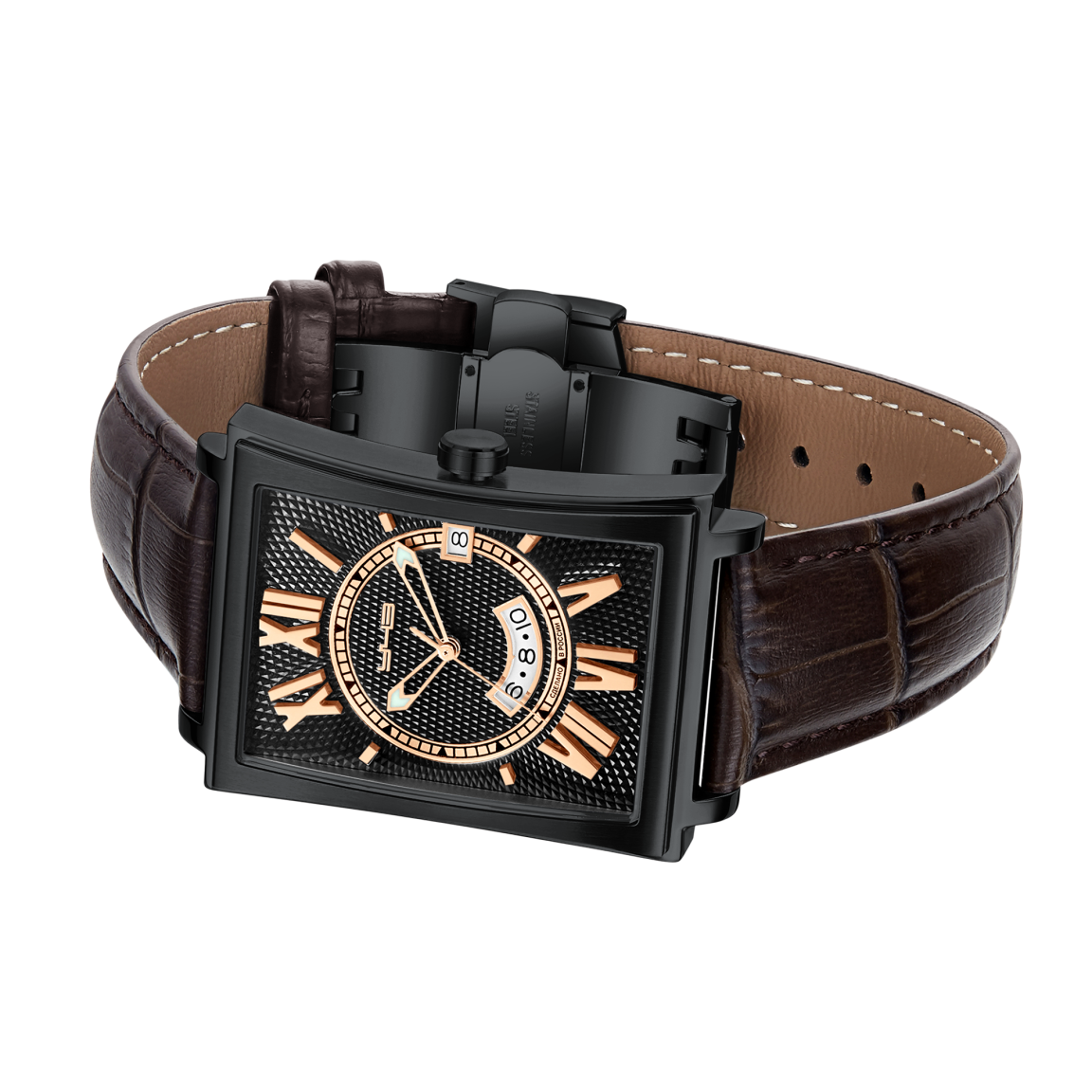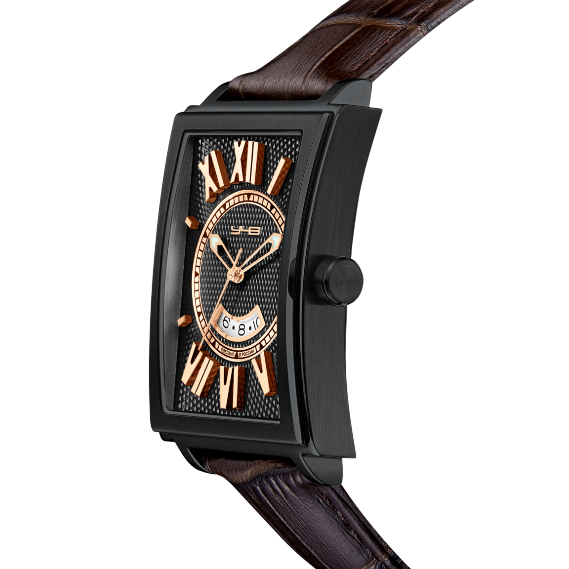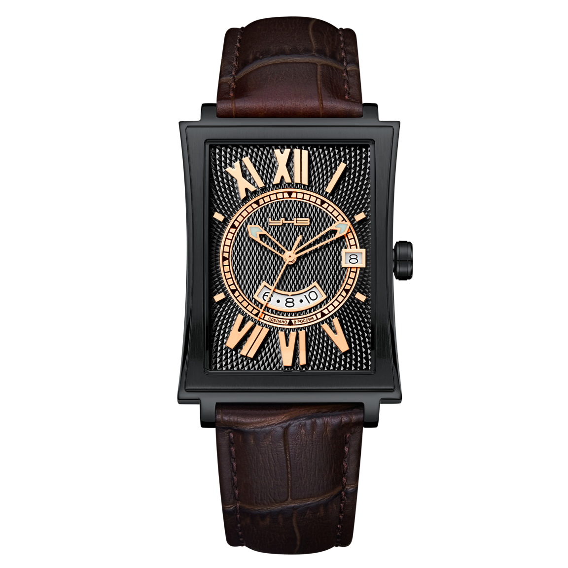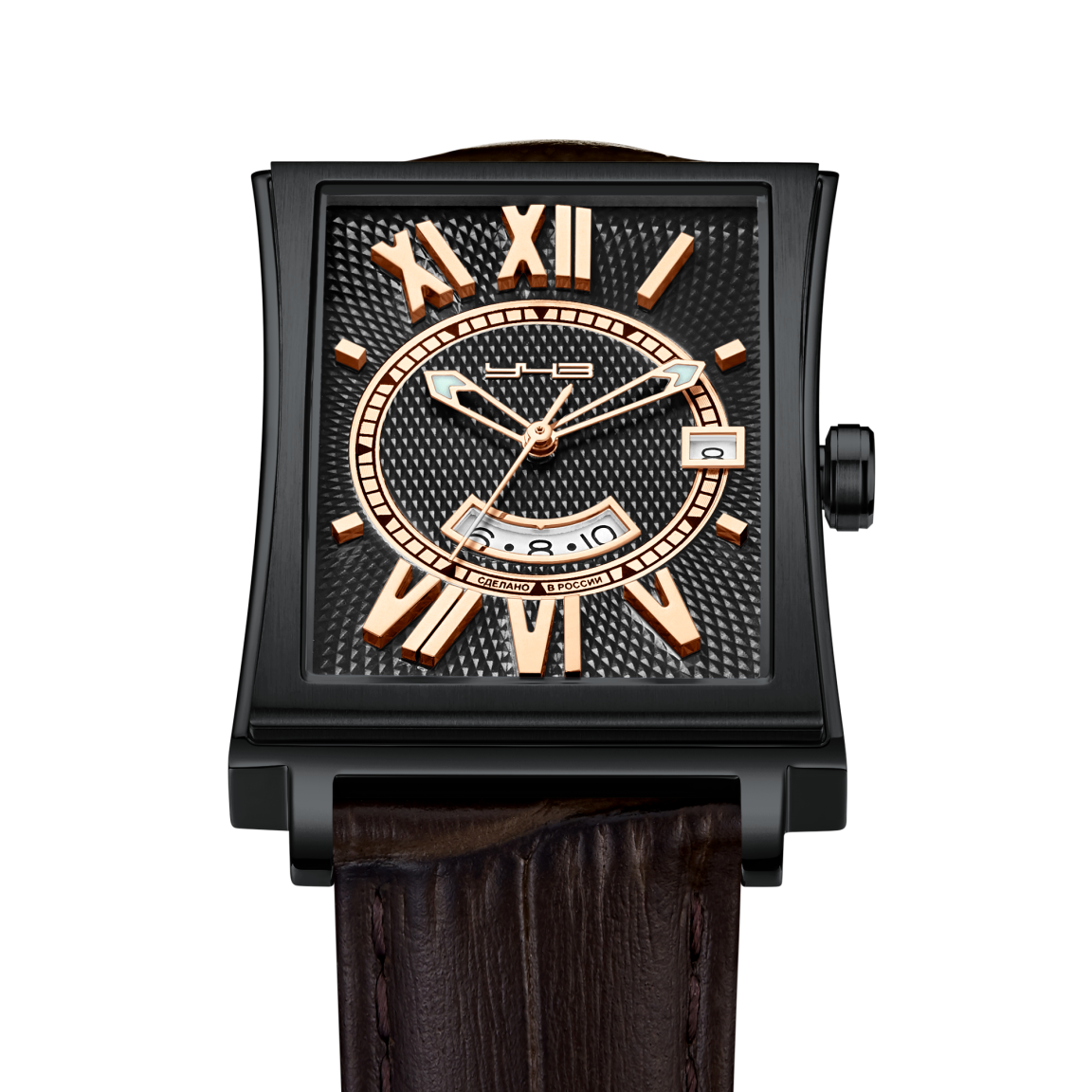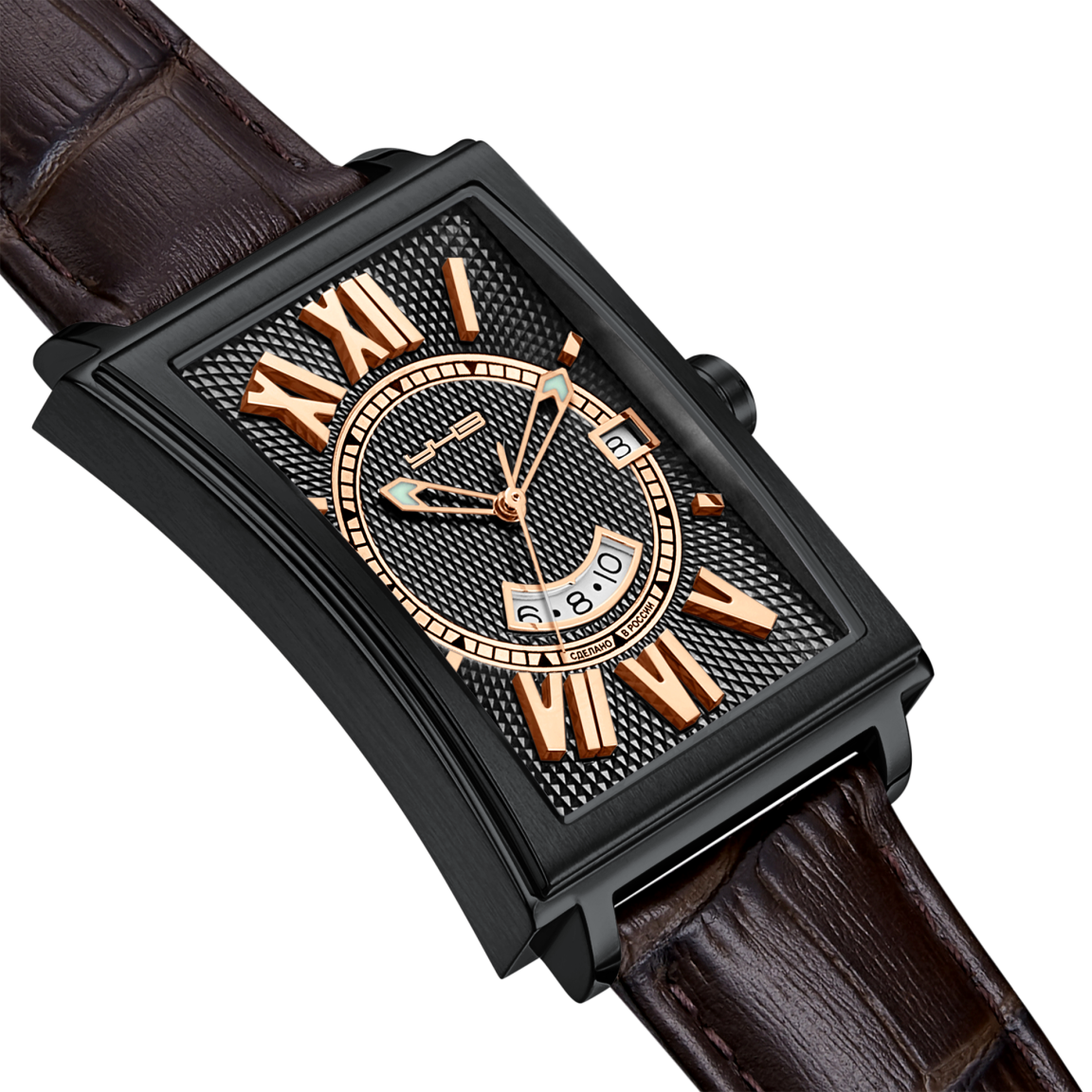 Часы, совместившие в себе изящество и жесткость форм. Дизайнерское решение здесь включает в себя как классические элементы декорирования в виде гильошированных поверхностей и центрального кольца с минутными метками, так и нестандартные решения, такие как объёмные римские цифры, вписанные в окружность, ограниченную прямоугольной формой циферблата. Сочетание полированных и матовых элементов корпуса, а также его вогнутые боковые поверхности создают ощущение утонченности дизайна в целом. Кроме указателя даты, часы также оснащены функцией GMT, что позволяет одновременно отслеживать время в двух часовых поясах. И завершает этот образ элегантный кожаный ремешок с текстурой под кожу крокодила, который добавляет образу статусности. Это аксессуар для тех, кто ценит наследие классических канонов и смелость новаторских решений.