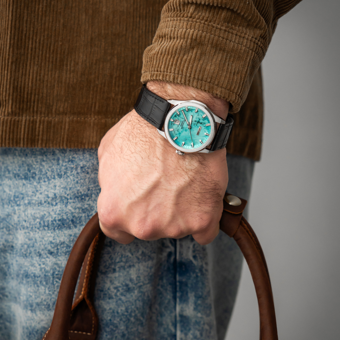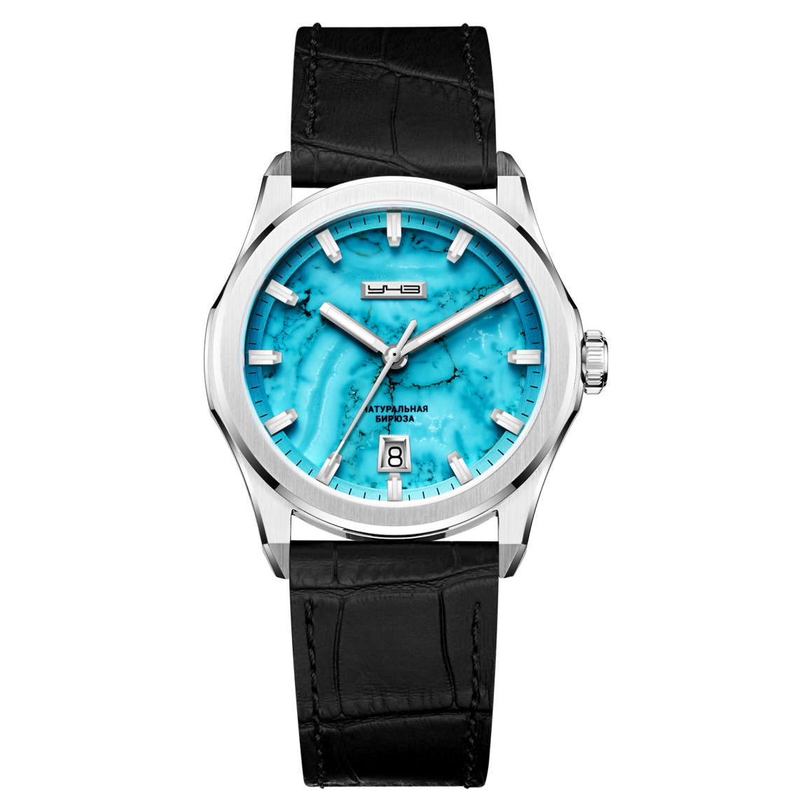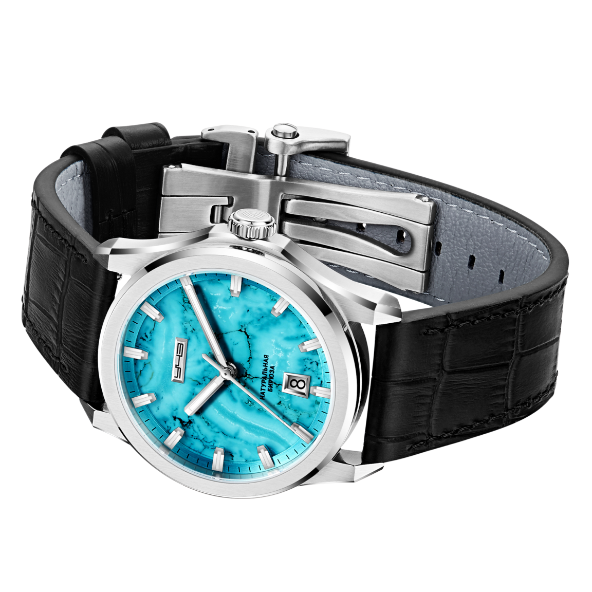 Великолепие камня защищено сапфировым стеклом с антибликовым покрытием и обрамлено корпусом из стали 316L с комбинацией сатинирования и полировки. Высокую читаемость в темноте обеспечивает покрытие Swiss SuperLuminova, а за точный ход отвечает автоматический механизм Miyota 9015, чью работу и искусно декорированный ротор видно через прозрачную заднюю крышку. Комплектацию завершает стальной браслет с надежной застежкой-бабочкой или кожаный ремешок с текстурой под крокодила, оснащенный быстросъемными штифтами и фирменной раскладывающейся литой пряжкой. Водозащита 5 АТМ делают эту модель готовой к ежедневному использованию. Это часы для тех, чье время имеет свой, неповторимый оттенок.
