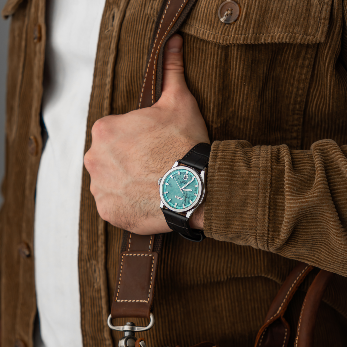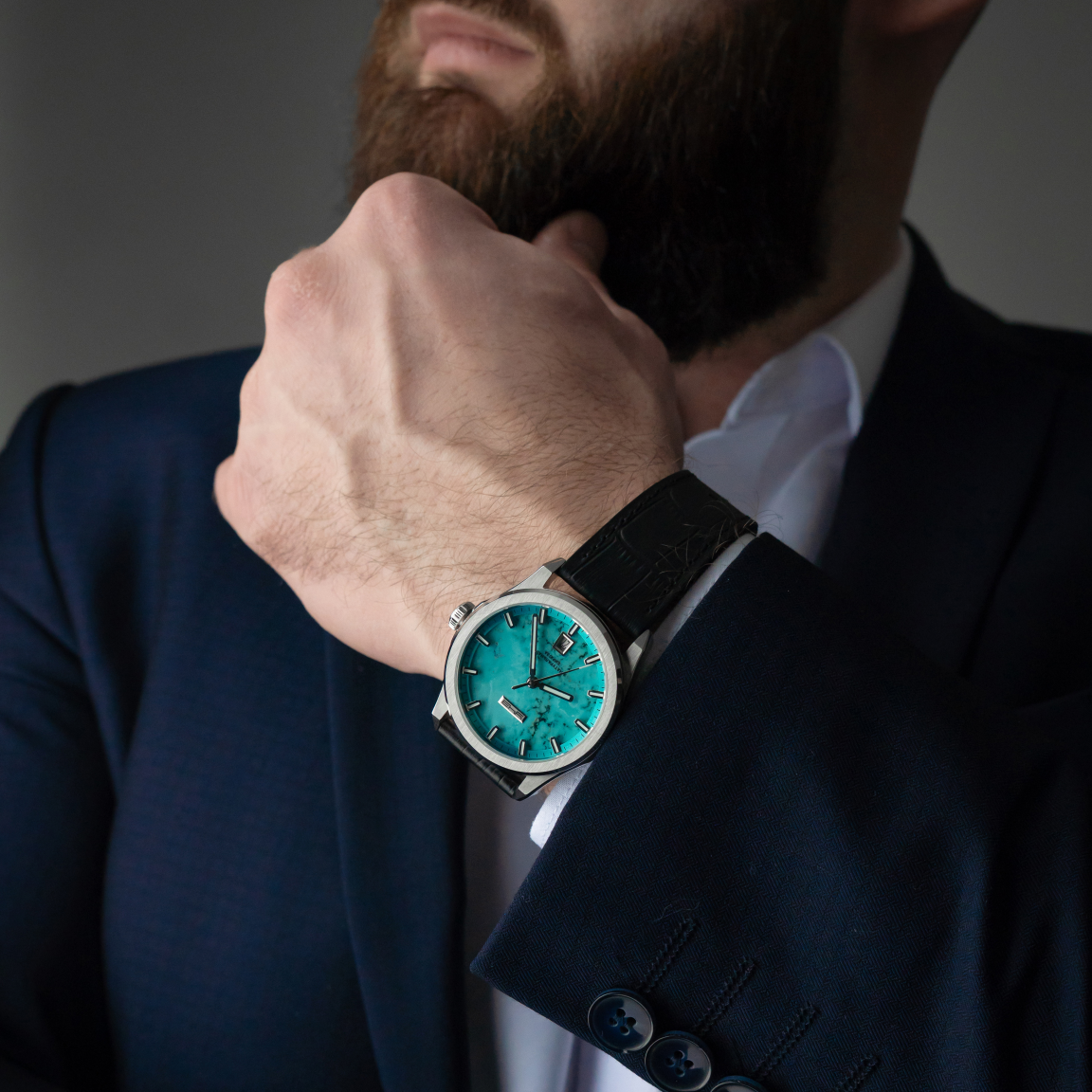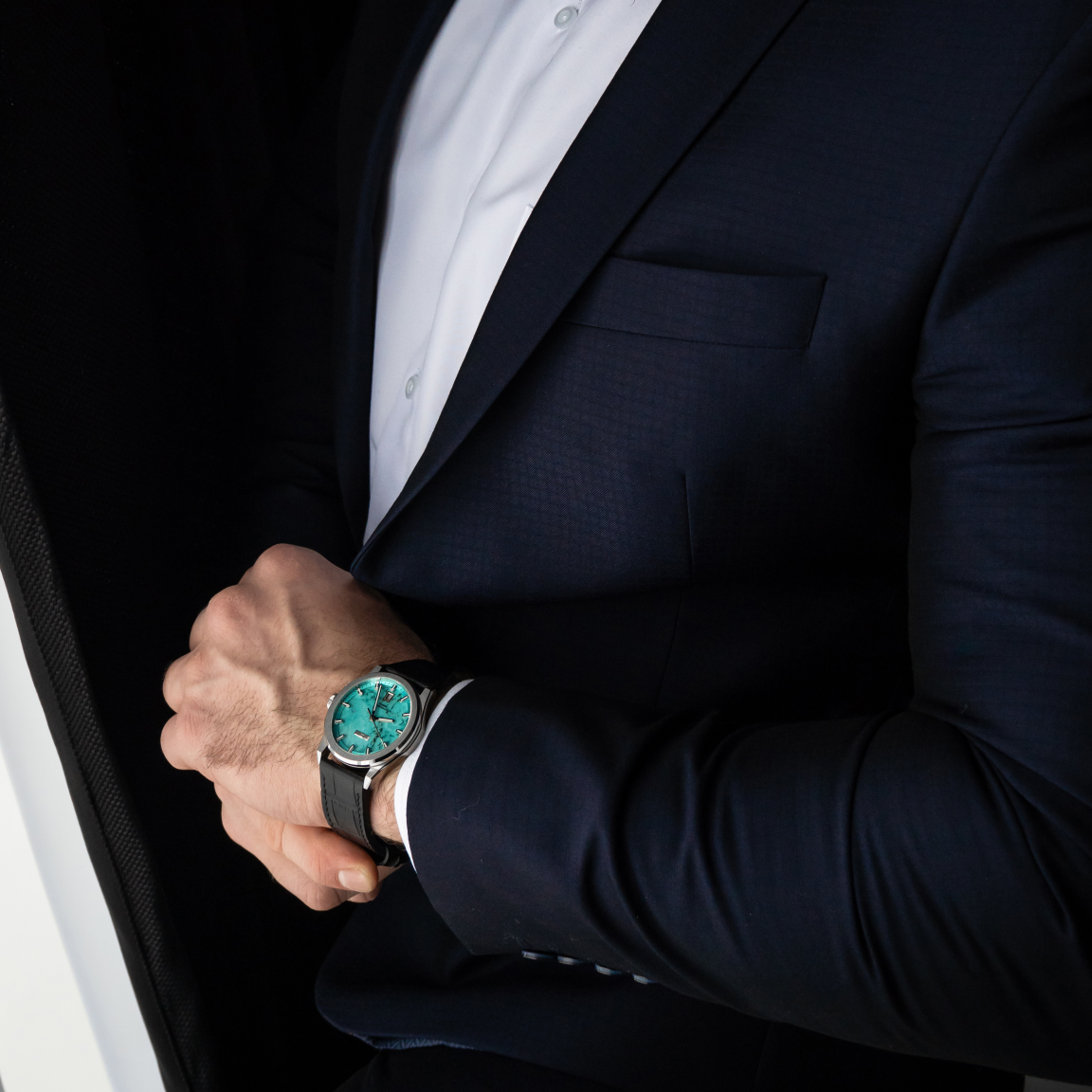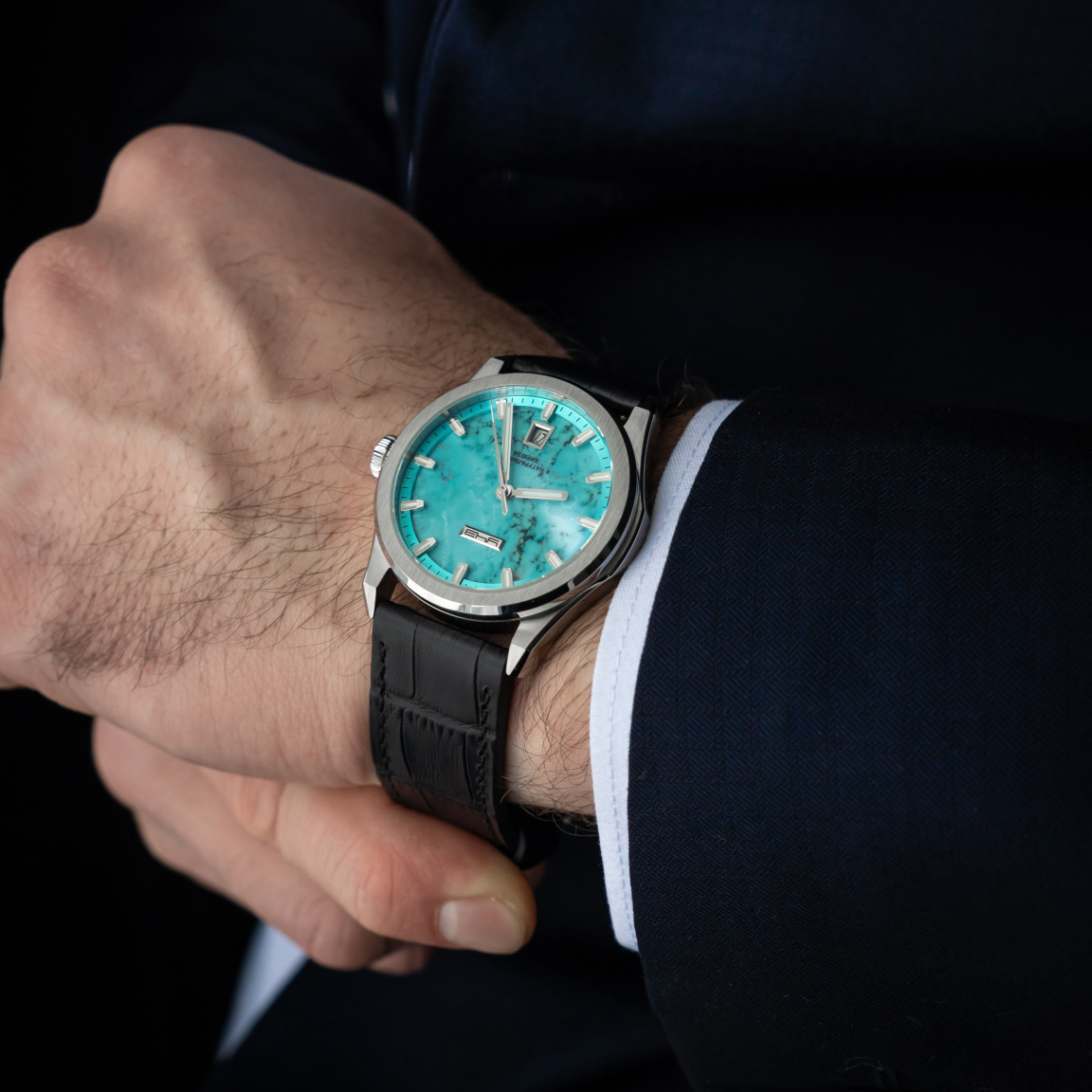 Великолепие камня защищено сапфировым стеклом с антибликовым покрытием и обрамлено корпусом из стали 316L с комбинацией сатинирования и полировки. Высокую читаемость в темноте обеспечивает покрытие Swiss SuperLuminova, а за точный ход отвечает автоматический механизм Miyota 9015, чью работу и искусно декорированный ротор видно через прозрачную заднюю крышку. Комплектацию завершает стальной браслет с надежной застежкой-бабочкой или кожаный ремешок с текстурой под крокодила, оснащенный быстросъемными штифтами и фирменной раскладывающейся литой пряжкой. Водозащита 5 АТМ делают эту модель готовой к ежедневному использованию. Это часы для тех, чье время имеет свой, неповторимый оттенок.