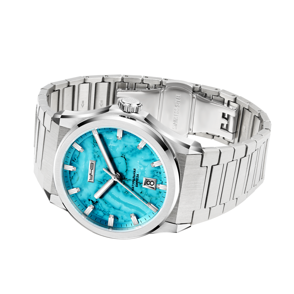 • Корпус изготовлен из высококачественной нержавеющей стали марки 316L. Комбинация горизонтального сатинирования и зеркальной полировки на гранях создает выразительную игру света, а универсальный размер обеспечивает комфортную посадку на запястье. Надежную защиту циферблата и премиальный вид гарантирует сапфировое стекло с антибликовым покрытием.