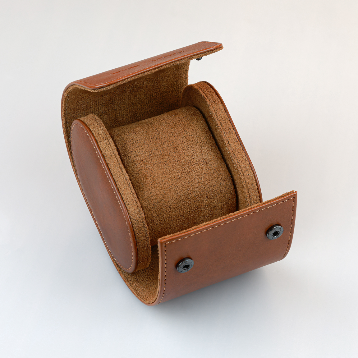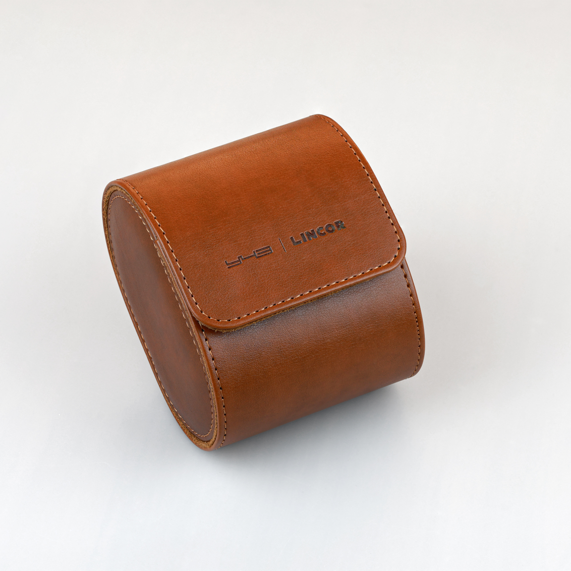 Дорожный футляр для часов из экокожи коричневого цвета с логотипом УЧЗ | Lincor. Отделка бокса и валик для часов изготовлены из мягкой ткани. Благодаря этому приспособлению вы можете перевозить свои любимые часы, не боясь повреждений.