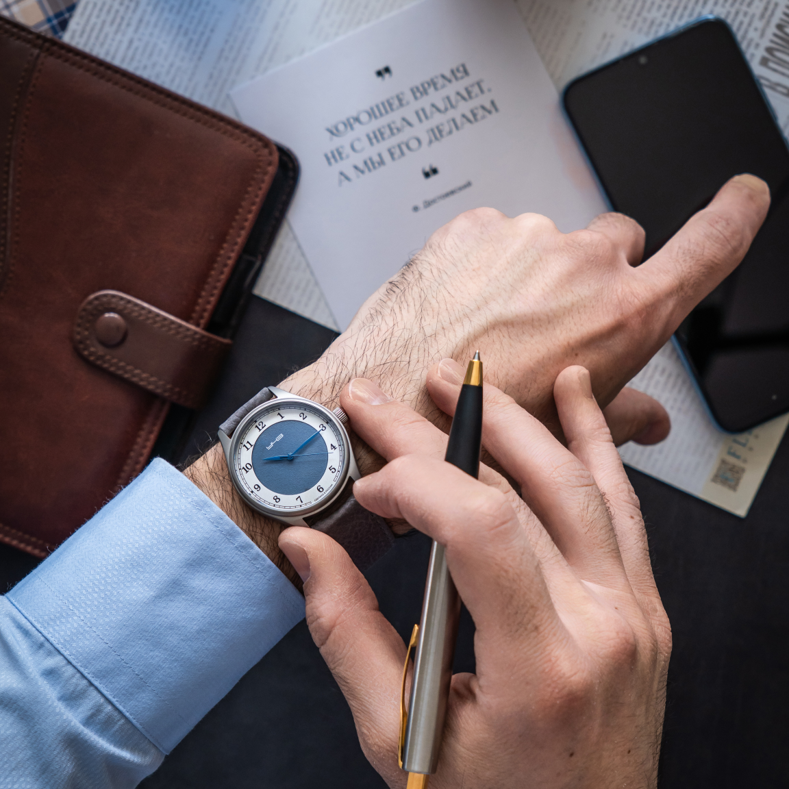 Мужские механические часы, воплощающие баланс инженерной надёжности и стиля. Их корпус из нержавеющей стали 316L представлен в двух вариантах отделки: контрастная комбинация глянцевого безеля с матовым сатинированием боковых поверхностей или цельная матовая фактура, представленная в варианте глубокого асфальтового цвета, достигнутая пескоструйной обработкой. Циферблат с полной арабской оцифровкой по окружности сочетается с выразительной матовой “шершавой” текстурой в центре, обеспечивая превосходную читаемость. Внутри установлен механический калибр ручного завода 2605 на 17 рубиновых камнях, обеспечивая надёжность и точность. Модель обладает водонепроницаемостью 5 АТМ. Комфорт на запястье гарантирует мягкий ремешок из натуральной кожи, идеально гармонирующий с оттенком циферблата.