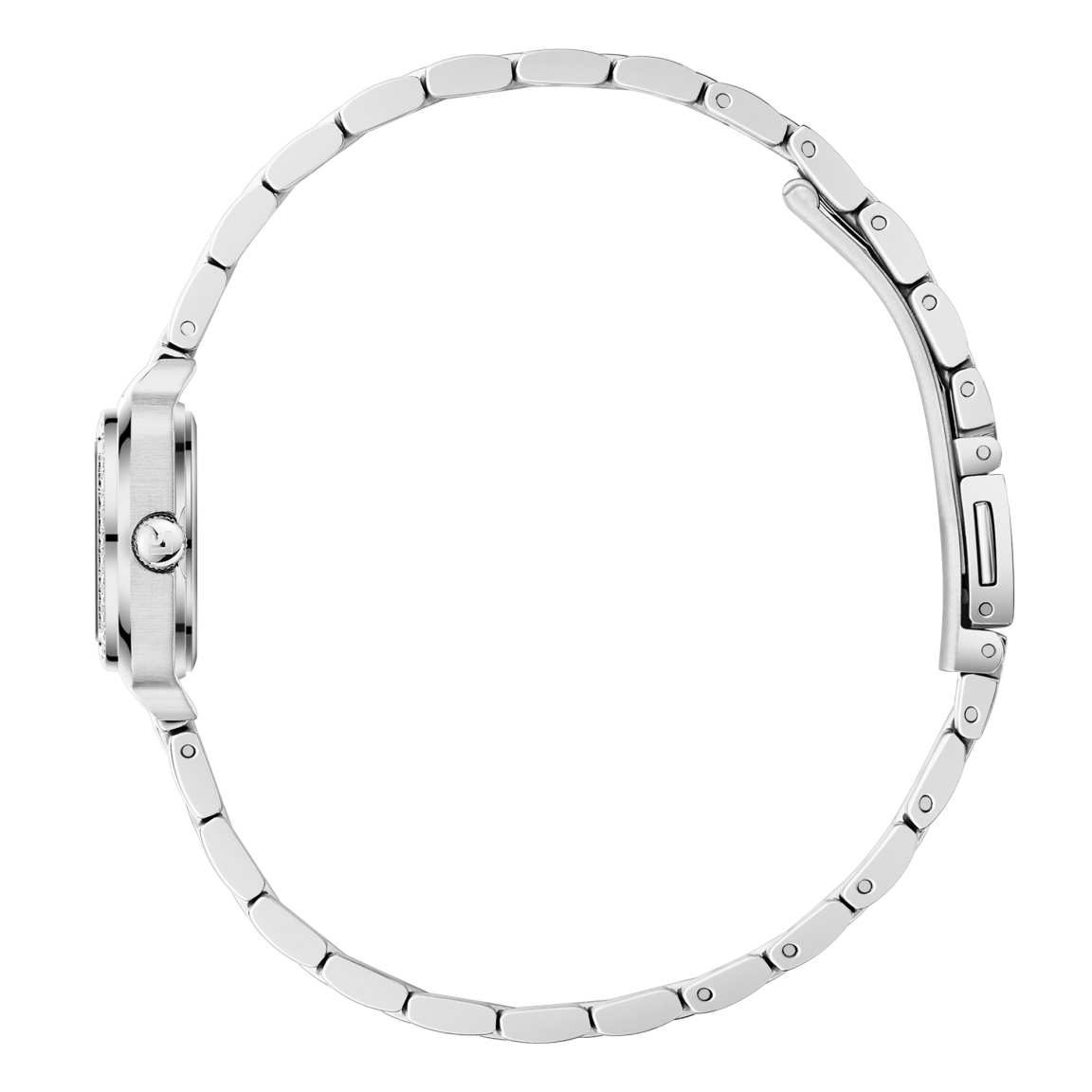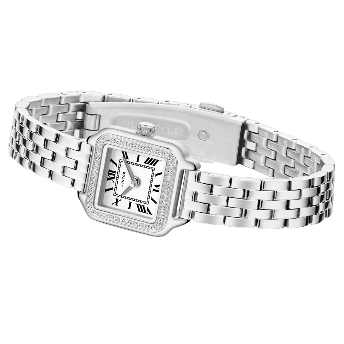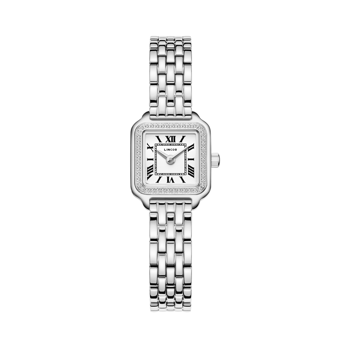Миниатюрный квадратный корпус из полированной стали 316L (19,5х24 мм) по периметру искусно инкрустирован фианитами. Сапфировое стекло надежно защищает циферблат, где строгие римские цифры создают идеальный контраст. Внутри бьется точный японский кварцевый механизм, а стальной браслет с застежкой-бабочкой мягко обхватывает запястье. Водозащита 3 АТМ позволяет не беспокоиться о случайных брызгах, делая эту модель не просто украшением, а верным компаньоном в ритме большого города.