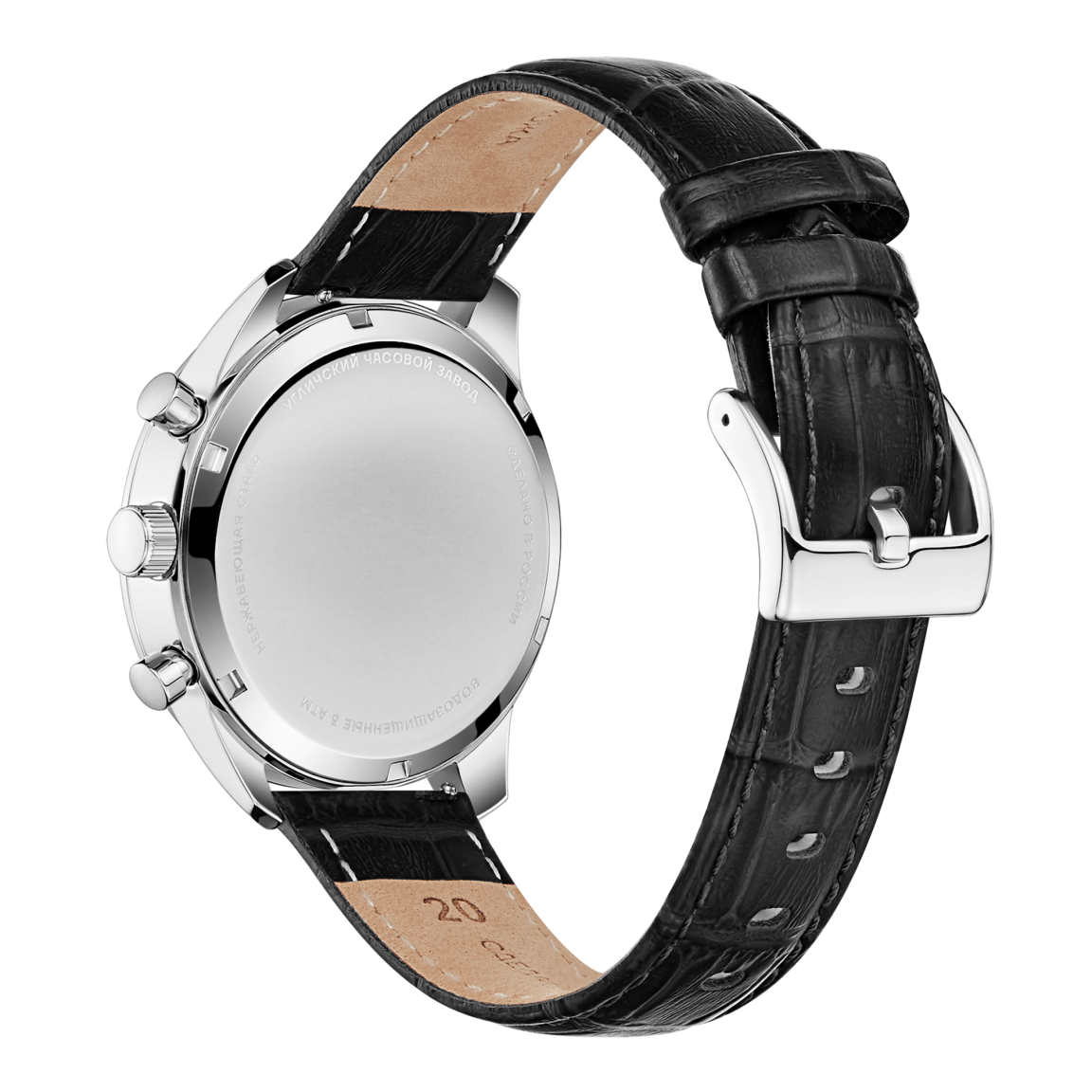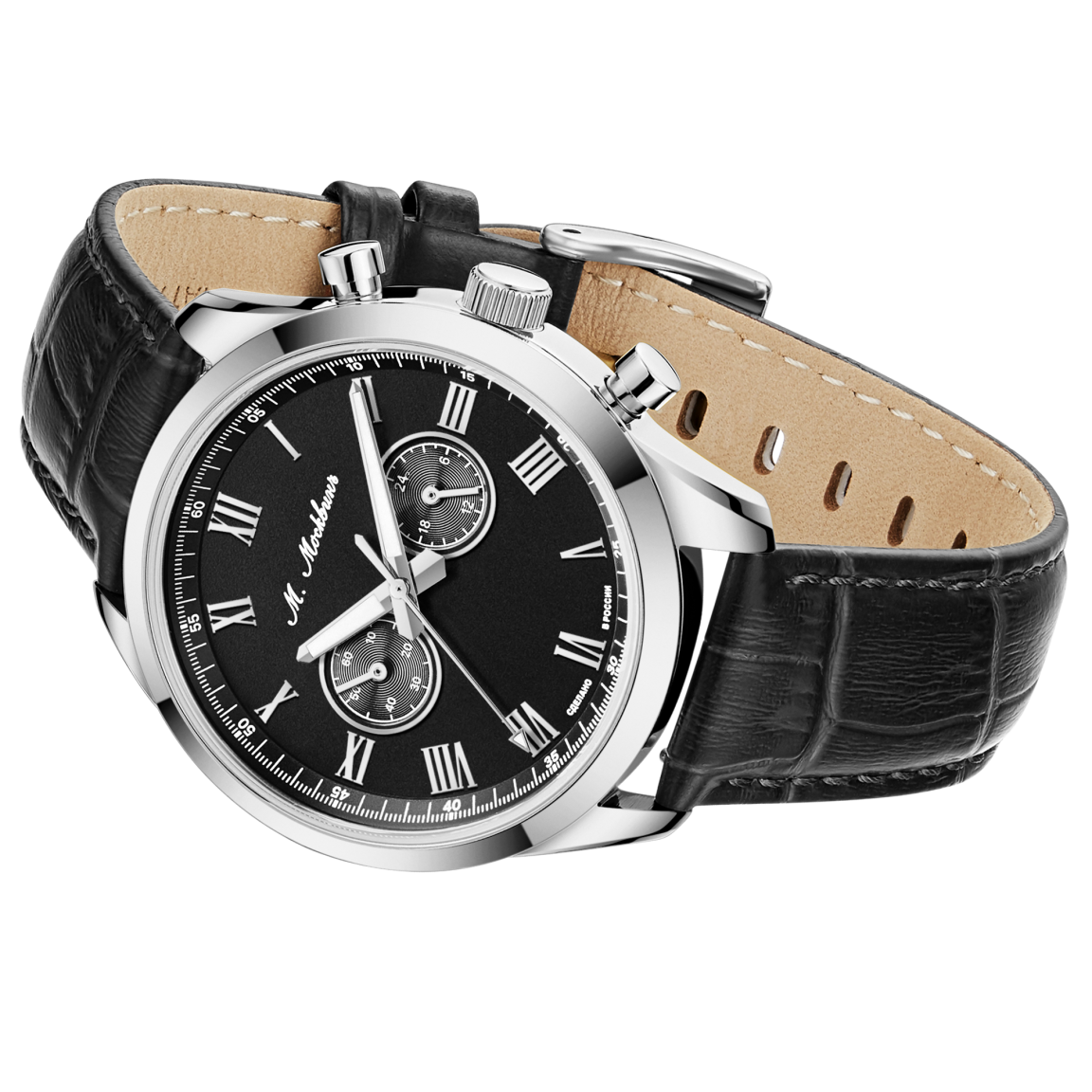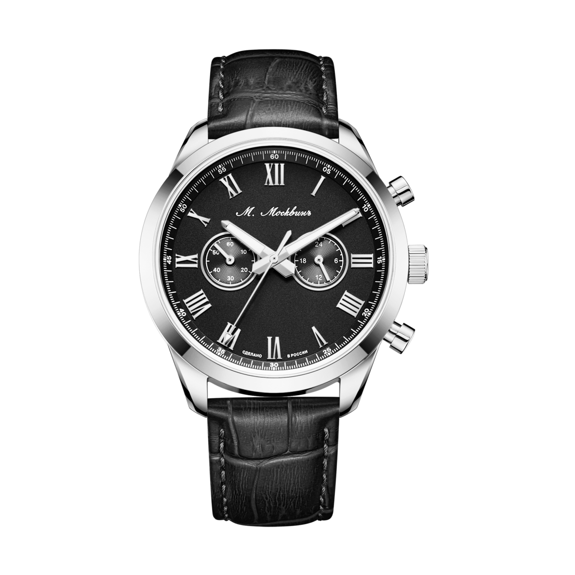 Циферблат, заключенный в стальной корпус диаметром 41 мм., украшен строгой римской нумерацией и лаконичными окошками хронографа, а стрелки с покрытием Super-LumiNova обеспечивают безупречную читаемость в темноте. Внутри скрывается высокоточный японский кварцевый механизм, гарантирующий бескомпромиссную надежность. Водозащита 5 АТМ защищает модель от дождя и случайных брызг. Завершает образ ремешок из натуральной кожи с тиснением под аллигатора: быстросъемные штифты позволяют менять его за секунды, подстраивая часы под любой дресс-код. Тыльная сторона корпуса станет идеальным холстом для памятной гравировки, превращая часы в по-настоящему уникальный аксессуар или значимый подарок.