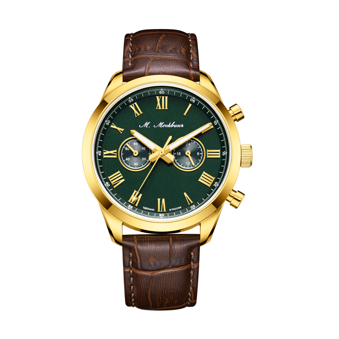 Циферблат, заключенный в стальной корпус диаметром 41 мм., украшен строгой римской нумерацией и лаконичными окошками хронографа, а стрелки с покрытием Super-LumiNova обеспечивают безупречную читаемость в темноте. Внутри скрывается высокоточный японский кварцевый механизм, гарантирующий бескомпромиссную надежность. Водозащита 5 АТМ защищает модель от дождя и случайных брызг. Завершает образ ремешок из натуральной кожи с тиснением под аллигатора: быстросъемные штифты позволяют менять его за секунды, подстраивая часы под любой дресс-код. Тыльная сторона корпуса станет идеальным холстом для памятной гравировки, превращая часы в по-настоящему уникальный аксессуар или значимый подарок.