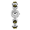 • Миниатюрный 22-мм корпус, украшенный дорожками переливающихся фианитов дополняет золотистый циферблат с нежными узорами и тонкими стрелками.