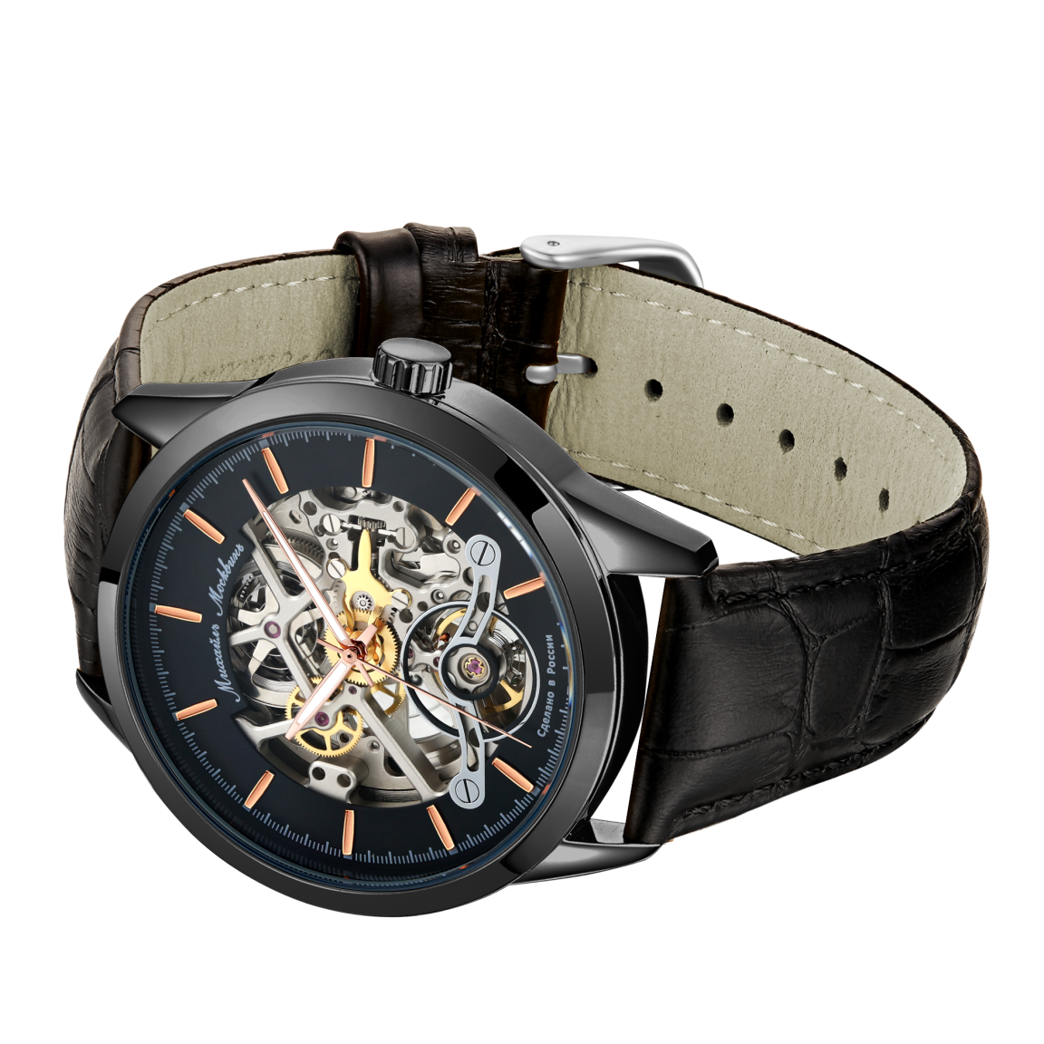 Выразительный дизайн серии скелетонов по достоинству оценят любители индустриального стиля. В лаконичный 42-мм корпус встроен высокоточный механизм с автоподзаводом с запасом хода 35 часов, за работой которого можно наблюдать сквозь сапфировое стекло циферблата и заднюю крышку часов.