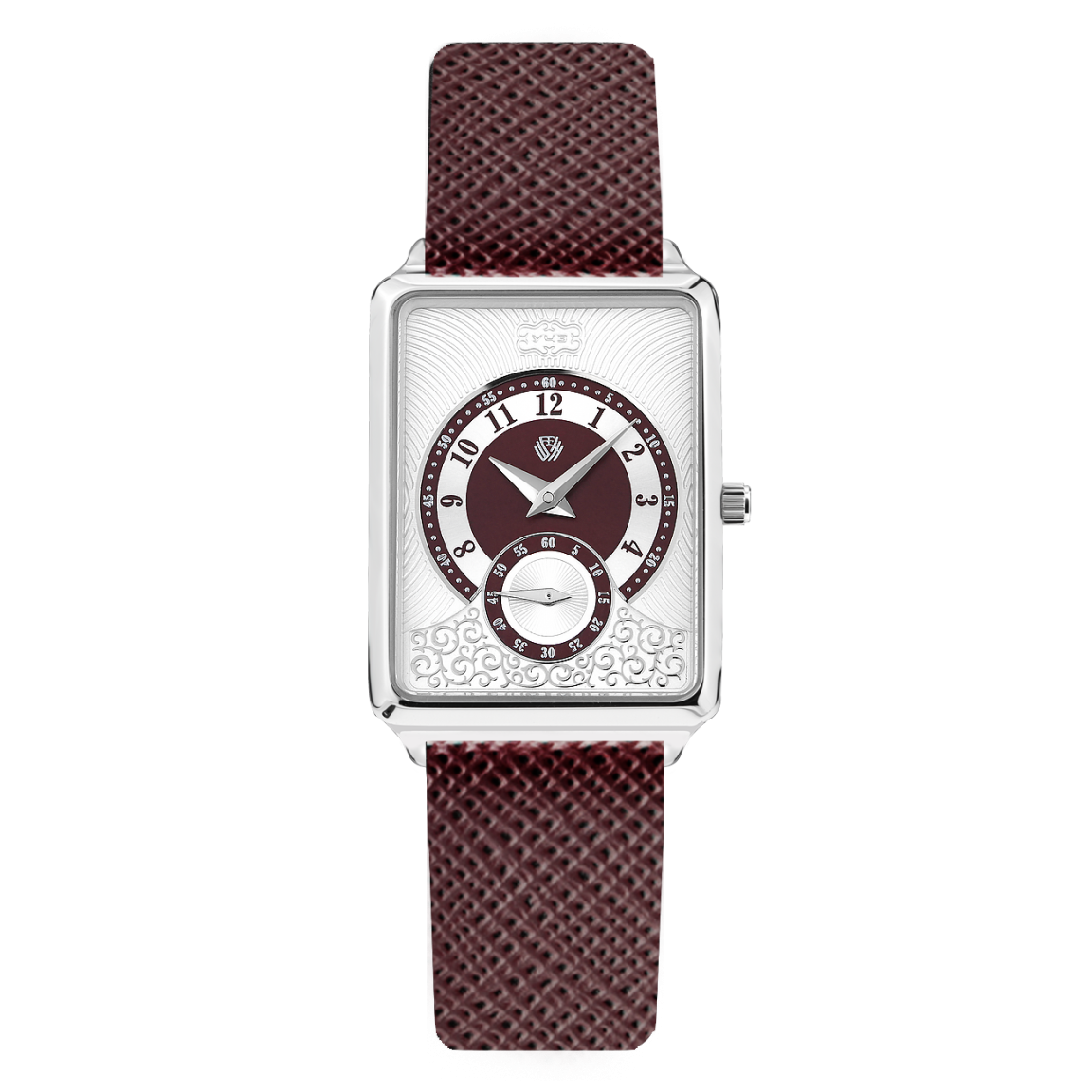 Строгость и элегантность две доминанты воплощенные в новой женской коллекции «Винтаж». В прямоугольный корпус из нержавеющей стали установлен трехмерный циферблат. Рельефные линии, радиально расходящиеся в разном направлении, увенчаны объемным выгравированным логотипом компании. Вынесенная секундная стрелка обрамлена виньетированным орнаментом, композиционно напоминающим классические настольные часы. Арабская оцифровка усиливает считываемость показаний, а надежный японский кварцевый механизм позволяет точно определять время. Завершает образ модели рельефный ремешок из итальянской кожи, выполненный в одной цветовой гамме с циферблатом.