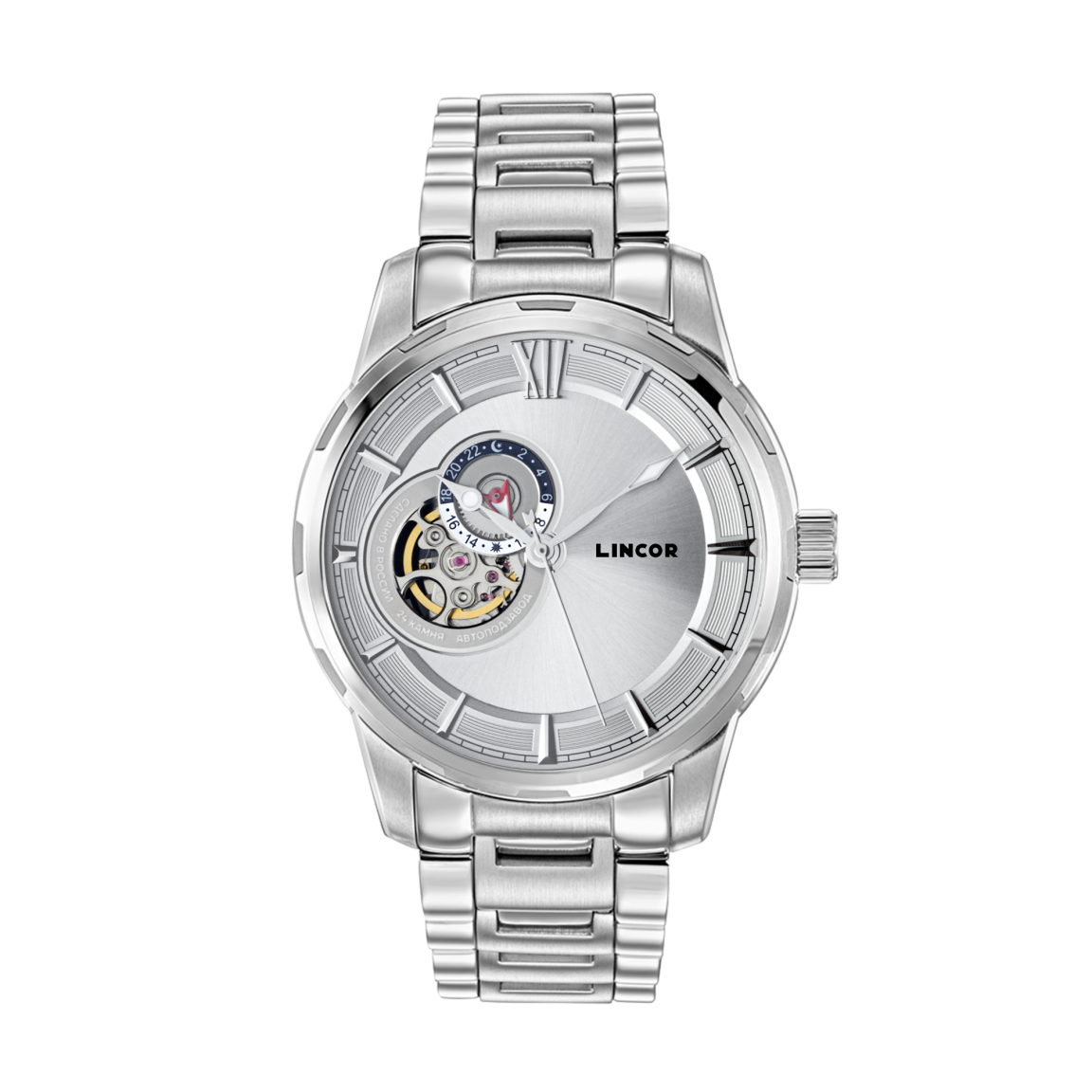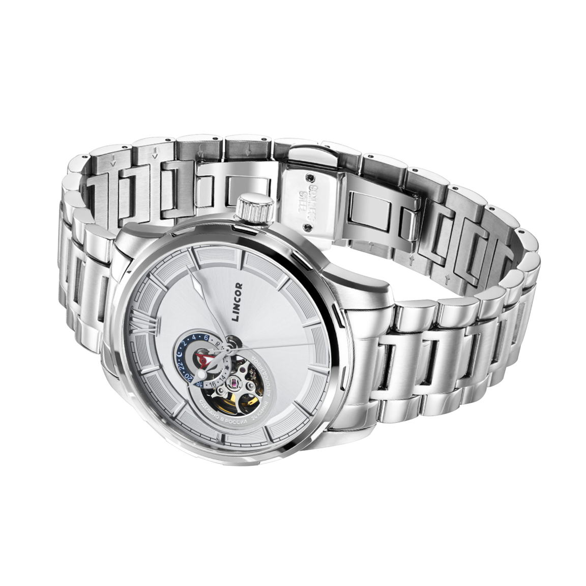 Лаконичная мужская модель часов, которая станет отличным дополнением повседневного или делового образа. В 42 миллиметровый корпус из нержавеющей стали установлено устойчивое к появлению царапин сапфировое стекло. Циферблат, выполненный по технологии Sunray (солнечные лучи), дополнен 24-х часовой шкалой, фигурными стрелками с люминесцентным покрытием и окошком, сквозь которое открывается вид на завораживающую работу надёжного механического механизма с функцией автоподзавода и запасом хода 35 ч. Модель оснащена стальным браслетом с удобной застёжкой-бабочкой.