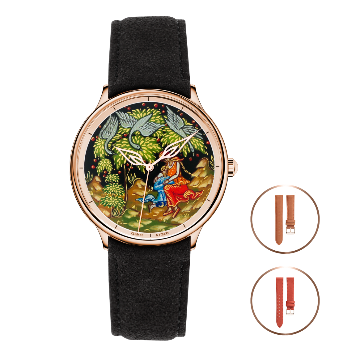 Циферблаты 12 моделей вручную расписаны художниками в технике палехской лаковой миниатюры, а в основе сюжетов лежат русские сказки – нематериальное наследие нашей страны. Узоры палехской росписи переносят нас в мир славянской культуры.