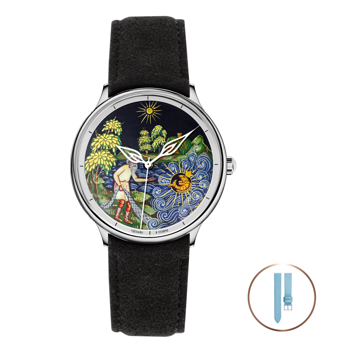 Углич – наша малая родина, город на реке времени, и символика дюжины – 12 часов, 12 месяцев, 12 городов Ярославии, показалась нам интересной для коллекции, специально созданной в честь года народного искусства. Течение времени гармонично вписывается в бесконечную череду времен года. Циферблаты 12 моделей вручную расписаны художниками в технике палехской лаковой миниатюры. На сюжеты для росписи нас вдохновило нематериальное наследие нашей страны – русские сказки и народные промыслы Золотого кольца. Благодаря филигранной работе художника классические часы превратились в настоящее произведение искусства.