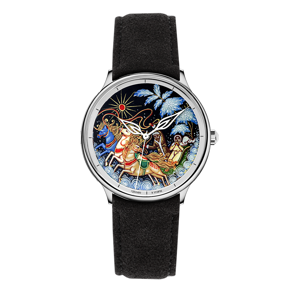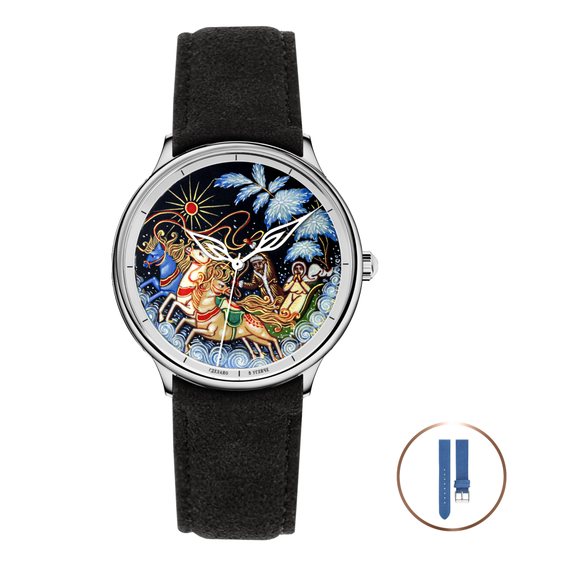Циферблаты 12 моделей вручную расписаны художниками в технике палехской лаковой миниатюры, а в основе сюжетов лежат русские сказки – нематериальное наследие нашей страны. Узоры палехской росписи переносят нас в мир славянской культуры.