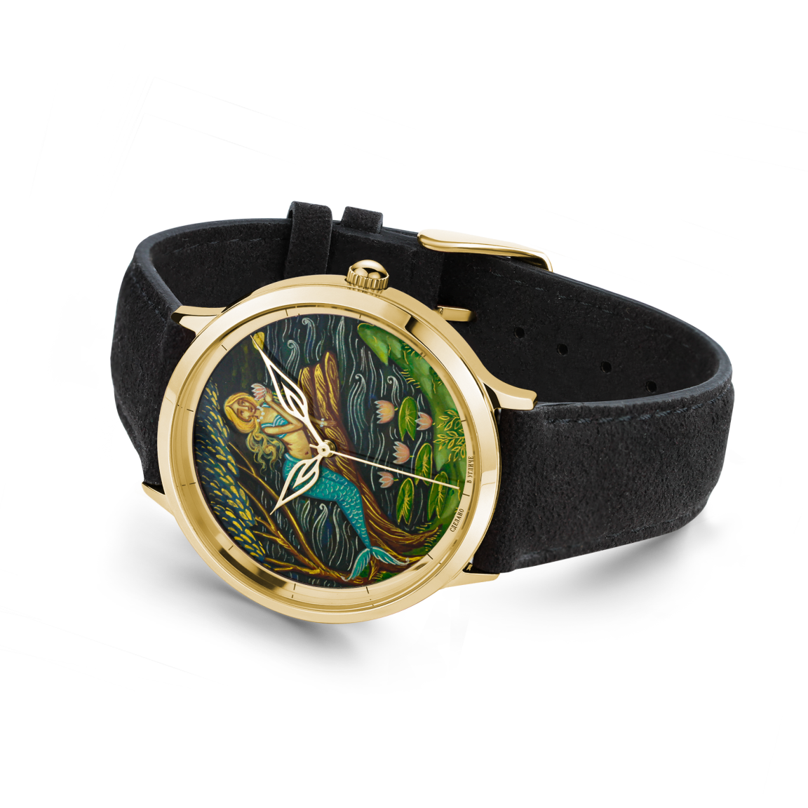 Углич – наша малая родина, город на реке времени, и символика дюжины – 12 часов, 12 месяцев, 12 городов Ярославии, показалась нам интересной для коллекции, специально созданной в честь года народного искусства. Течение времени гармонично вписывается в бесконечную череду времен года. Циферблаты 12 моделей вручную расписаны художниками в технике палехской лаковой миниатюры. На сюжеты для росписи нас вдохновило нематериальное наследие нашей страны – русские сказки и народные промыслы Золотого кольца. Благодаря филигранной работе художника классические часы превратились в настоящее произведение искусства.