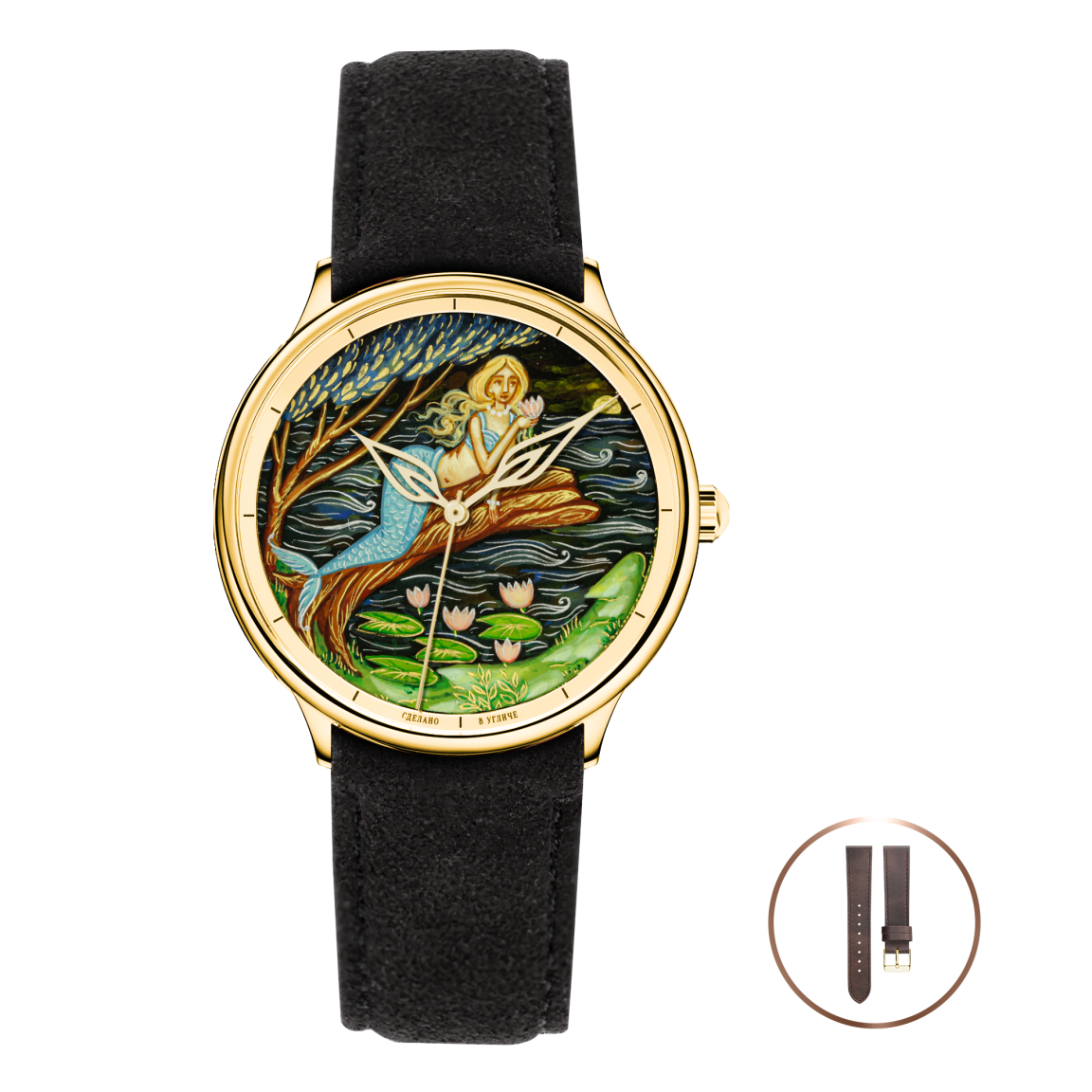Циферблаты 12 моделей вручную расписаны художниками в технике палехской лаковой миниатюры, а в основе сюжетов лежат русские сказки – нематериальное наследие нашей страны. Узоры палехской росписи переносят нас в мир славянской культуры.