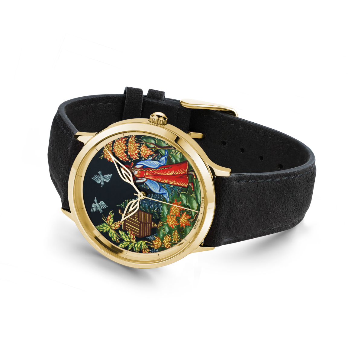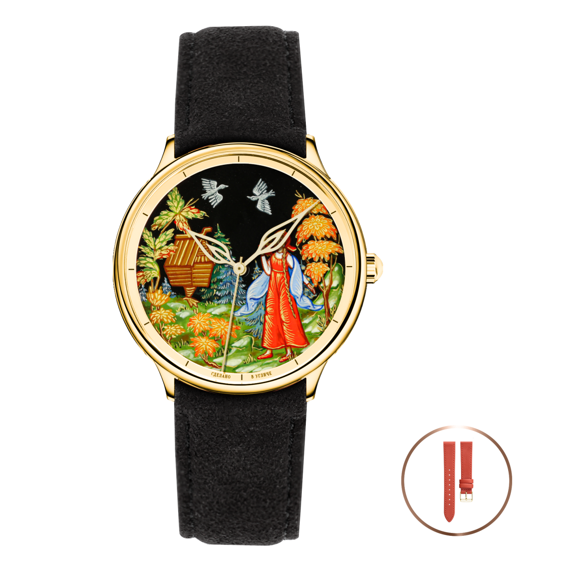 Циферблаты 12 моделей вручную расписаны художниками в технике палехской лаковой миниатюры, а в основе сюжетов лежат русские сказки – нематериальное наследие нашей страны. Узоры палехской росписи переносят нас в мир славянской культуры.