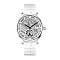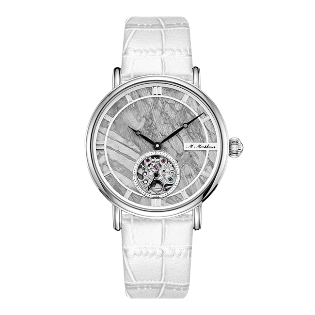 “Космический скелетон” сочетает в себе холодное сияние стали с рисунком циферблата, изготовленного из фрагмента метеорита. Часть циферблата открывает взгляду работу декорированного механического механизма с автоподзаводом. Дополняет необычный облик 41-мм корпуса и браслет в виде “миланской кольчуги”.
