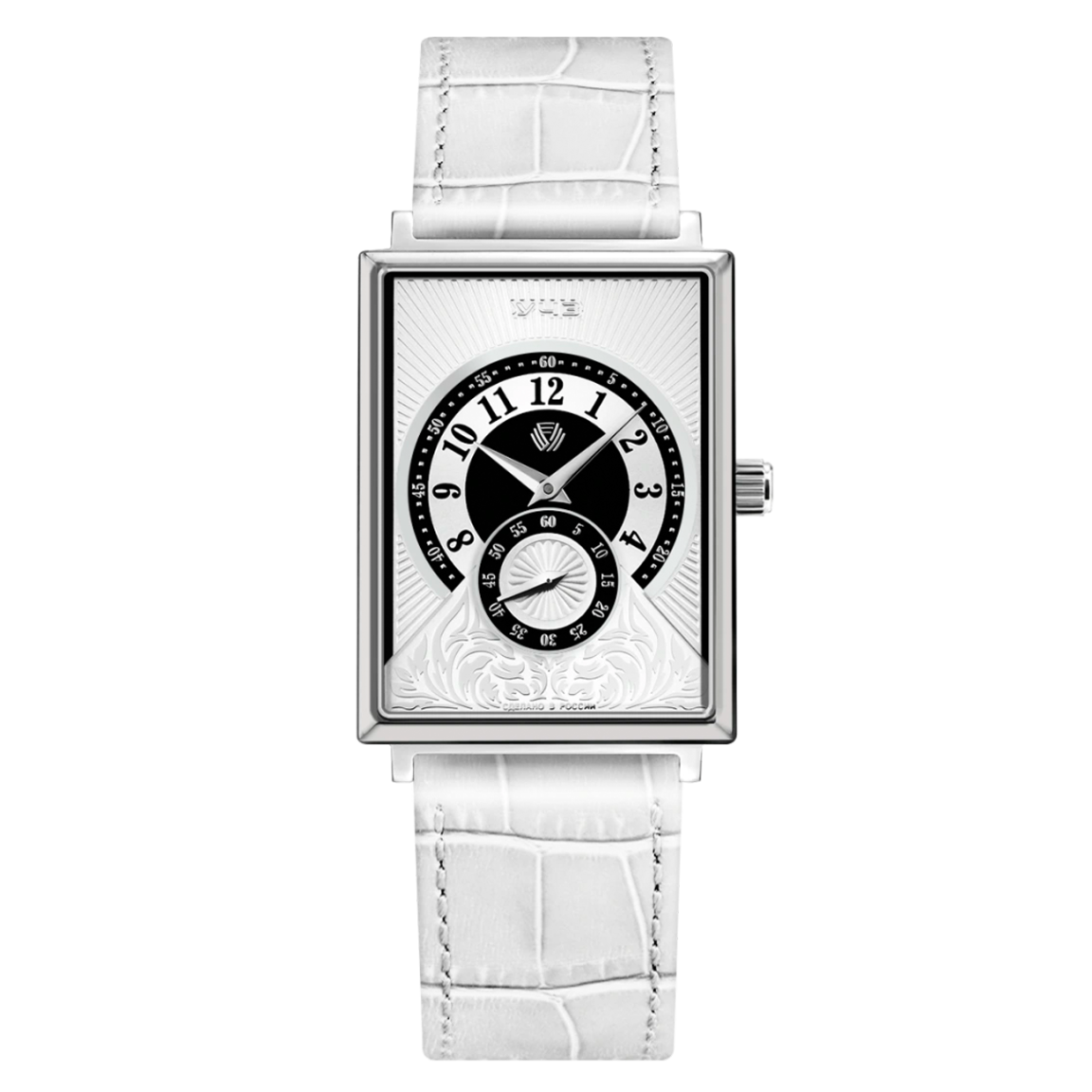 В прямоугольный стальной корпус установлен рельефный циферблат, благодаря чему создаётся удивительная игра света. Дизайн модели сочетает в себе строгость радиальных линий, расходящихся от часового круга подобно лучам солнца, с мягкостью арабских цифр и растительного орнамента, обрамляющего вынесенную секундную стрелку, тем самым композиционно напоминая стиль классических каминных часов. Завершающим штрихом модели является ремешок из натуральной кожи, выполненный в одной цветовой гамме с циферблатом.